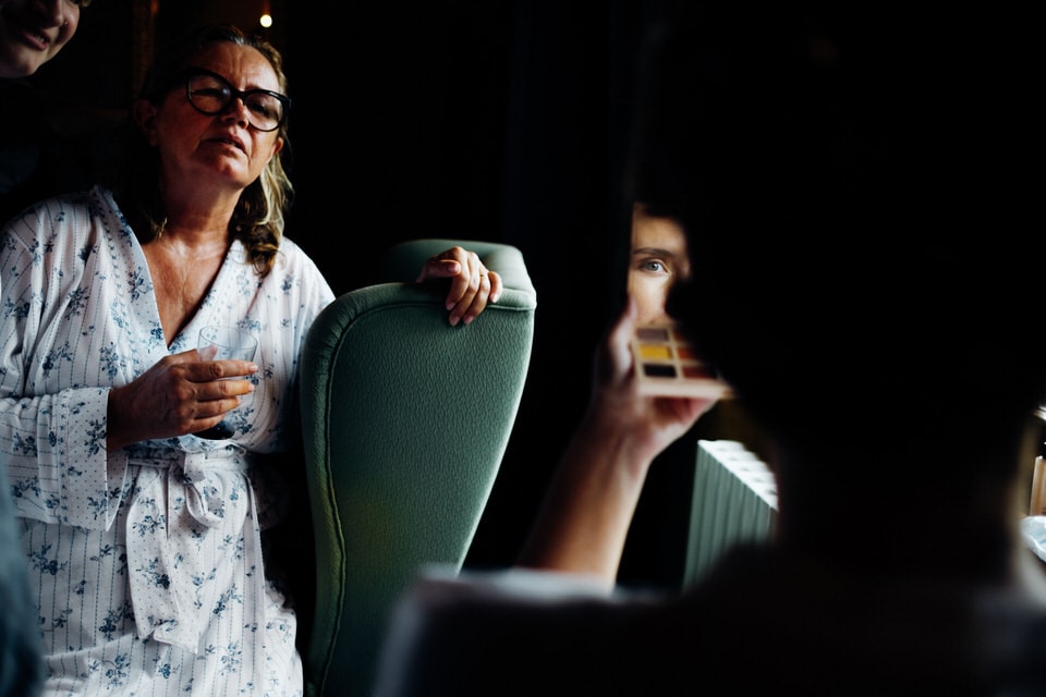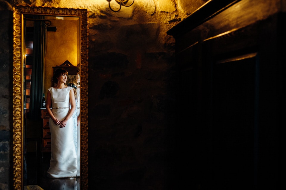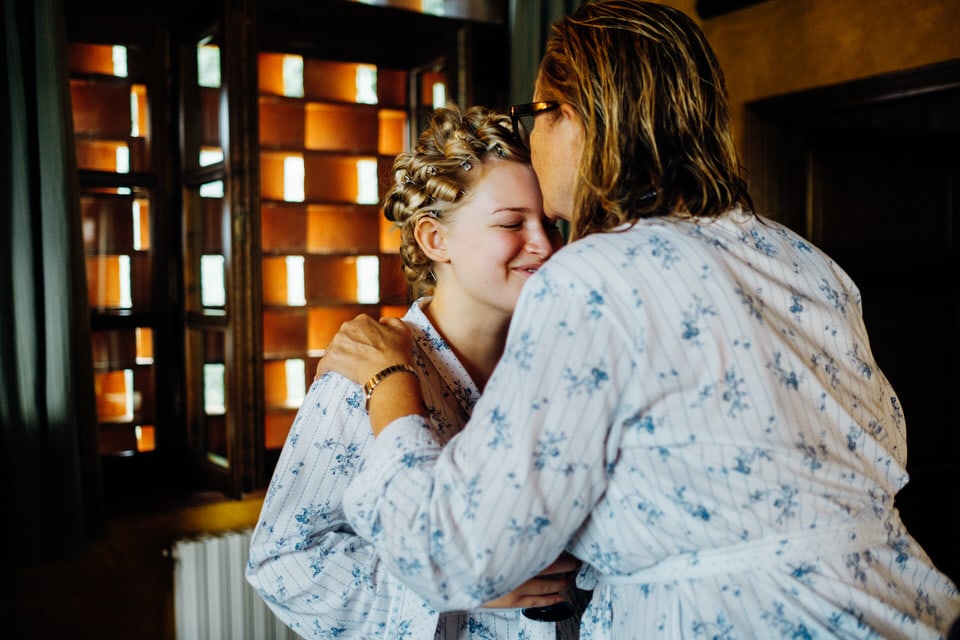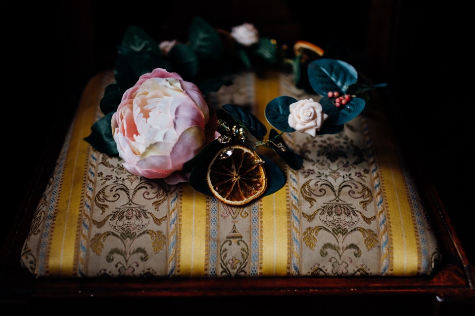 The couple got ready in different areas of I Cedri, including a stunning red brick villa that overlooked the Tuscan mountains. Before the ceremony they opted to do a first look so they could share the moment of first seeing each other in private. Amazingly a thunderstorm was raging throughout the prep time, which added some exciting drama to getting ready! The bride had handmade flower crowns for her sisters/bridesmaids, decorated with oranges and matching her own incredible giant bouquet.