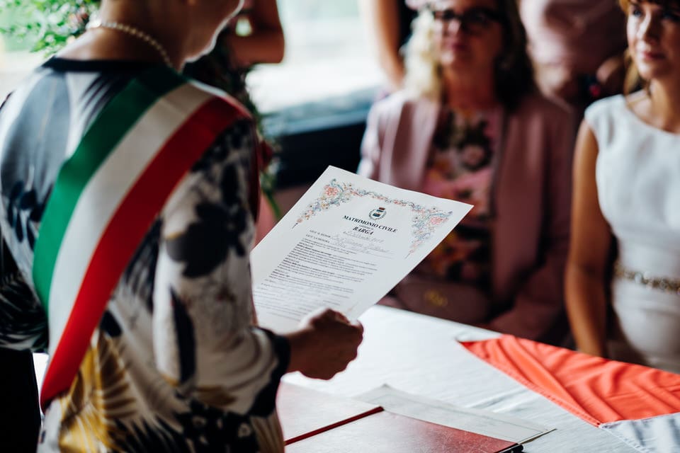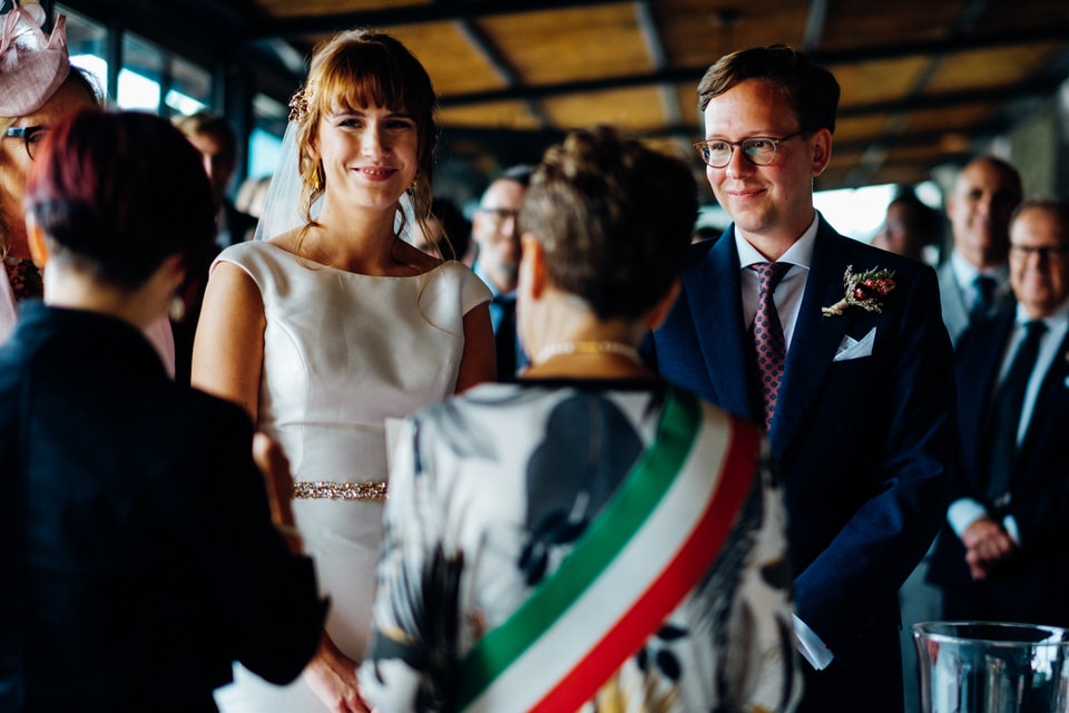 It was only the third time ever that the venue had to hold the ceremony indoors due to the rain, but the couple graciously rolled with the weather limitations and had their Italian civil ceremony conducted in a beautiful glasshouse. They also received a gift of silver plates with their names and dates engraved, which apparently is custom in the region!