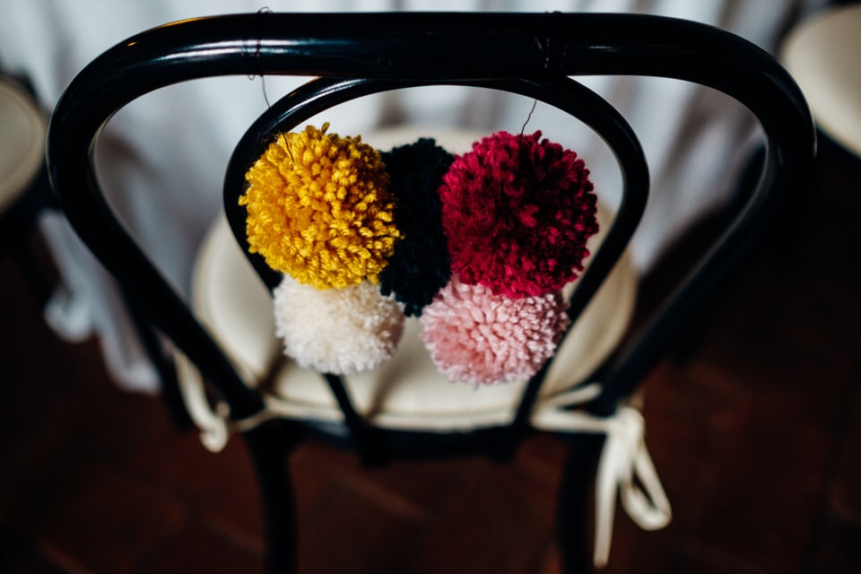The couple got their family to help them DIY their wedding decor- they had home made pom pom strings tied to the back of every chair