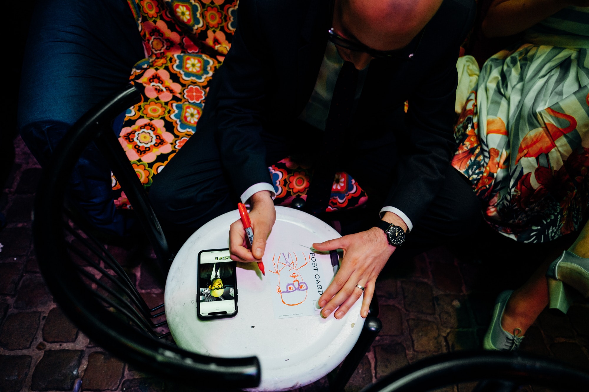 Janine changed into a stunning gold evening gown, complete with Adidas trainers that matched her chief bridesmaid’s Adidas shoes! Their guest book asked their guests to draw a self portrait on a postcard