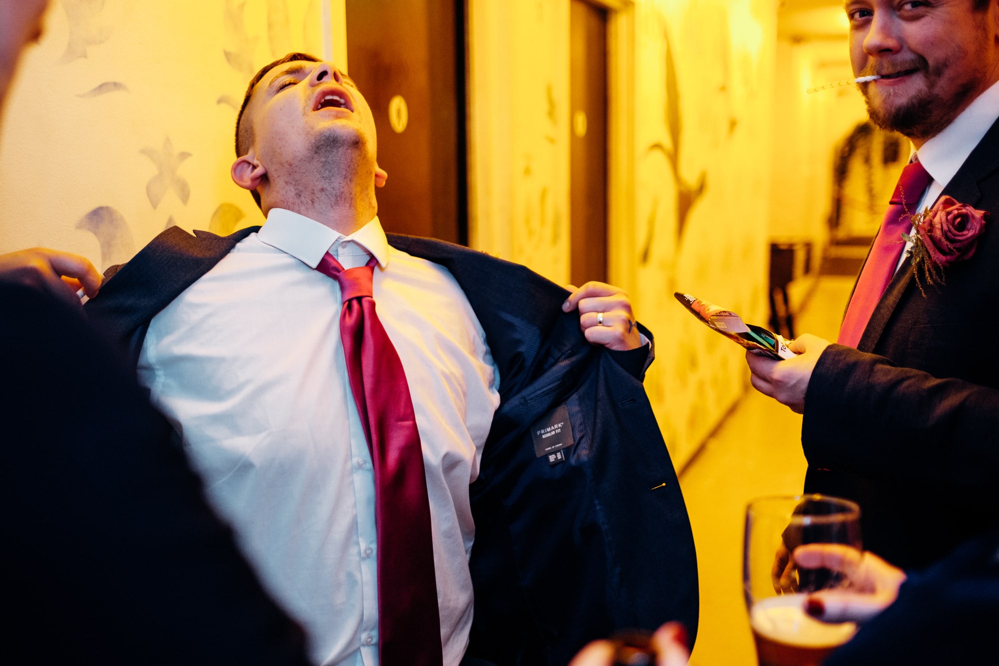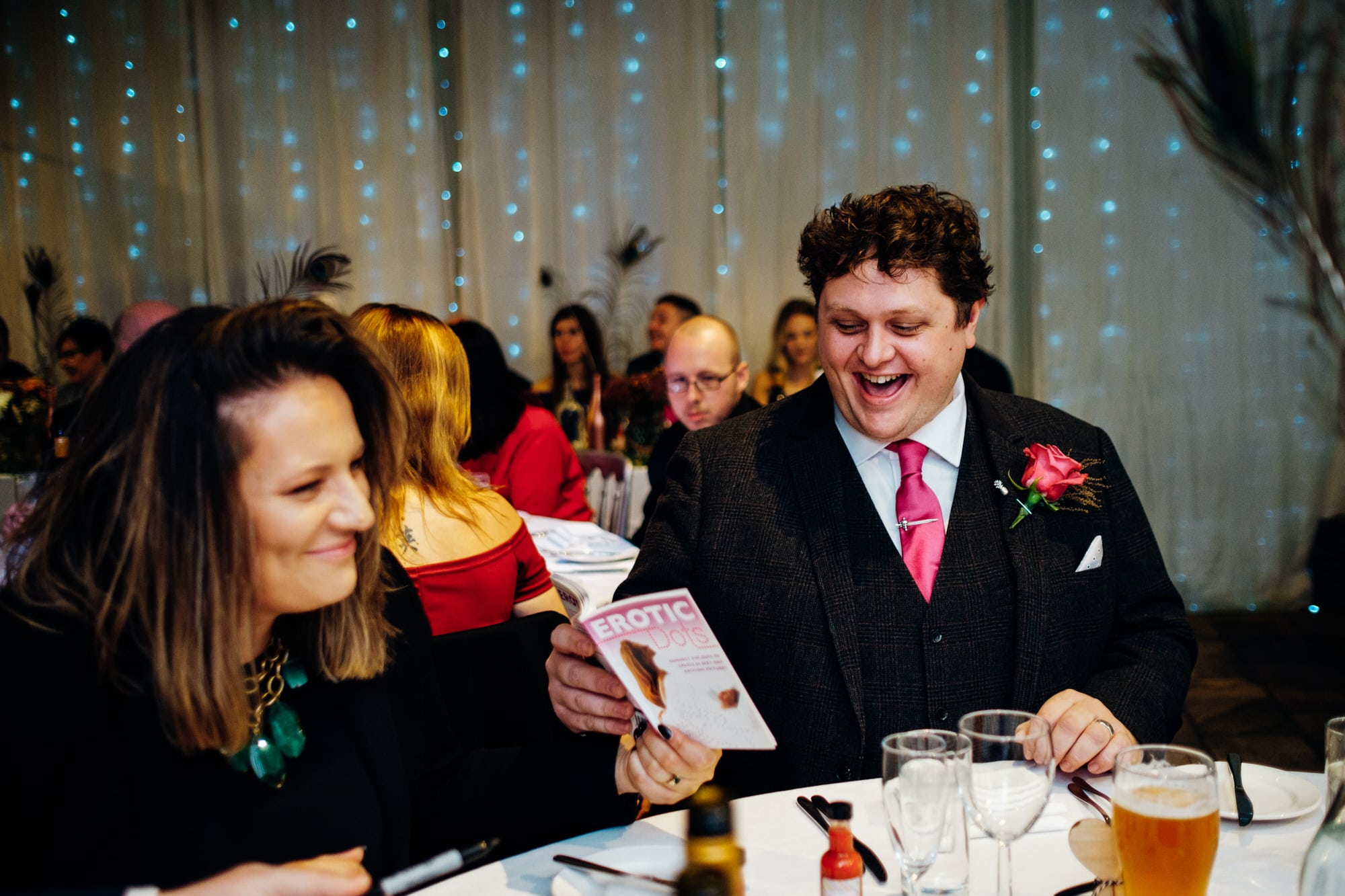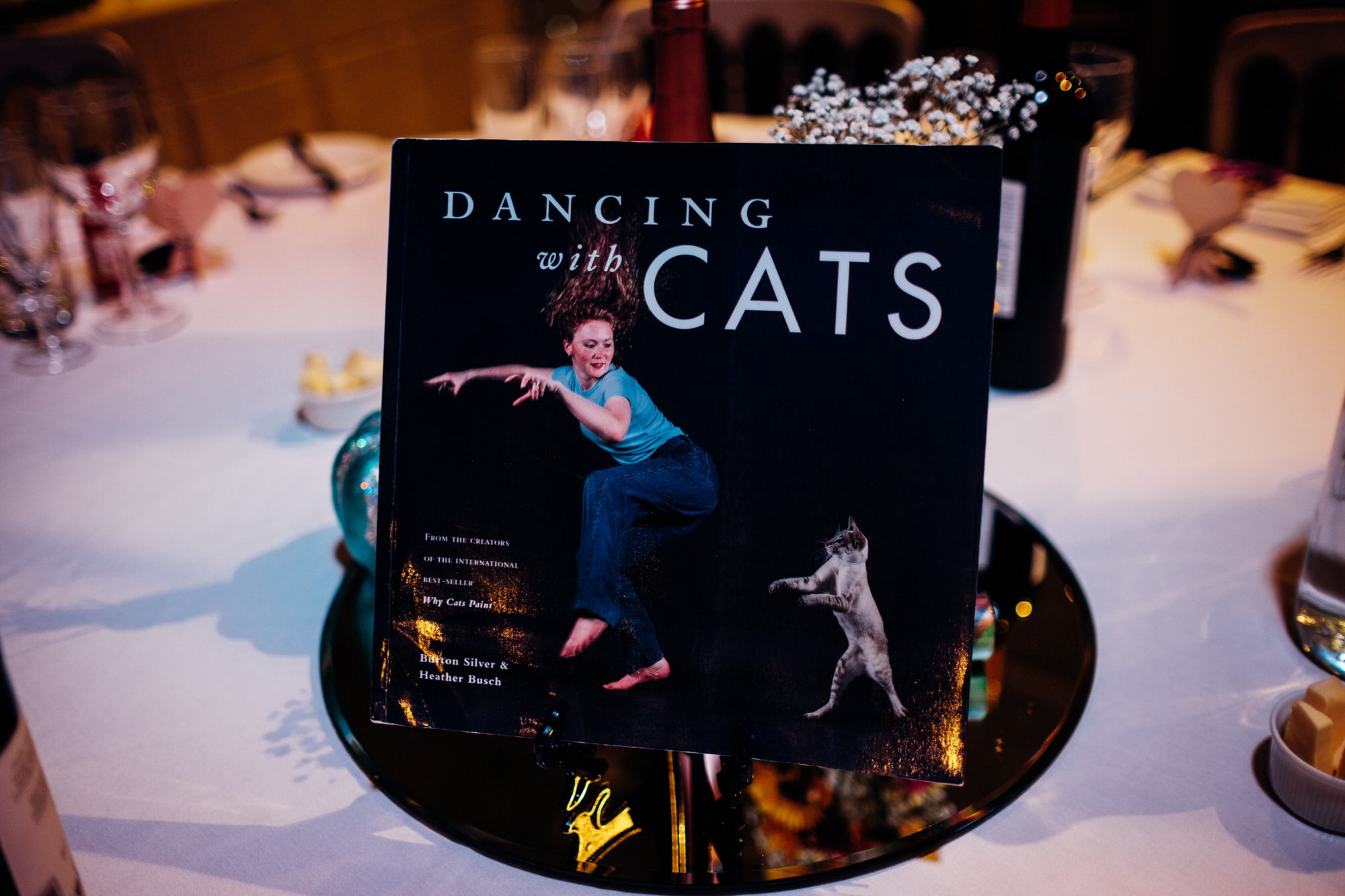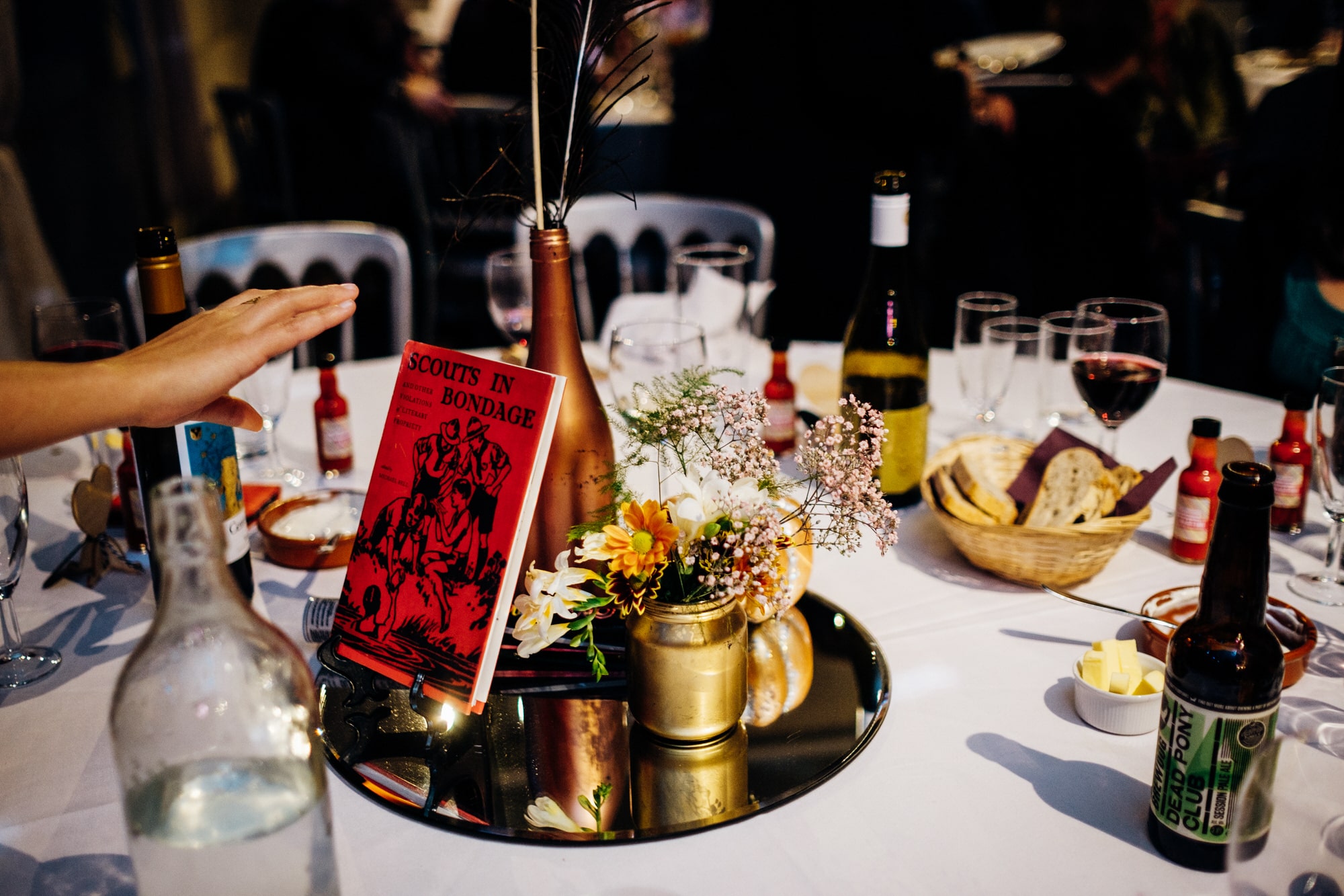 The Metalworks in Islington is a really cool wedding reception venue that comes with loads of decor help because it’s a working scrap metal yard as well! They have lots of quirky props and they let couples customise the space, and they’re fantastic at making sure the room looks great. Alex and Janine had a properly original idea for their table names and centrepieces… their wedding dinner theme was unusual/weird books that they’d sourced from all over the internet! This included books like Downtown Tabby… literally a story of Downtown Abbey in cat form. Erotic Dot to Dot, which provided much entertainment, a book solely on Weatherspoons pub carpets and a guide for how to dance with cats! On top of this they had a pimp your own prosecco bar, a gorgeous and plentiful cake table, a temporary tattoo station, stunning doughnuts, flamingo cake toppers, a fancy dress photo booth complete with animal masks… just loads of cool shit basically!