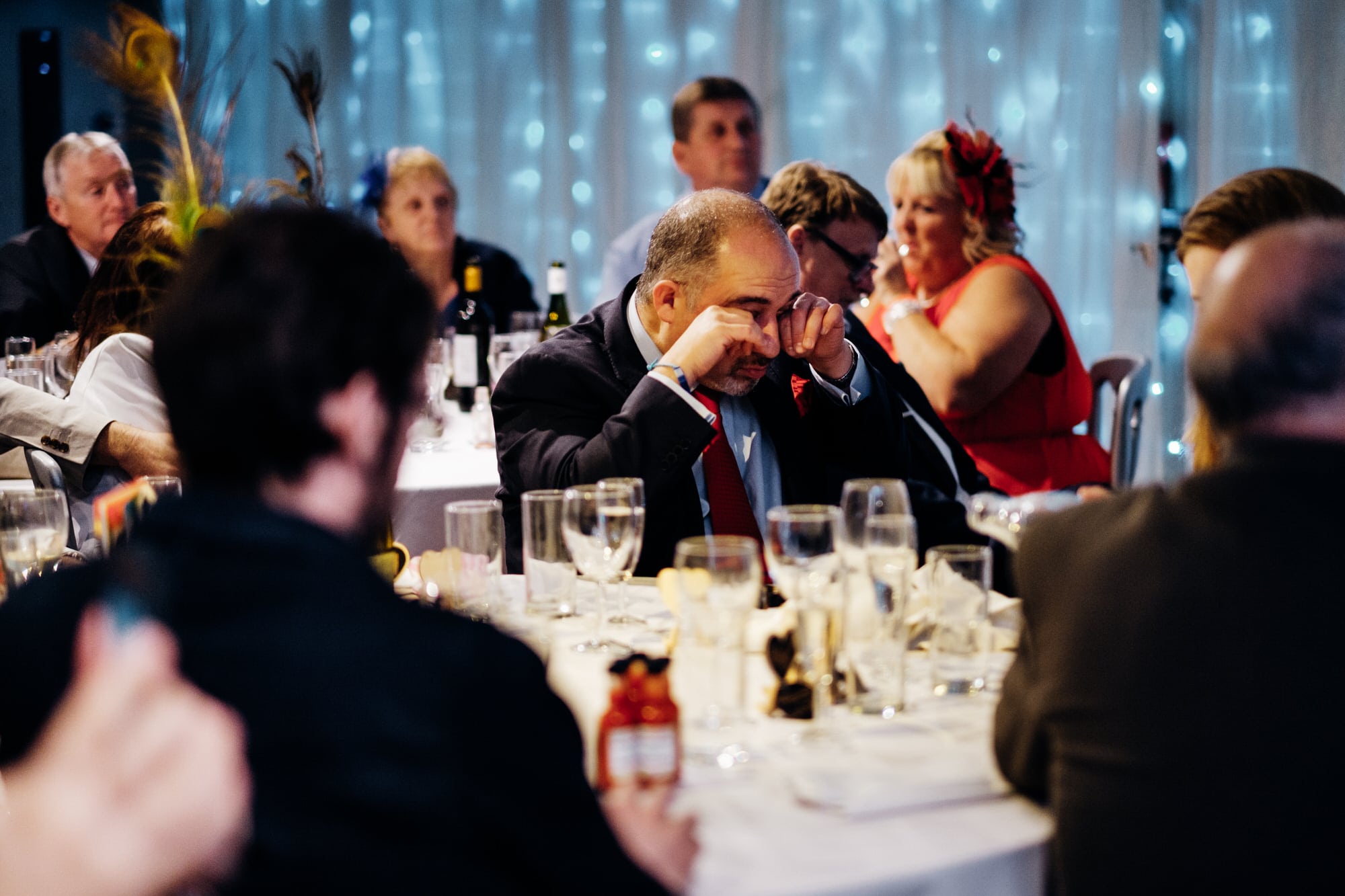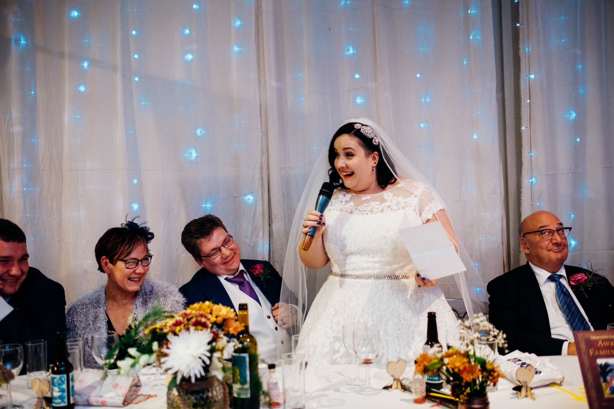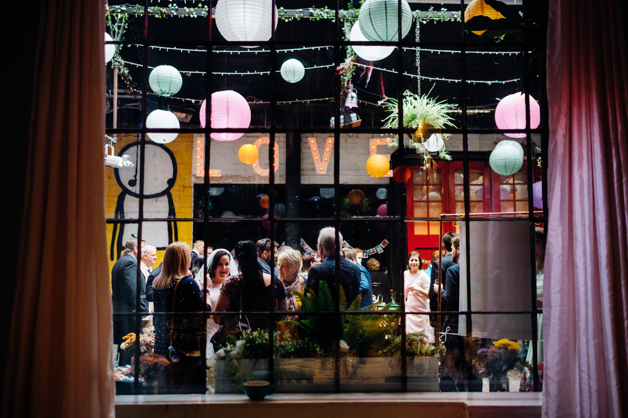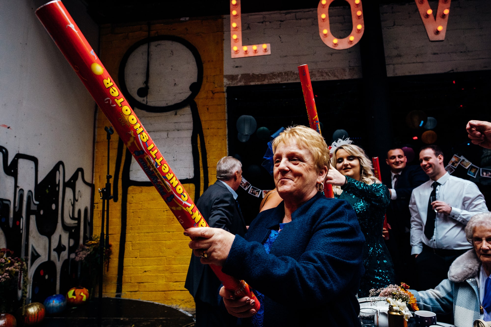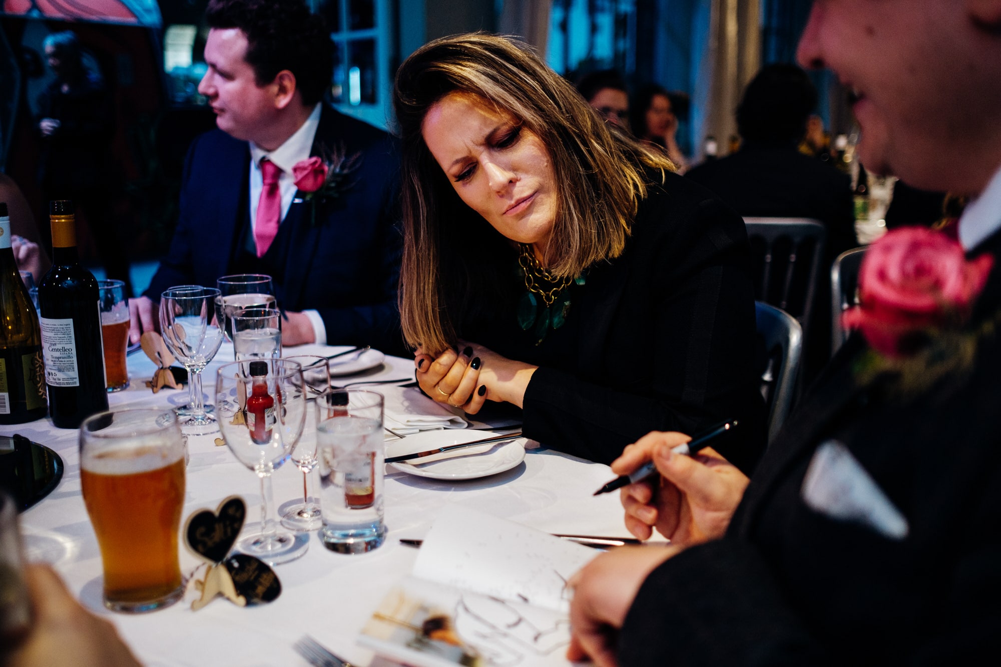 After their Islington Metalworks wedding drinks reception all the guests sat down for dinner, Alex and Janine were kind enough to seat me with their guests so I got to stay close to the fun! To roll with the Halloween esque theme, their wedding favours created home made shots of baileys but made it look like blood/spicy sauce, so the guests had a bit of a trick or treat moment!