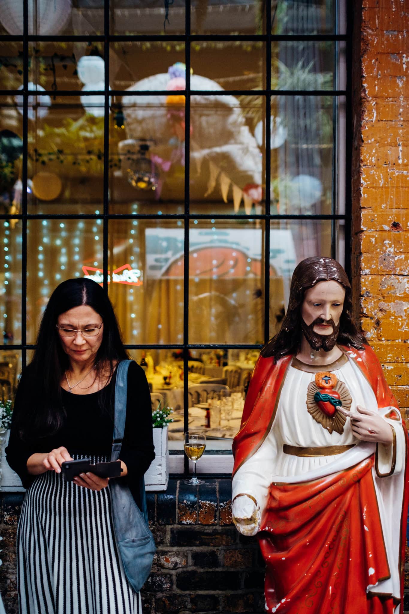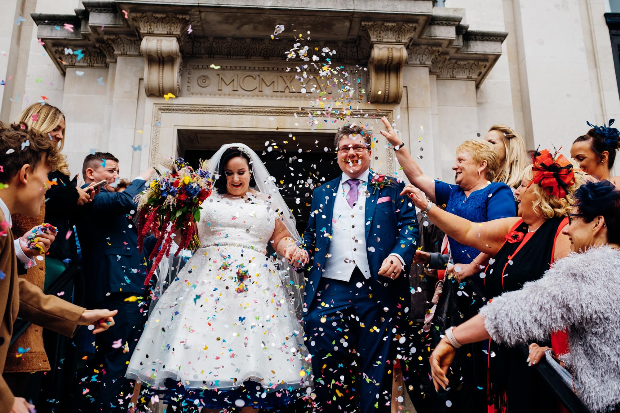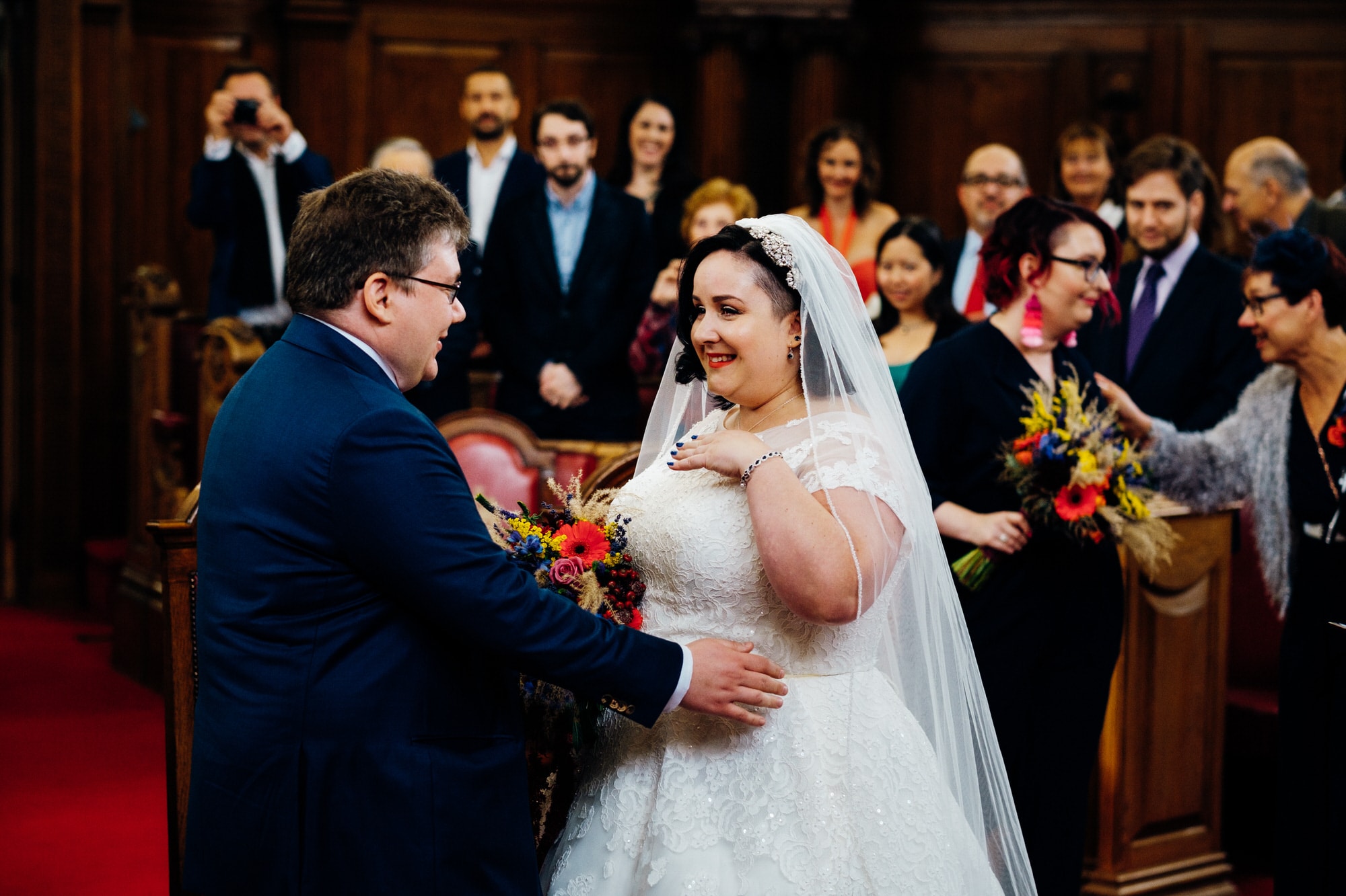 Alex and Janine are a clever couple who planned a brilliantly original Islington Metalworks wedding in London. I’ve shot here before and it’s one of my favourite quirky London wedding venues. They both started the morning getting ready at the iconic Renaissance Hotel, a truly beautiful and unique hotel right next to Kings Cross St Pancras station. Janine wore a sweet vintage A-line lace dress, combined with blue Dolce and Gabbana shoes customised with clip on blue sixpence that matched her bold blue petticoat. They opted for bright colours throughout their wedding floristry, which was done by their friend.