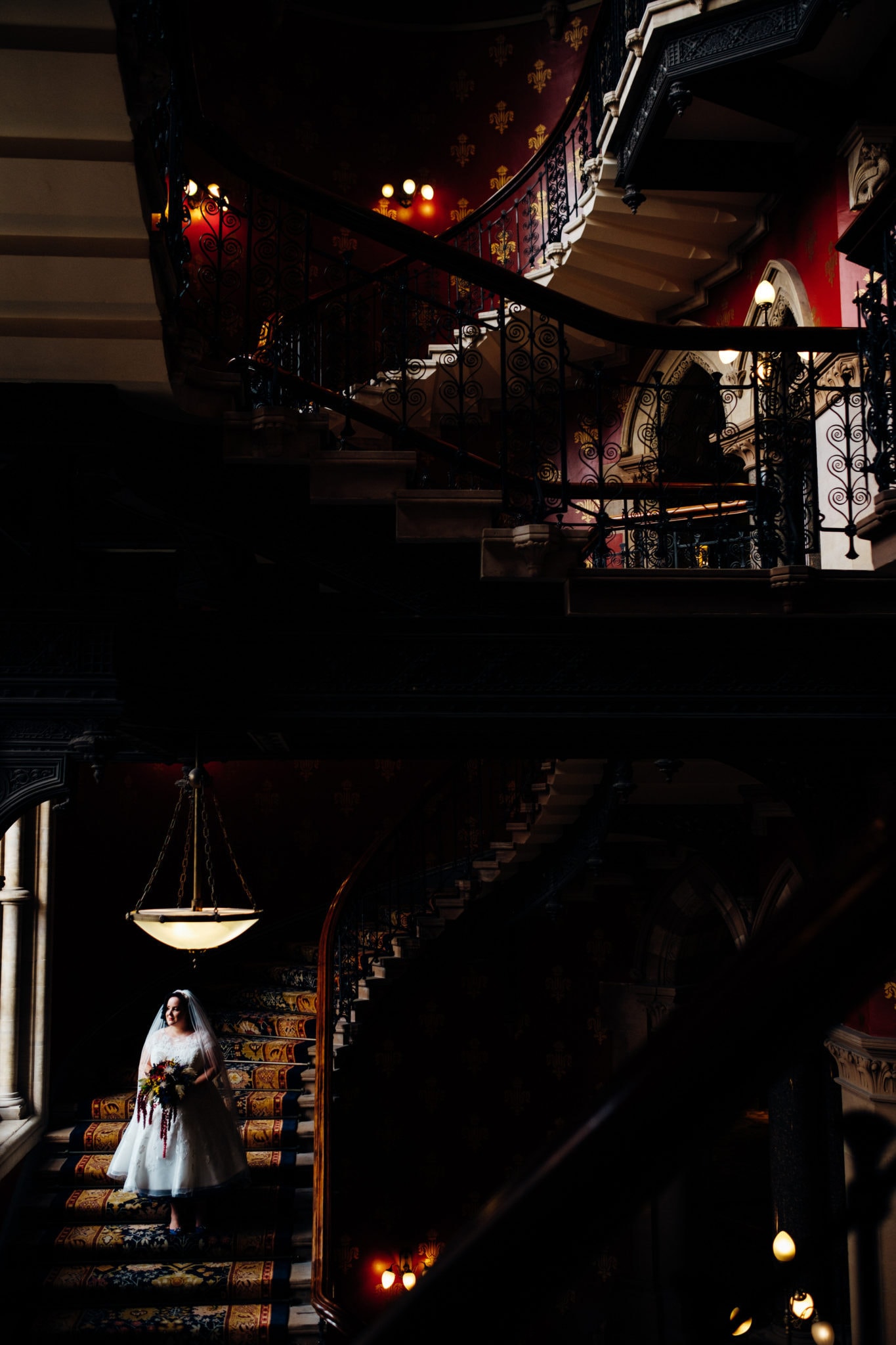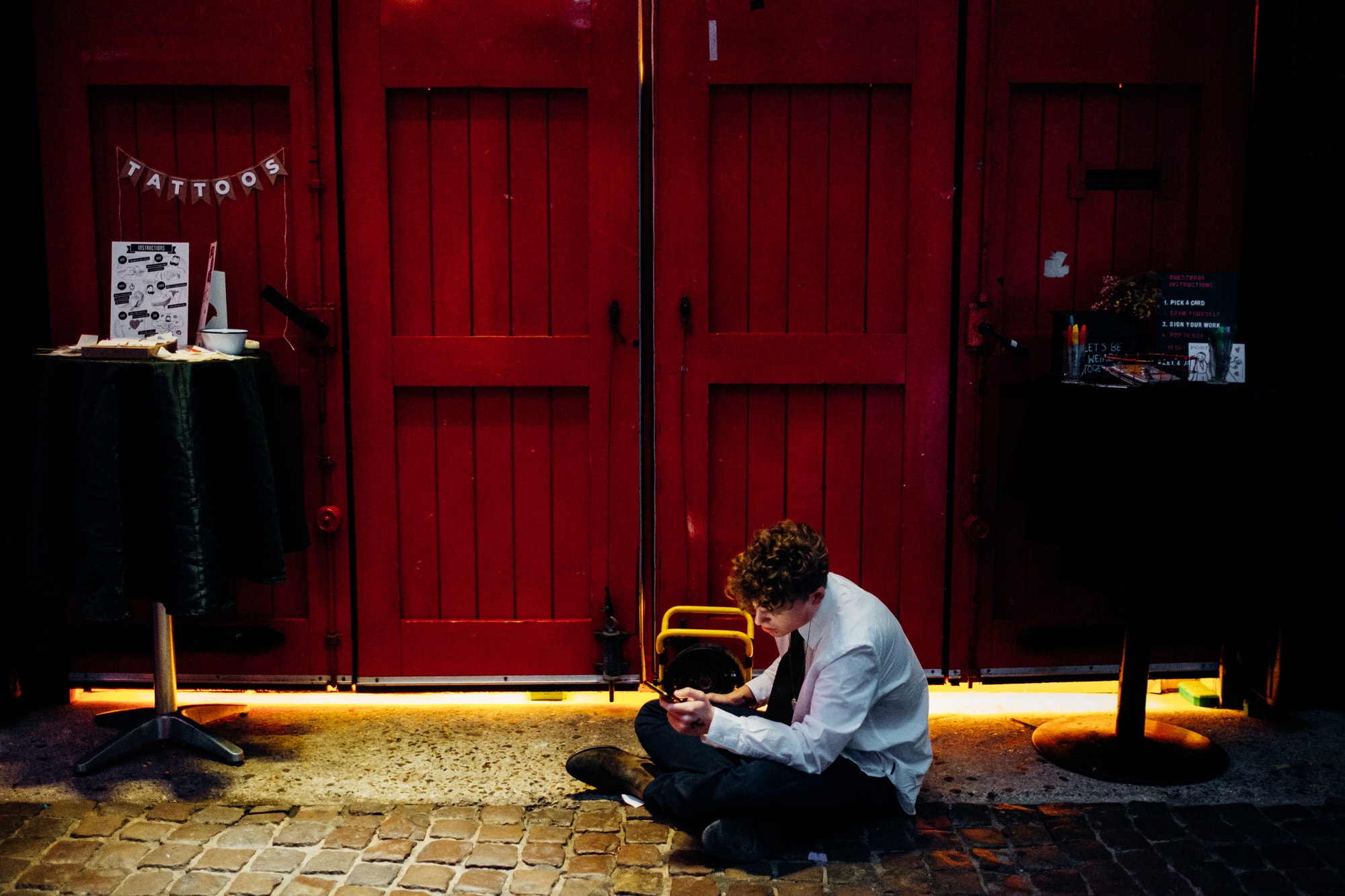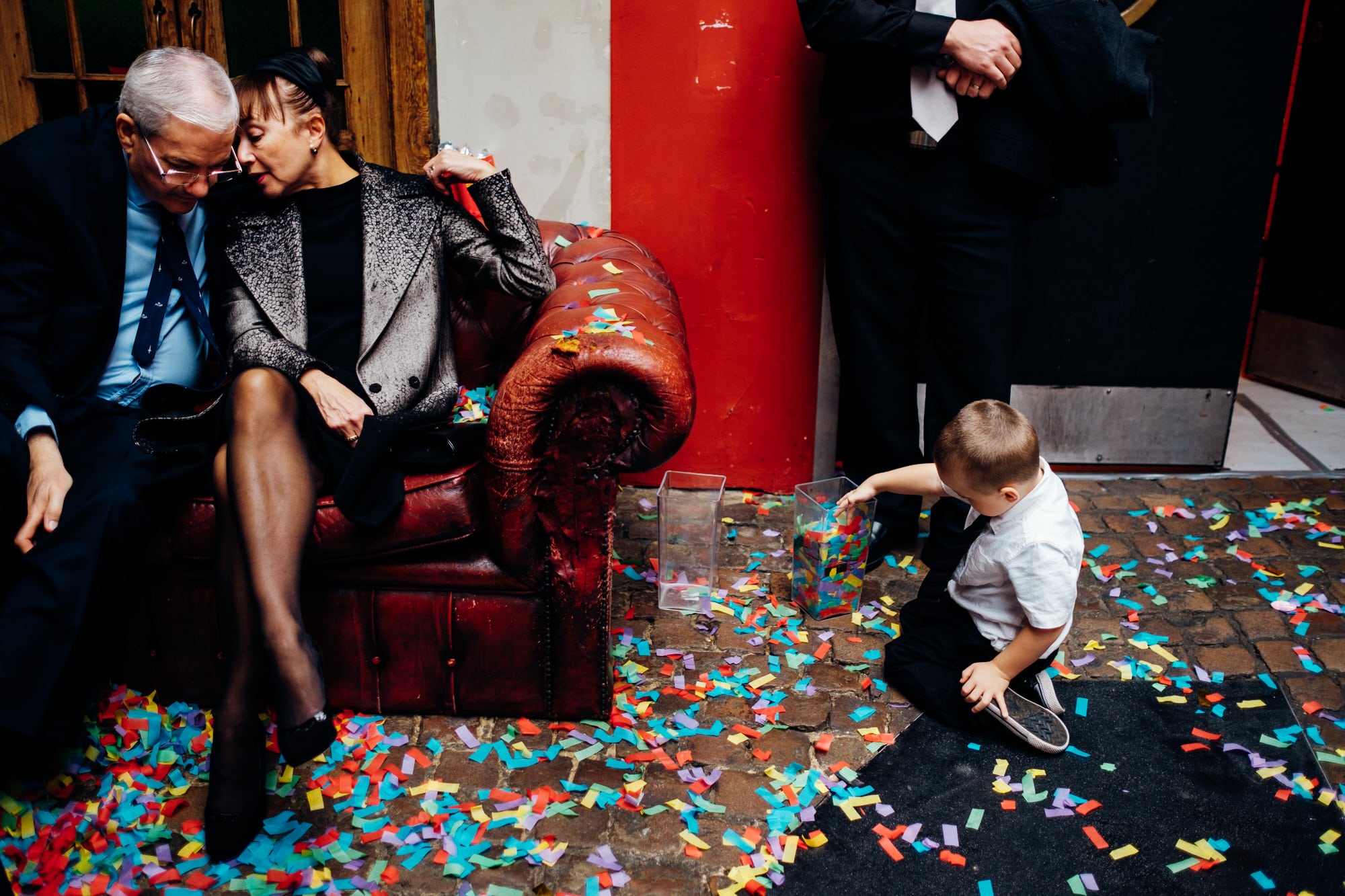 Alex and Janine are a clever couple who planned a brilliantly original Islington Metalworks wedding in London. I’ve shot here before and it’s one of my favourite quirky London wedding venues. They both started the morning getting ready at the iconic Renaissance Hotel, a truly beautiful and unique hotel right next to Kings Cross St Pancras station. Janine wore a sweet vintage A-line lace dress, combined with blue Dolce and Gabbana shoes customised with clip on blue sixpence that matched her bold blue petticoat. They opted for bright colours throughout their wedding floristry, which was done by their friend.