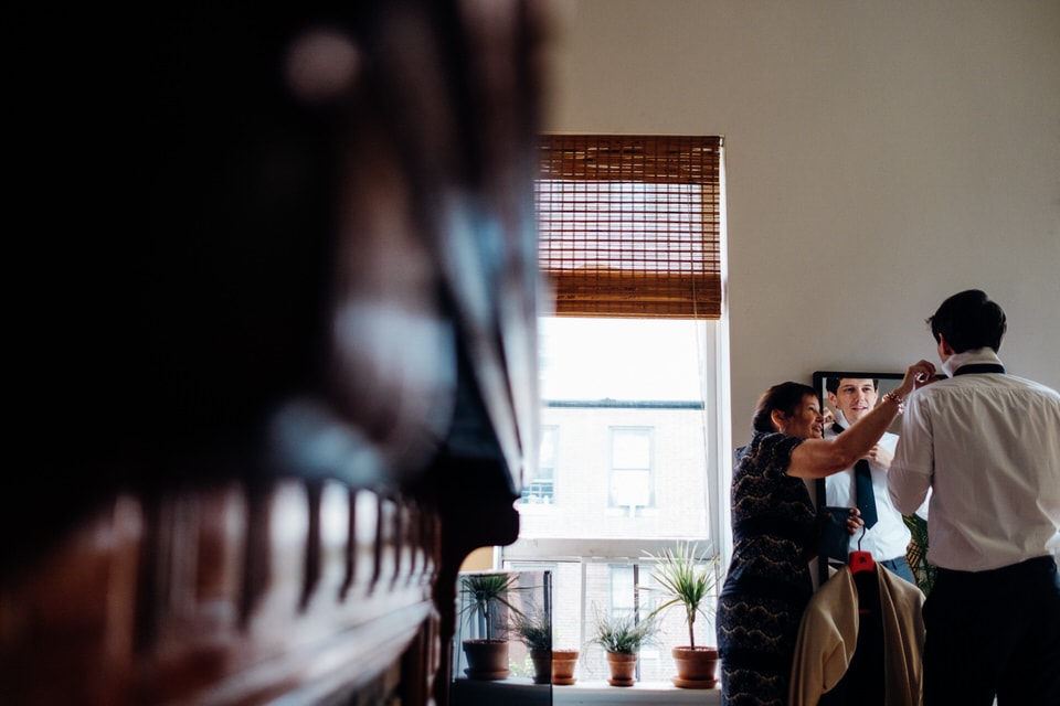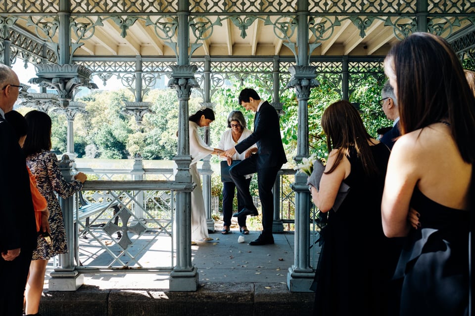 I only shoot a handful of destination weddings per year, but Chloe and Mike were the witnesses at my previous New York City elopement and they very kindly insisted that I come back and shoot for them in their multi-day extravaganza wedding! With a British groom and an American bride they decided the easiest thing to do would be for them to travel to everyone else! So I started the day in their New York Manhattan apartment, where they got ready with their parents and their cat. Chloe wore stunning Oscar De La Renta shoes, and Mike had a fun time tying his tie three times to make sure it was absolutely perfect. Chloe’s dad made the bouquet for her out of white lillies. They had their ceremony in the Ladies Pavilion in Central Park, before strolling over to get a taxi from Boludsud for a private dinner with family who had managed to travel in. After dinner I went with the bride and groom to visit their favourite bubble tea and take some couple shots around their local favourite spots, including their local greengrocer!