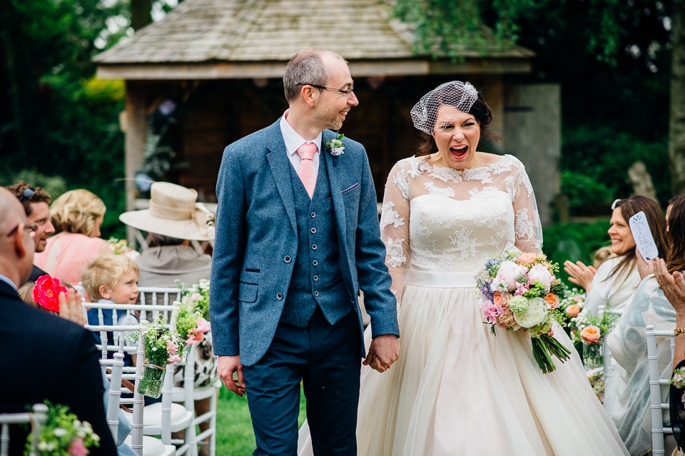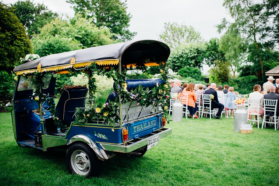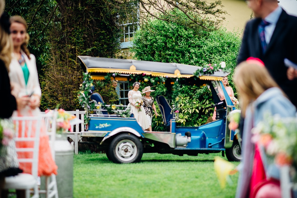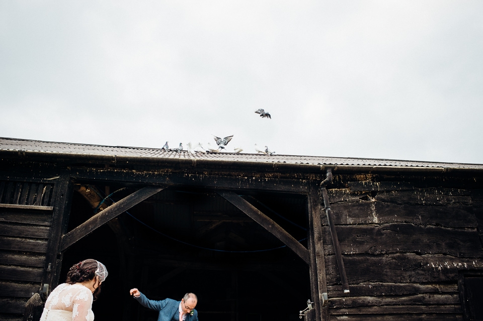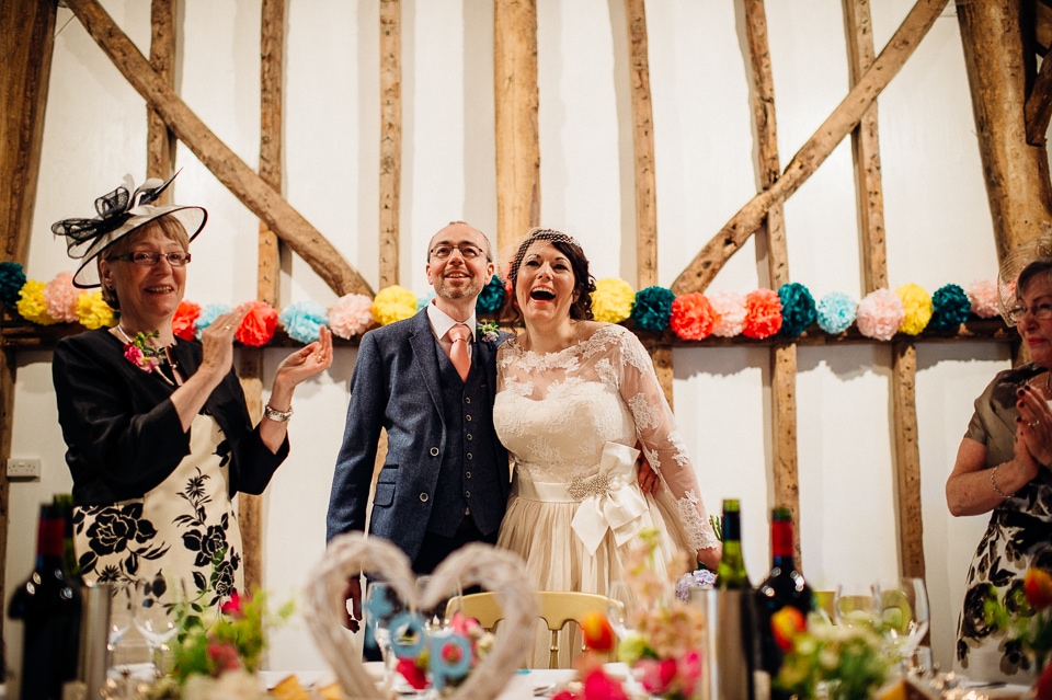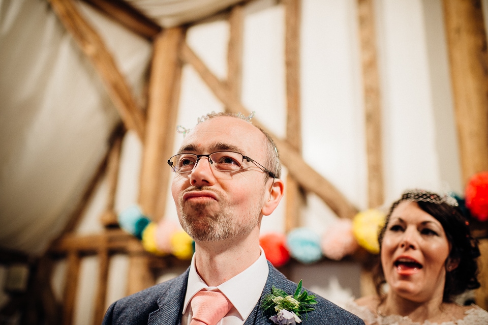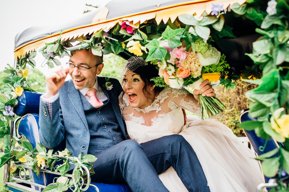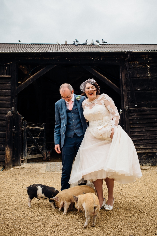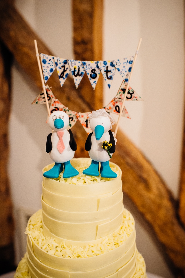 Andy and Karen are a sweet couple who found me on Rock N Roll Bride who were planning a bright and colourful DIY tastic wedding at South Farm. They started out with lots and lots of fun ideas including a family tree, but eventually settled on lots of pom poms, flowers, rustic centrepieces and blue footed booby cake toppers. The booby cake toppers are because they went to the Galapagos Island for their honeymoon, but also because it’s fun to say they had boobies on their cake! Karen got ready at South Farm and wore a pale pink and white lace A line 50’s dress with Irregular Choice shoes and a bird cage veil. Andy wore a blue tweed Ted Baker suit with a peacock lining (totally matching South Farm’s resident white peacock) and a pink tie! Their hand fasting ceremony was outdoors next to a lily pad lake and was GORGEOUS. They’d decorated the seated area with flowers in jars and everyone had colourful flags and their rings were passed around all their guests so they could bless them together. Their hand fasting ribbons were tied by their friend and after an emotional ceremony they rode off in a blue Thai tuk-tuk!