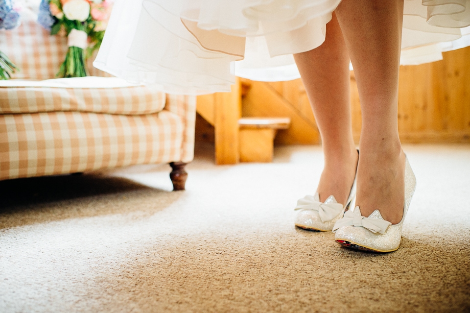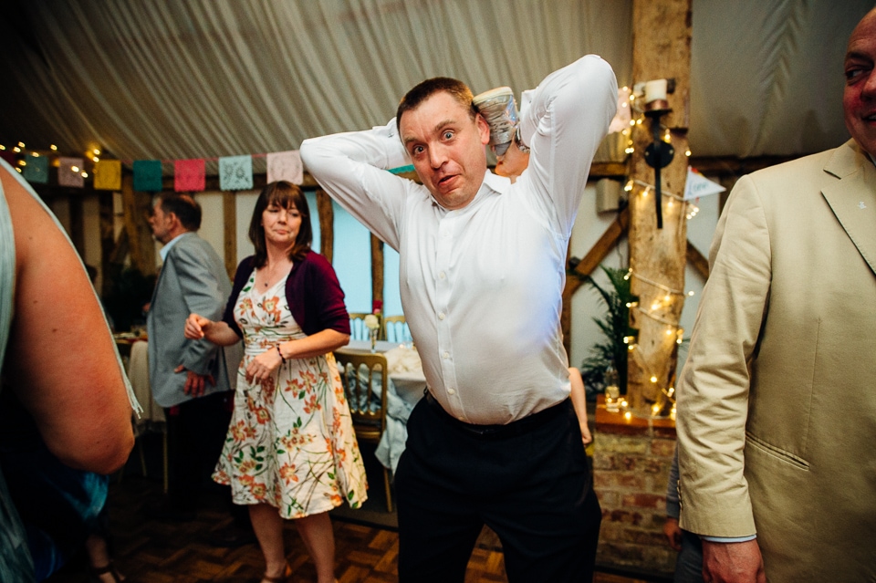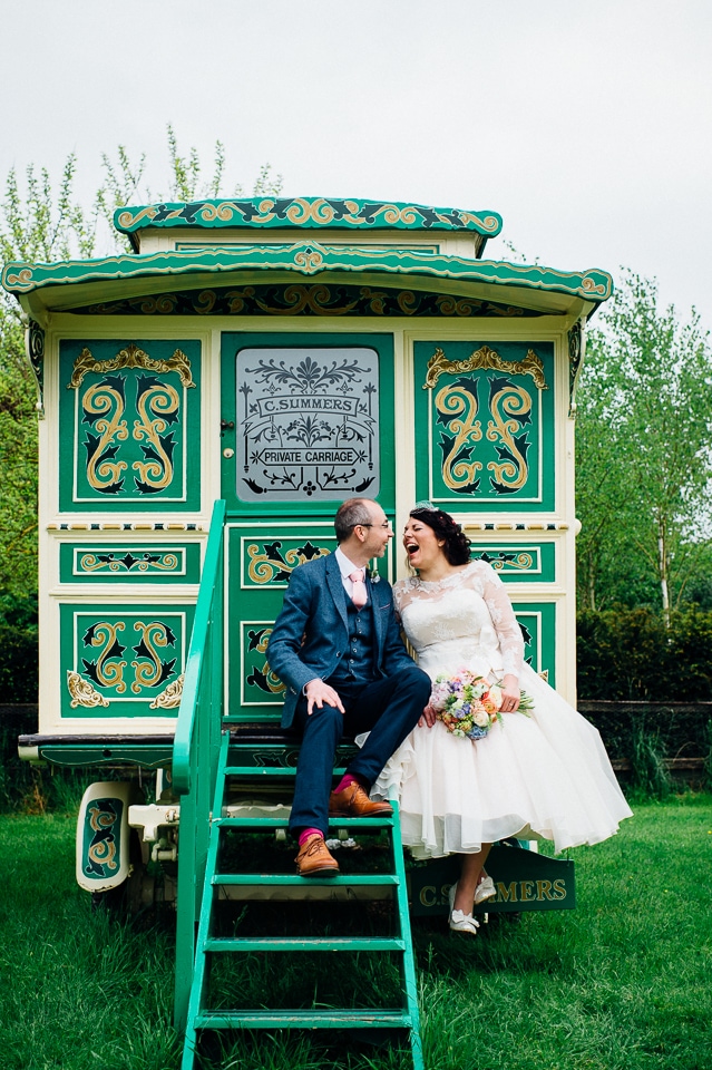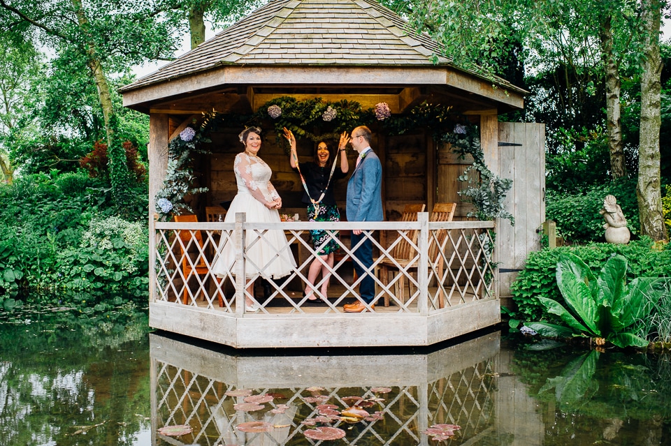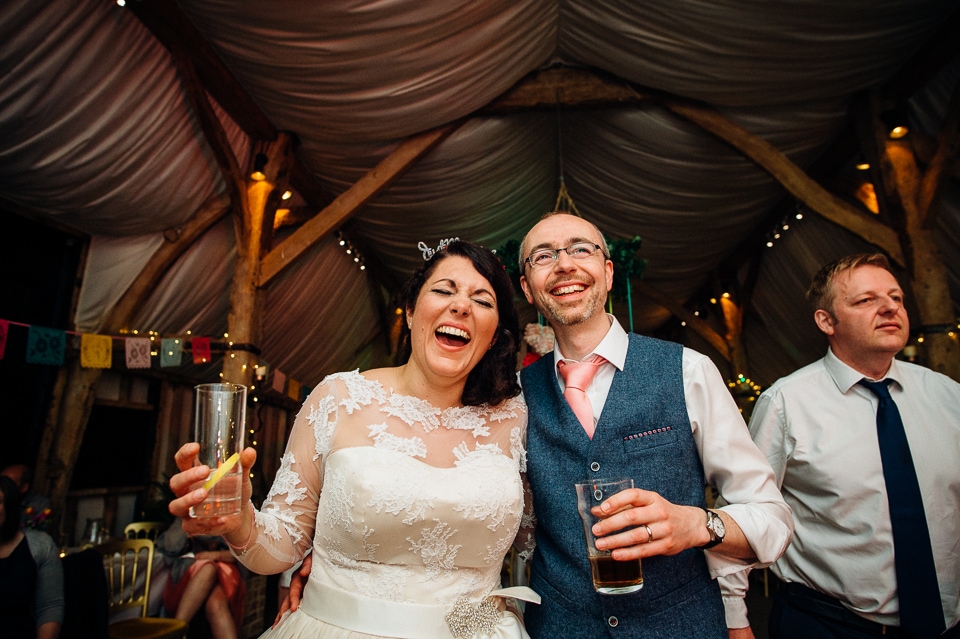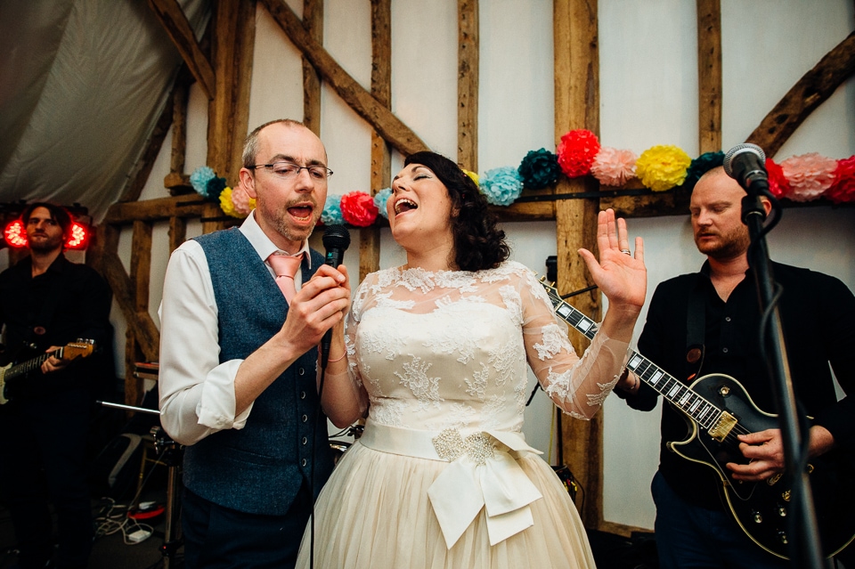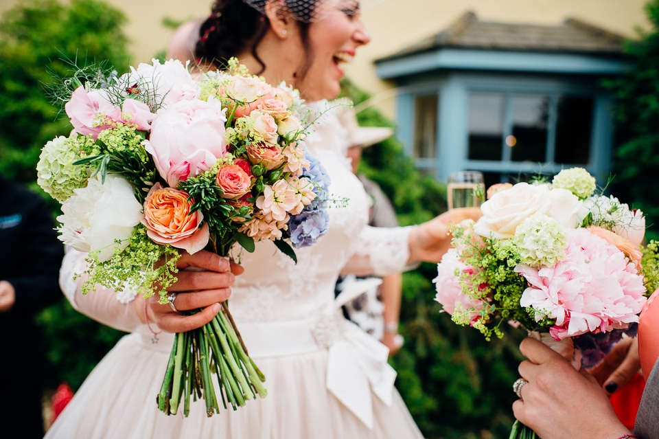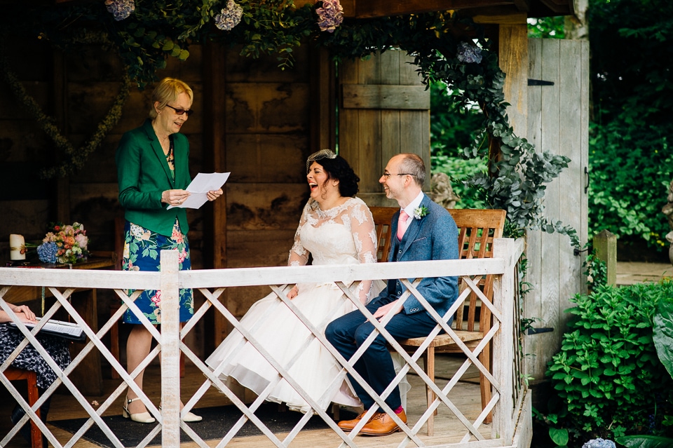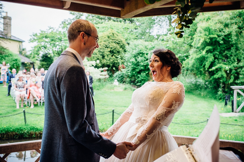 Andy and Karen are a sweet couple who found me on Rock N Roll Bride who were planning a bright and colourful DIY tastic wedding at South Farm. They started out with lots and lots of fun ideas including a family tree, but eventually settled on lots of pom poms, flowers, rustic centrepieces and blue footed booby cake toppers. The booby cake toppers are because they went to the Galapagos Island for their honeymoon, but also because it’s fun to say they had boobies on their cake! Karen got ready at South Farm and wore a pale pink and white lace A line 50’s dress with Irregular Choice shoes and a bird cage veil. Andy wore a blue tweed Ted Baker suit with a peacock lining (totally matching South Farm’s resident white peacock) and a pink tie! Their hand fasting ceremony was outdoors next to a lily pad lake and was GORGEOUS. They’d decorated the seated area with flowers in jars and everyone had colourful flags and their rings were passed around all their guests so they could bless them together. Their hand fasting ribbons were tied by their friend and after an emotional ceremony they rode off in a blue Thai tuk-tuk!