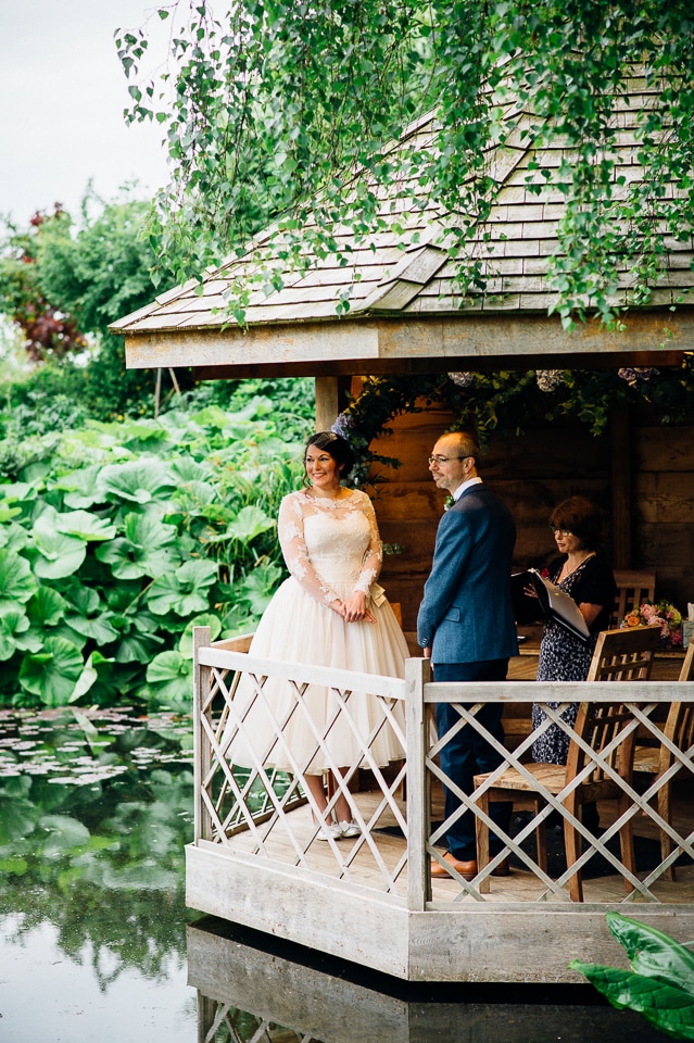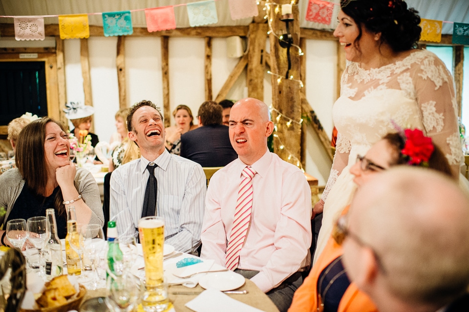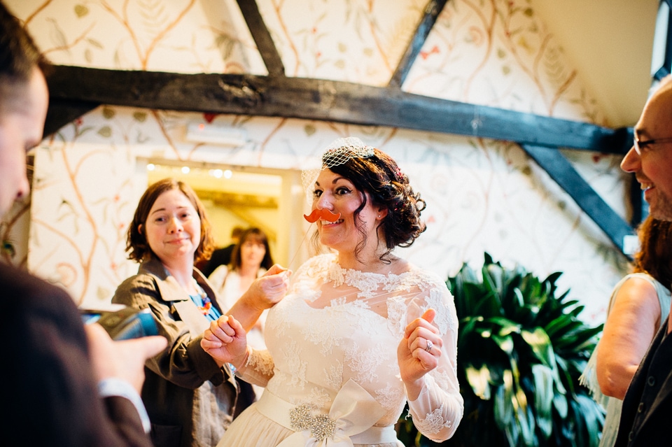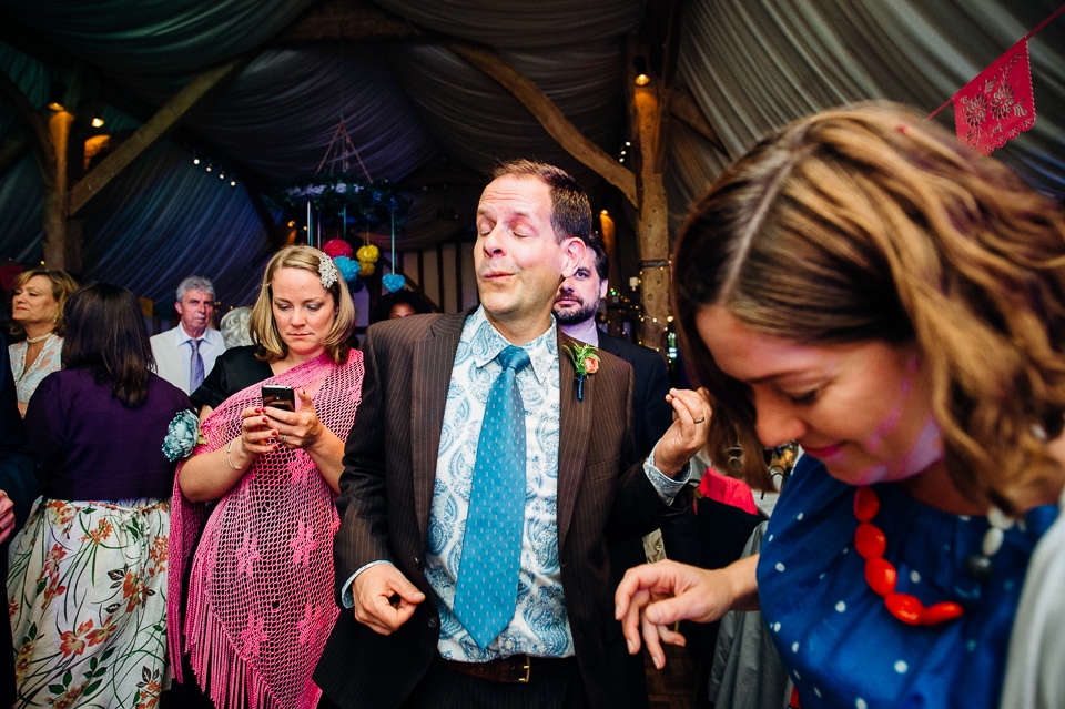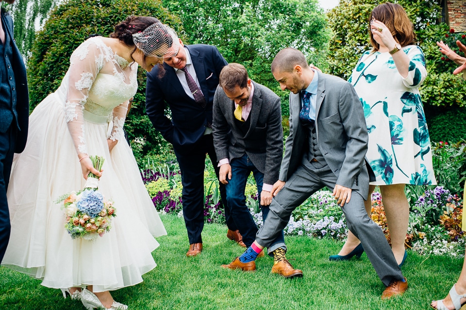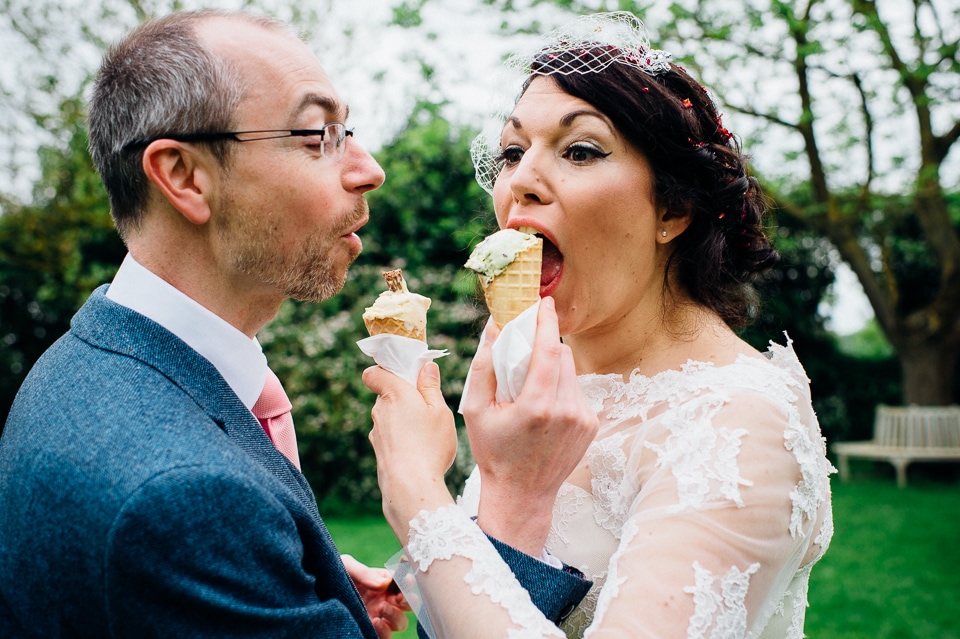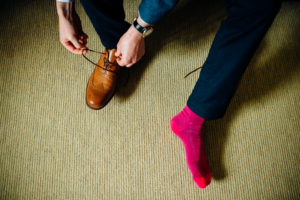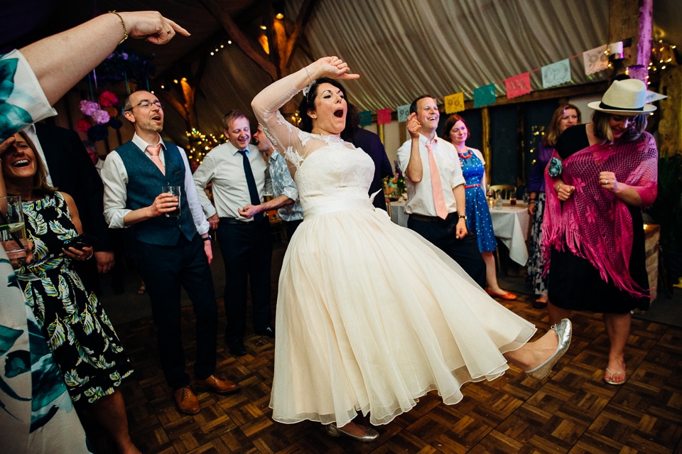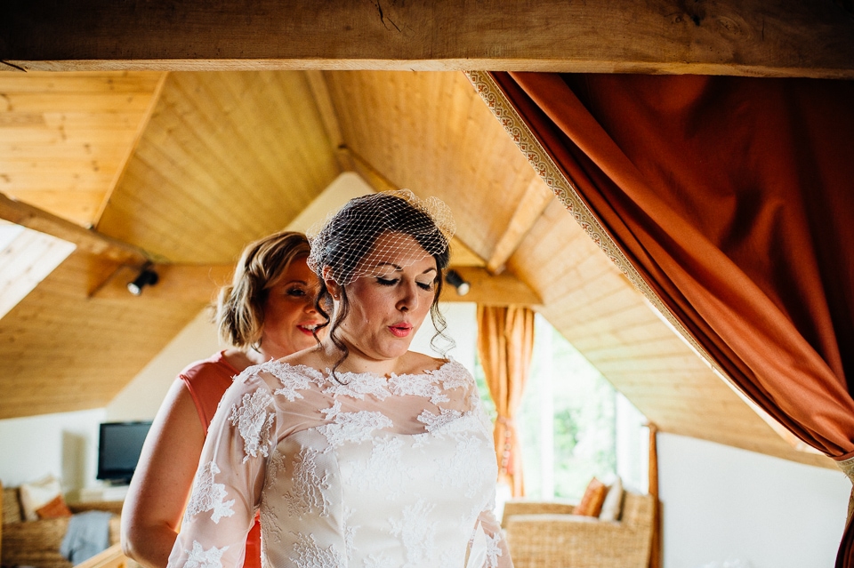 Andy and Karen are a sweet couple who found me on Rock N Roll Bride who were planning a bright and colourful DIY tastic wedding at South Farm. They started out with lots and lots of fun ideas including a family tree, but eventually settled on lots of pom poms, flowers, rustic centrepieces and blue footed booby cake toppers. The booby cake toppers are because they went to the Galapagos Island for their honeymoon, but also because it’s fun to say they had boobies on their cake! Karen got ready at South Farm and wore a pale pink and white lace A line 50’s dress with Irregular Choice shoes and a bird cage veil. Andy wore a blue tweed Ted Baker suit with a peacock lining (totally matching South Farm’s resident white peacock) and a pink tie! Their hand fasting ceremony was outdoors next to a lily pad lake and was GORGEOUS. They’d decorated the seated area with flowers in jars and everyone had colourful flags and their rings were passed around all their guests so they could bless them together. Their hand fasting ribbons were tied by their friend and after an emotional ceremony they rode off in a blue Thai tuk-tuk!
