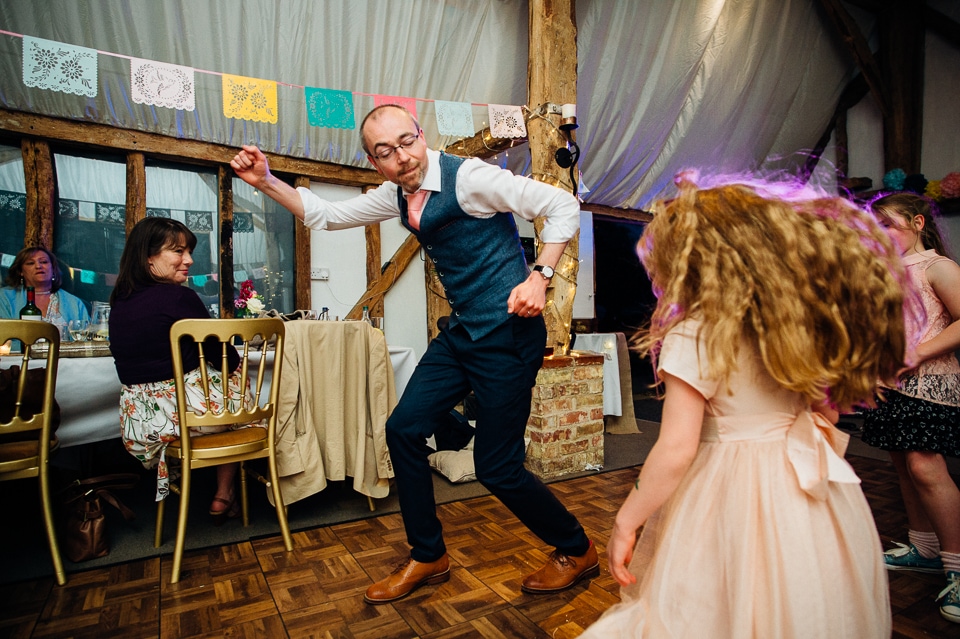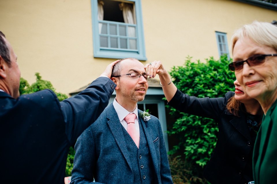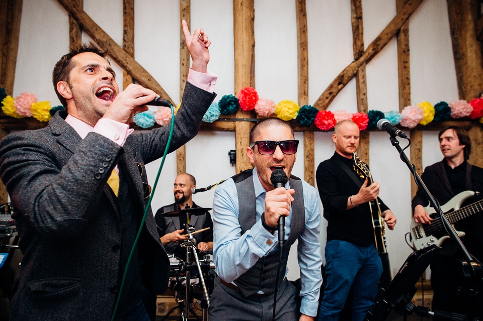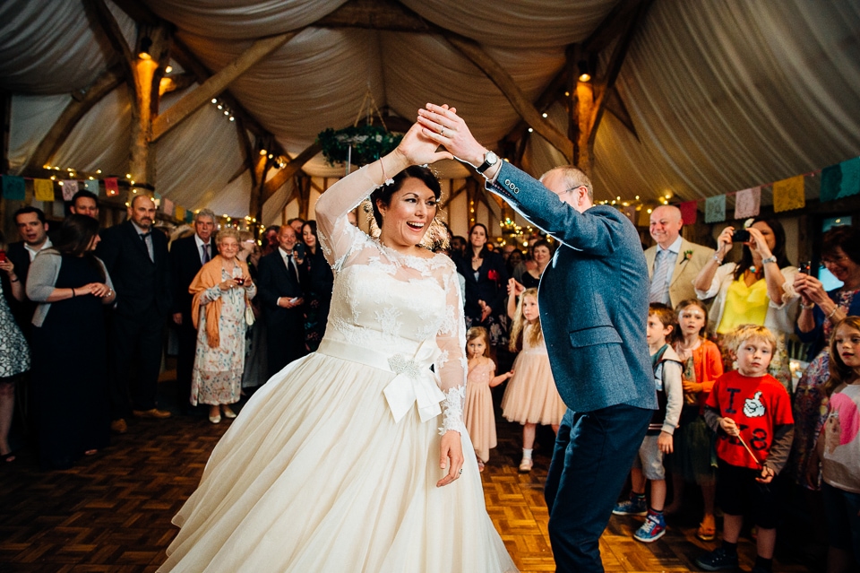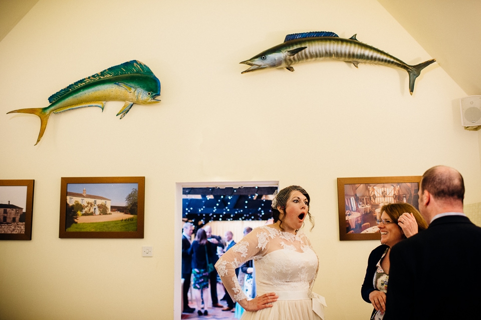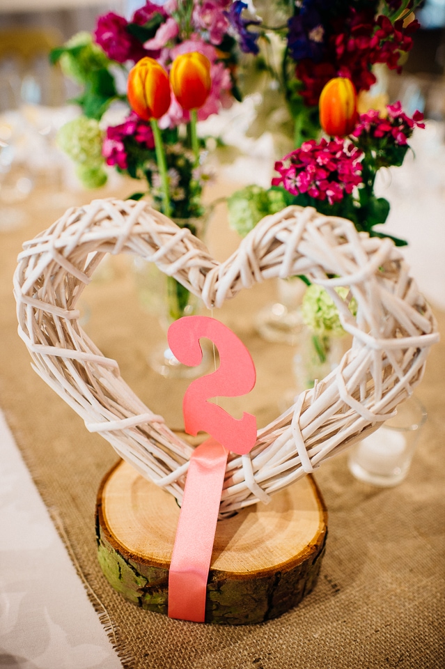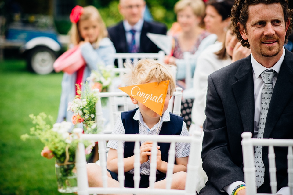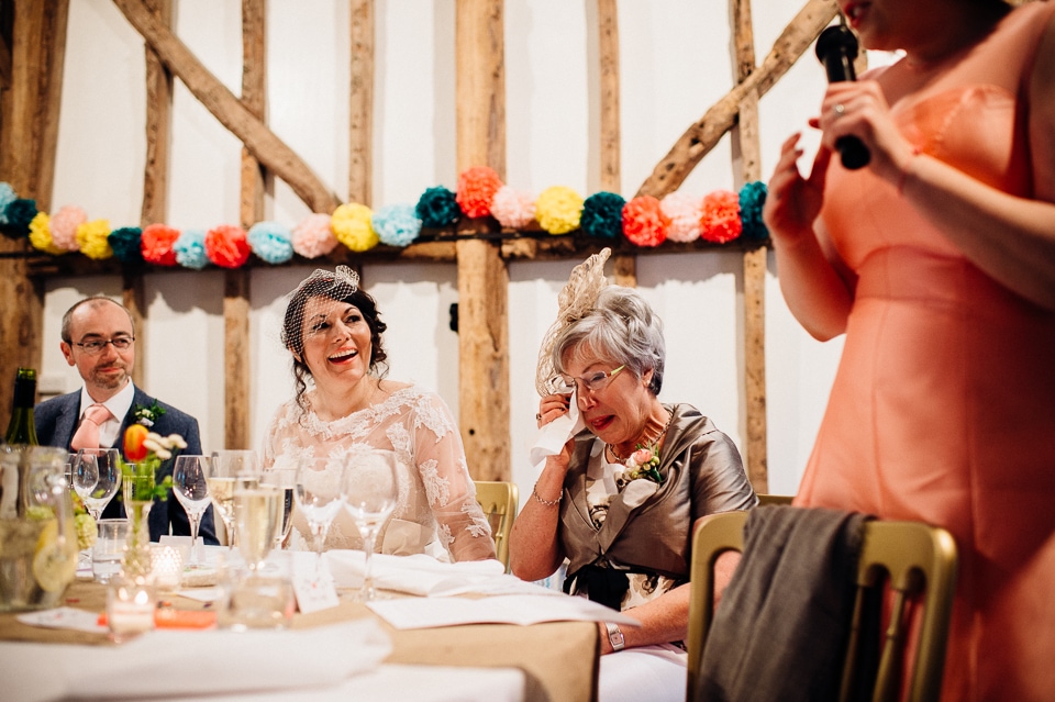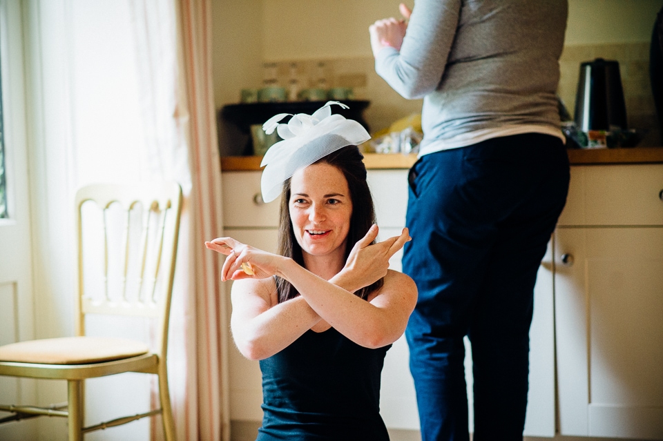 Andy and Karen are a sweet couple who found me on Rock N Roll Bride who were planning a bright and colourful DIY tastic wedding at South Farm. They started out with lots and lots of fun ideas including a family tree, but eventually settled on lots of pom poms, flowers, rustic centrepieces and blue footed booby cake toppers. The booby cake toppers are because they went to the Galapagos Island for their honeymoon, but also because it’s fun to say they had boobies on their cake! Karen got ready at South Farm and wore a pale pink and white lace A line 50’s dress with Irregular Choice shoes and a bird cage veil. Andy wore a blue tweed Ted Baker suit with a peacock lining (totally matching South Farm’s resident white peacock) and a pink tie! Their hand fasting ceremony was outdoors next to a lily pad lake and was GORGEOUS. They’d decorated the seated area with flowers in jars and everyone had colourful flags and their rings were passed around all their guests so they could bless them together. Their hand fasting ribbons were tied by their friend and after an emotional ceremony they rode off in a blue Thai tuk-tuk!