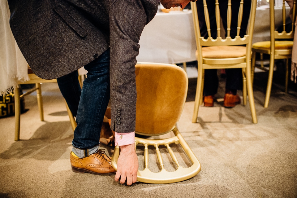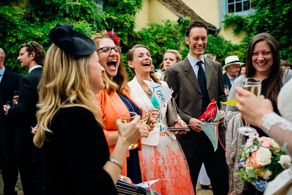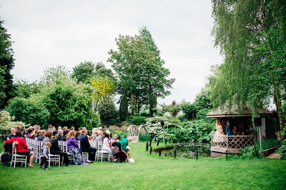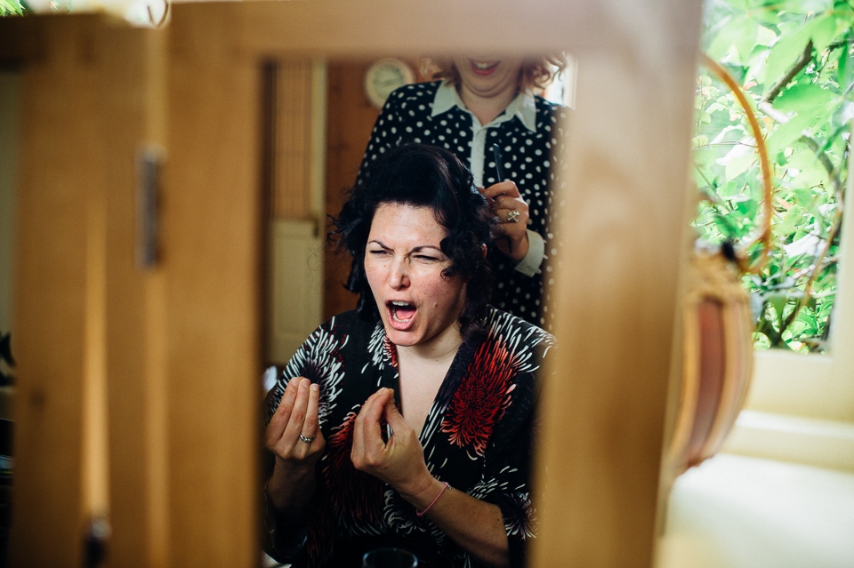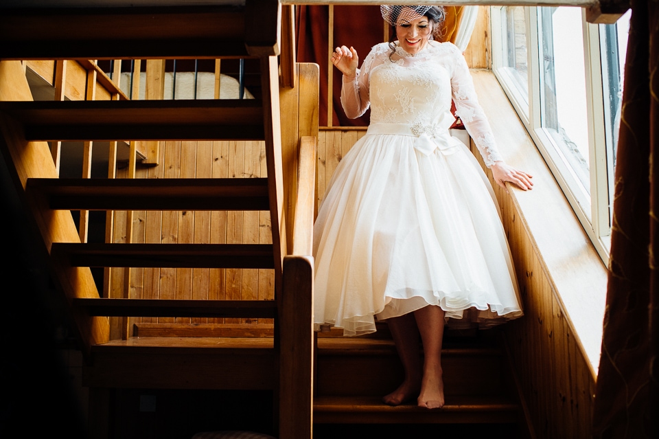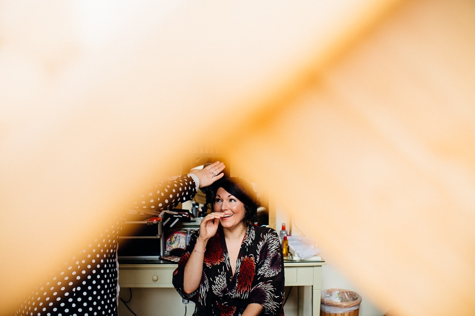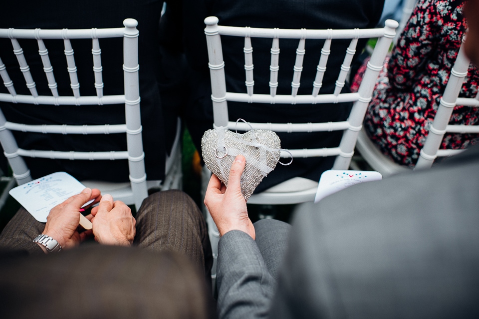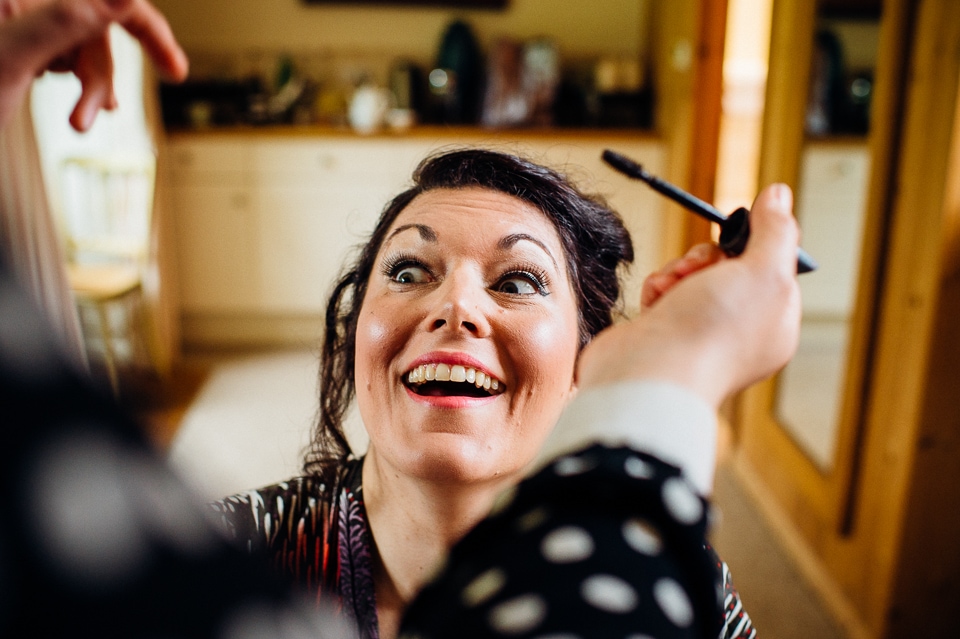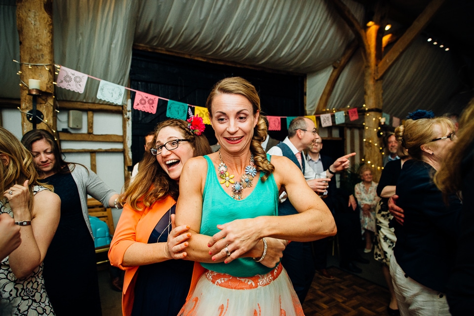 Andy and Karen are a sweet couple who found me on Rock N Roll Bride who were planning a bright and colourful DIY tastic wedding at South Farm. They started out with lots and lots of fun ideas including a family tree, but eventually settled on lots of pom poms, flowers, rustic centrepieces and blue footed booby cake toppers. The booby cake toppers are because they went to the Galapagos Island for their honeymoon, but also because it’s fun to say they had boobies on their cake! Karen got ready at South Farm and wore a pale pink and white lace A line 50’s dress with Irregular Choice shoes and a bird cage veil. Andy wore a blue tweed Ted Baker suit with a peacock lining (totally matching South Farm’s resident white peacock) and a pink tie! Their hand fasting ceremony was outdoors next to a lily pad lake and was GORGEOUS. They’d decorated the seated area with flowers in jars and everyone had colourful flags and their rings were passed around all their guests so they could bless them together. Their hand fasting ribbons were tied by their friend and after an emotional ceremony they rode off in a blue Thai tuk-tuk!