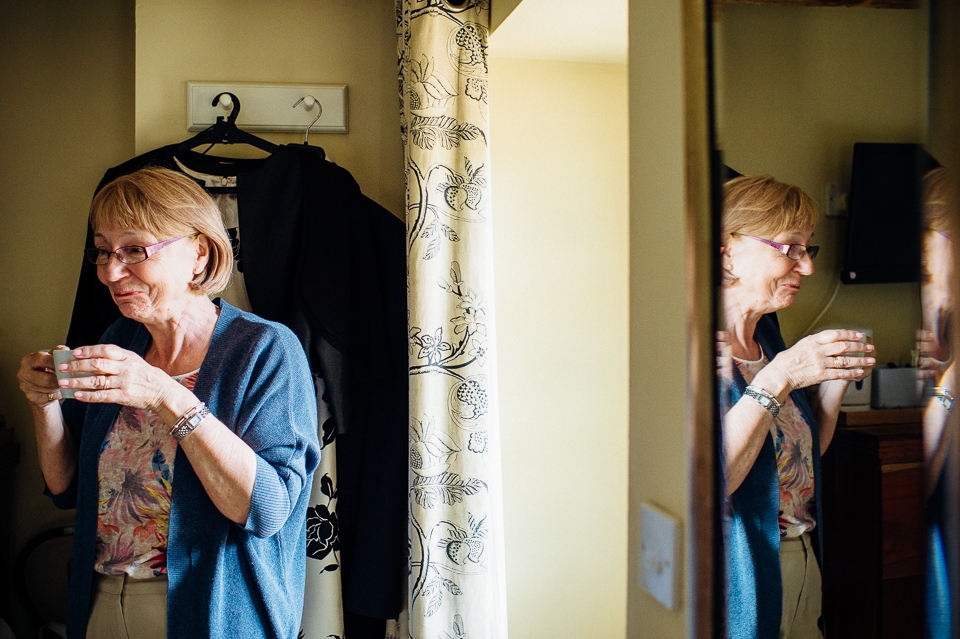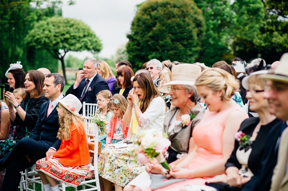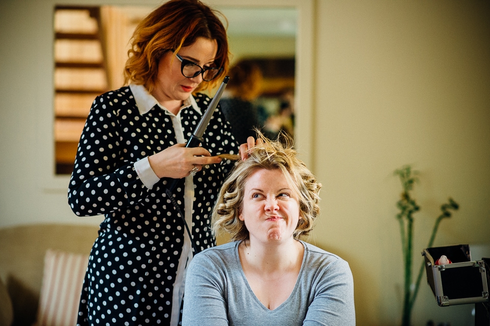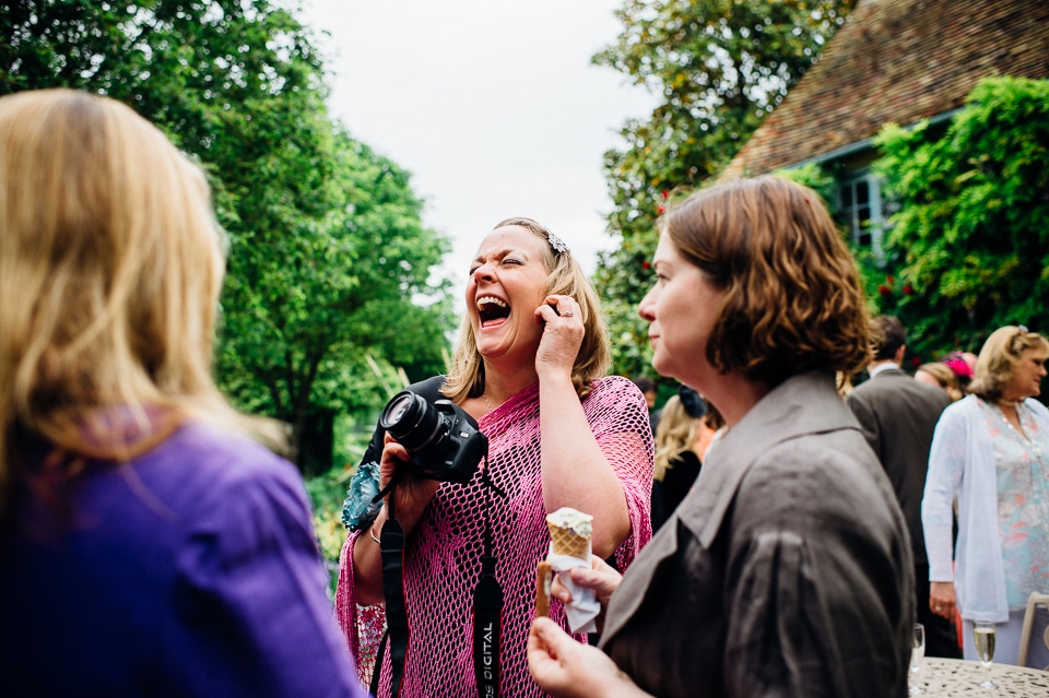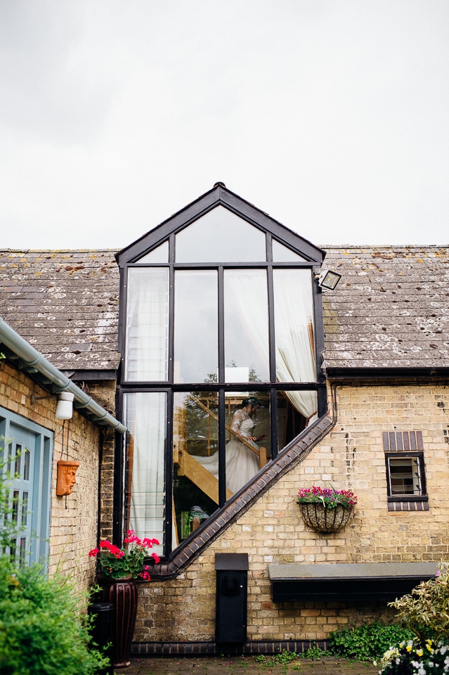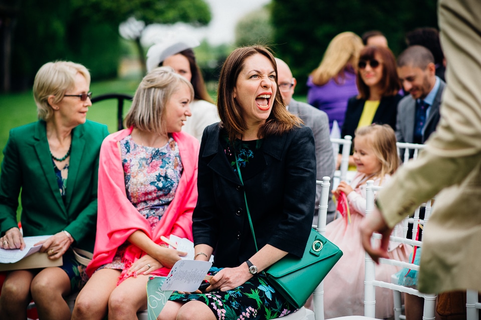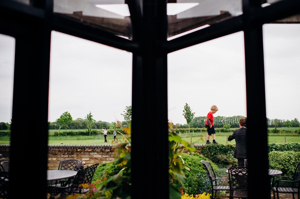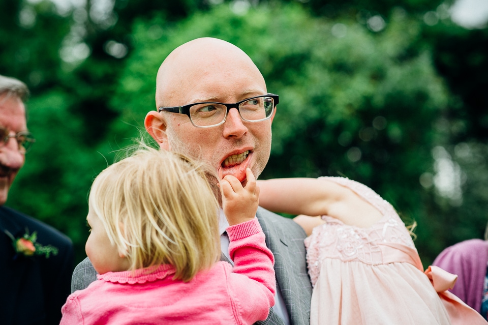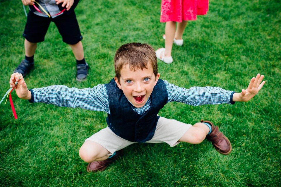 Andy and Karen are a sweet couple who found me on Rock N Roll Bride who were planning a bright and colourful DIY tastic wedding at South Farm. They started out with lots and lots of fun ideas including a family tree, but eventually settled on lots of pom poms, flowers, rustic centrepieces and blue footed booby cake toppers. The booby cake toppers are because they went to the Galapagos Island for their honeymoon, but also because it’s fun to say they had boobies on their cake! Karen got ready at South Farm and wore a pale pink and white lace A line 50’s dress with Irregular Choice shoes and a bird cage veil. Andy wore a blue tweed Ted Baker suit with a peacock lining (totally matching South Farm’s resident white peacock) and a pink tie! Their hand fasting ceremony was outdoors next to a lily pad lake and was GORGEOUS. They’d decorated the seated area with flowers in jars and everyone had colourful flags and their rings were passed around all their guests so they could bless them together. Their hand fasting ribbons were tied by their friend and after an emotional ceremony they rode off in a blue Thai tuk-tuk!