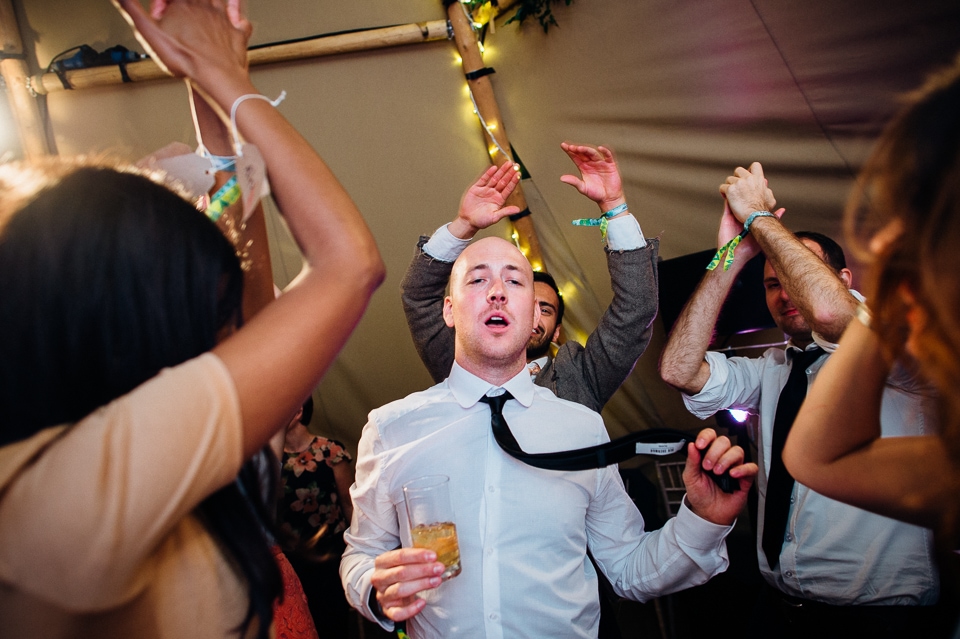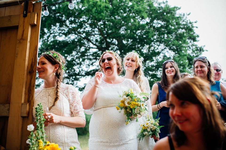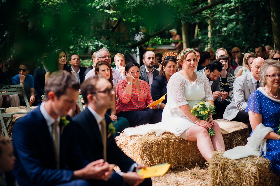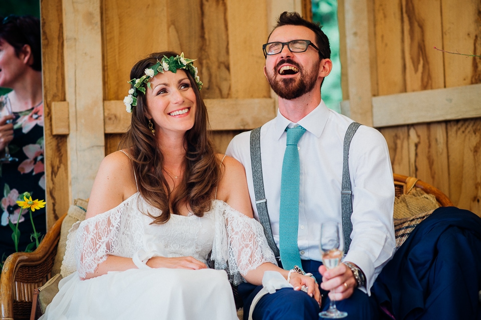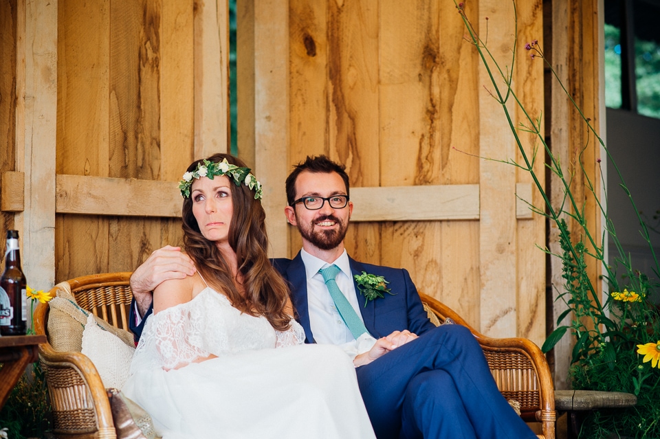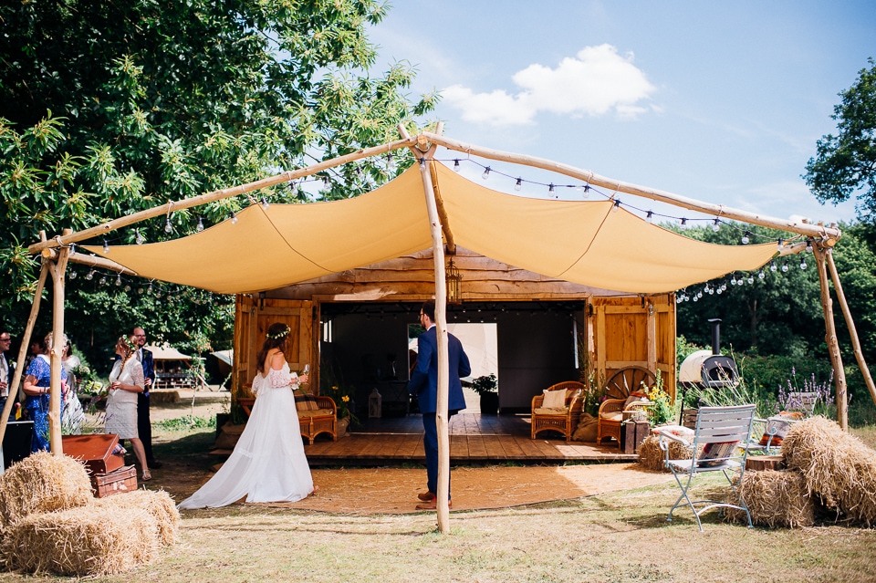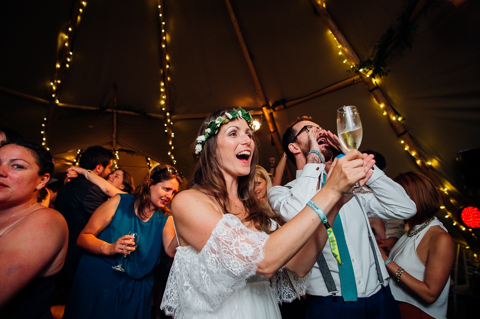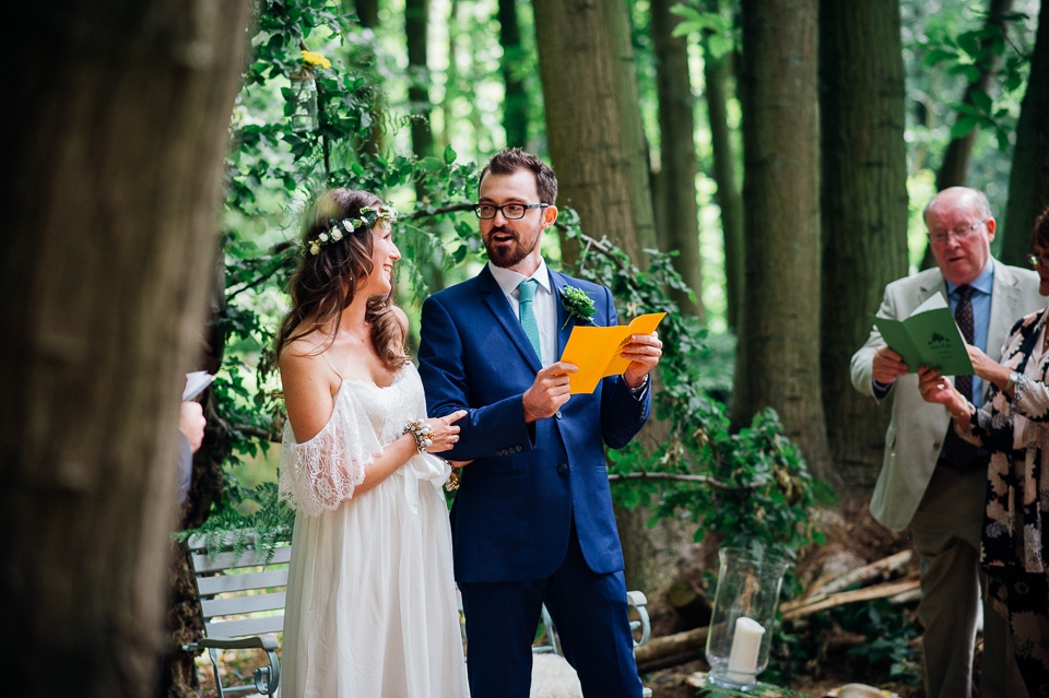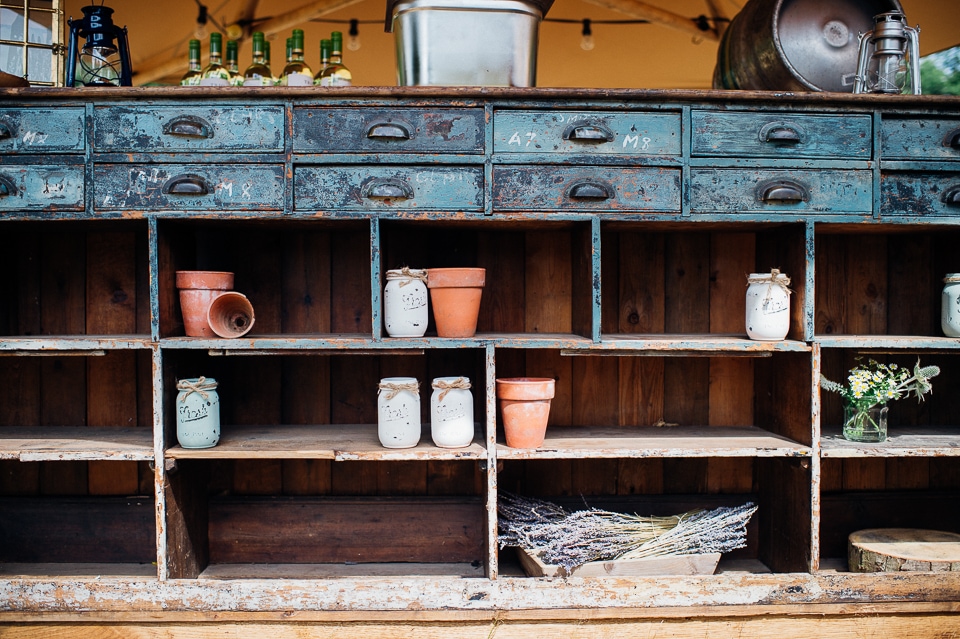 Gosh I’ve been really blessed this summer, I’ve been on beaches and in lakes and now in a woodland! Annie and Drew had a very chilled out ceremony in the woods of Squirrel Lodge (which is run by a very nice man who lights a huge fire) conducted by a friend. Annie got ready at a nearby hotel and wore a lace empire line vintage style dress she’d brought in from Australia, these gorgeous, huge real pearl bracelets, an ivy crown (with her bridesmaids in daisy crowns), and big 70’s style platforms. Drew wore a blue suit with a turquoise skinny tie. During the ceremony the guests sat on hay bales and the backdrop included a natural wood arch. The bar was this incredible antique drawer chest decorated with lavender and terracotta pots. They held their speeches at this wooden cabin which was strewn with lounging chairs, blankets and flowers, before having their dinner in the tipi where the table names were Annie and Drew’s favourite bands. They had a cool soul band to see their guests through the night before they ended the night round a huge fire pit!