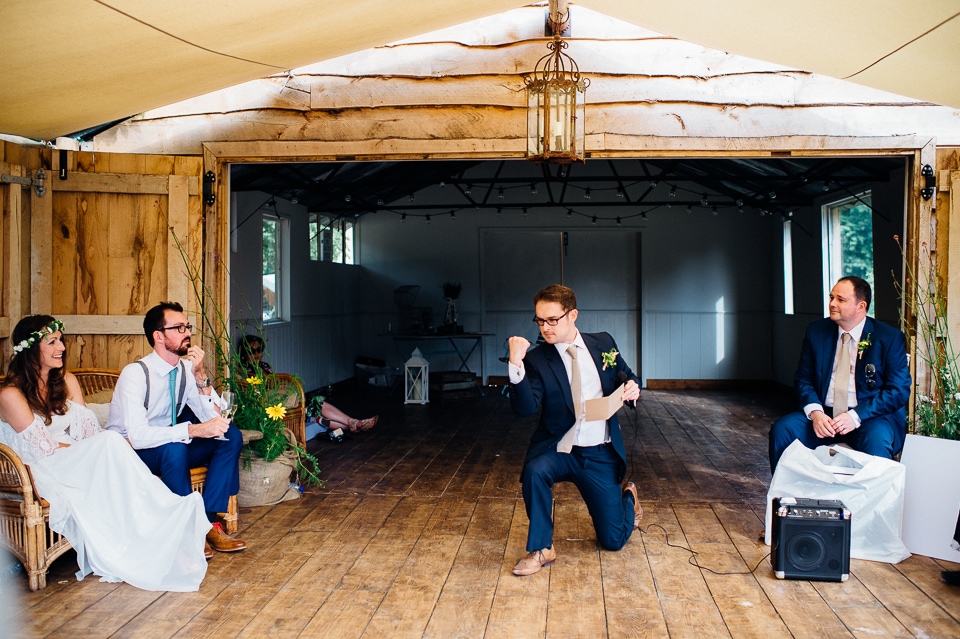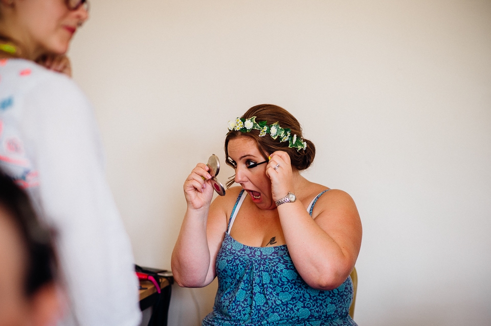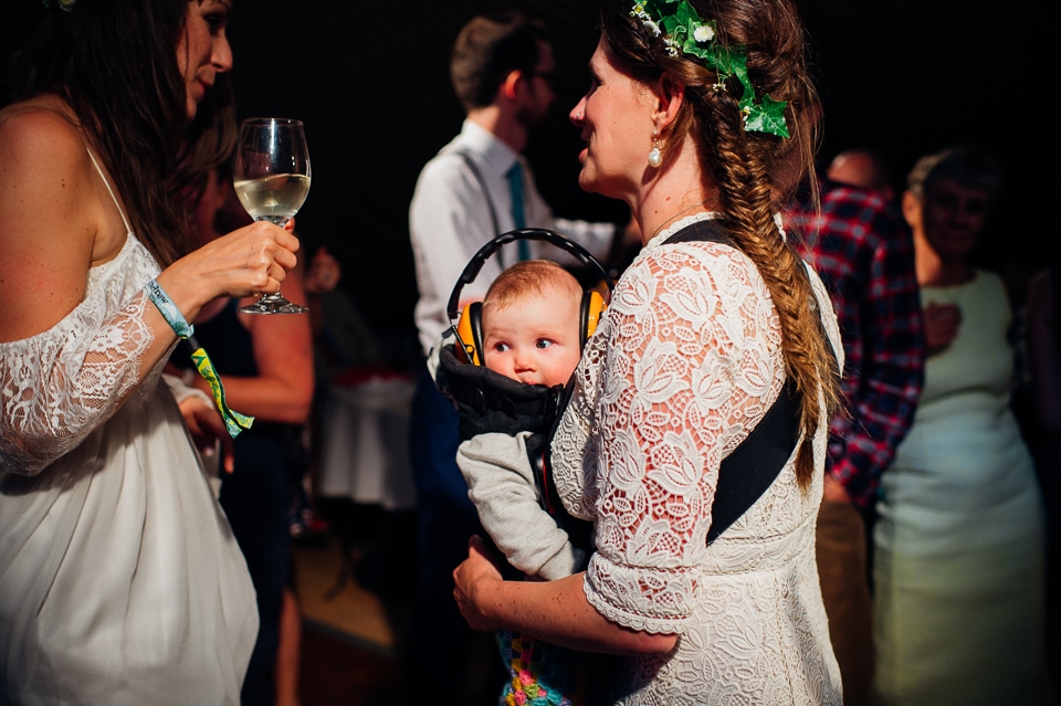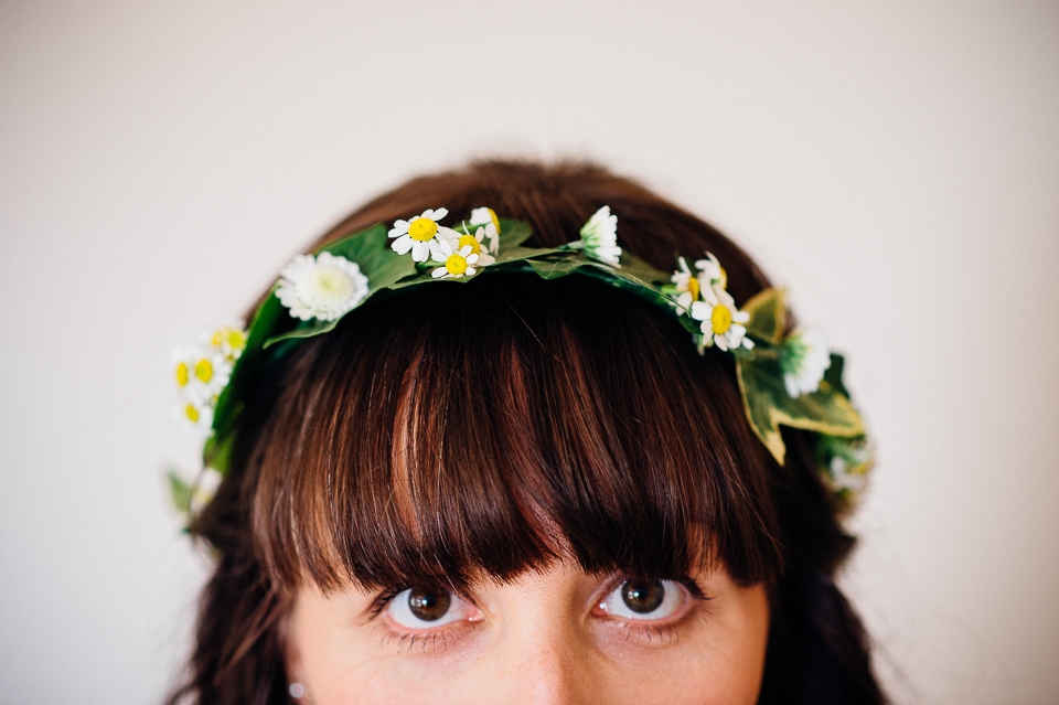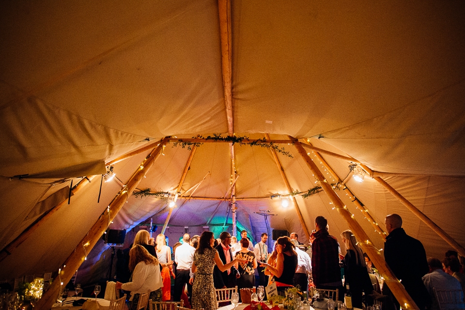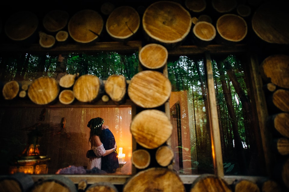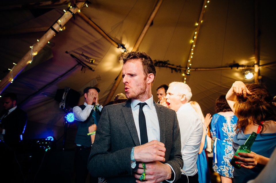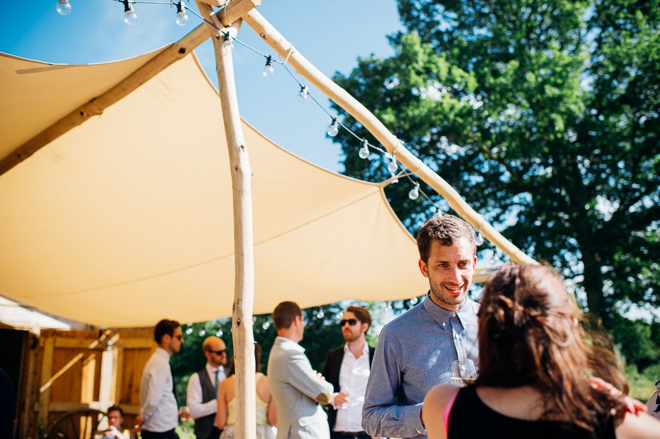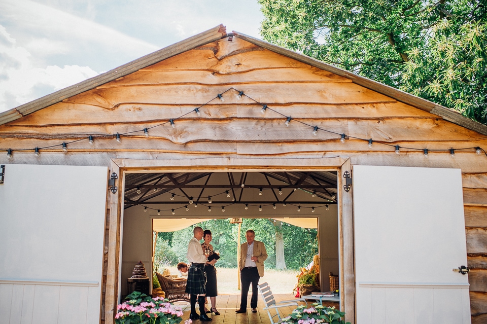 Gosh I’ve been really blessed this summer, I’ve been on beaches and in lakes and now in a woodland! Annie and Drew had a very chilled out ceremony in the woods of Squirrel Lodge (which is run by a very nice man who lights a huge fire) conducted by a friend. Annie got ready at a nearby hotel and wore a lace empire line vintage style dress she’d brought in from Australia, these gorgeous, huge real pearl bracelets, an ivy crown (with her bridesmaids in daisy crowns), and big 70’s style platforms. Drew wore a blue suit with a turquoise skinny tie. During the ceremony the guests sat on hay bales and the backdrop included a natural wood arch. The bar was this incredible antique drawer chest decorated with lavender and terracotta pots. They held their speeches at this wooden cabin which was strewn with lounging chairs, blankets and flowers, before having their dinner in the tipi where the table names were Annie and Drew’s favourite bands. They had a cool soul band to see their guests through the night before they ended the night round a huge fire pit!