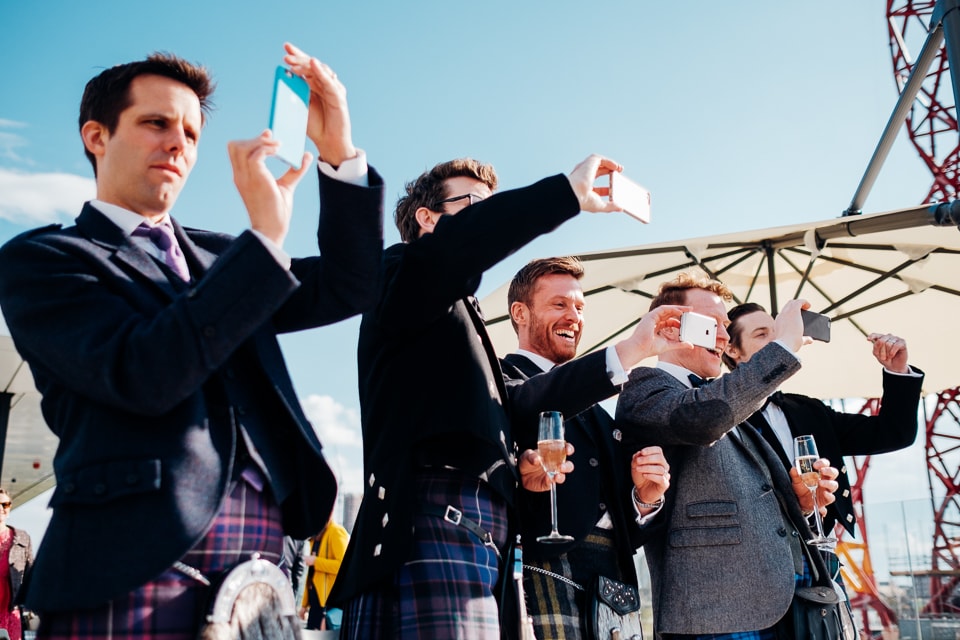 Clare and Kylie had the most wonderful wedding centred around everything they love- the London Olympics, craft brews, dancing and dosas! They didn’t want the prep shot so I met them at the Queen Elizabeth Park in Stratford i.e. the site of the London 2012 Olympics. They played some of the London 2012 highlights pre ceremony to relive one of the best days of their lives (super Saturday!). Instead of letting all the guests sit down and then walking down the aisle, they got ready together, arrived together, chatted to everyone pre ceremony and then stood at the front and watched all their guests be seated, i.e. a reverse processional!! They got married next to the ArcerlorMittal Orbit in a personalised humanist ceremony which included a ribbon tying by all the guests. After having some drinks on the terrace everyone walked over to the Crate Brewshed through the iconic park being led by rainbow flag bearers.