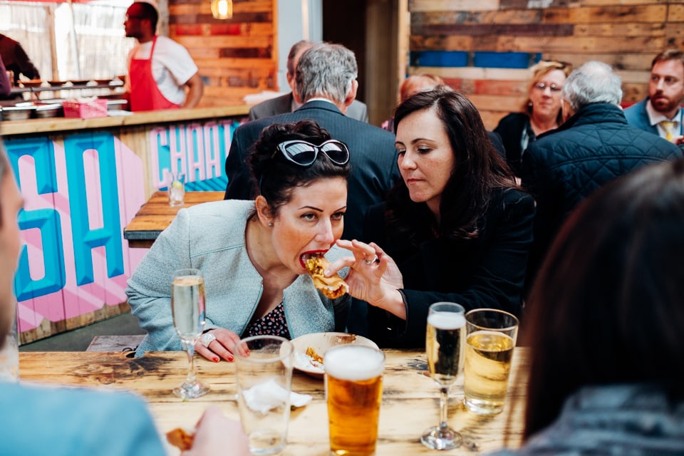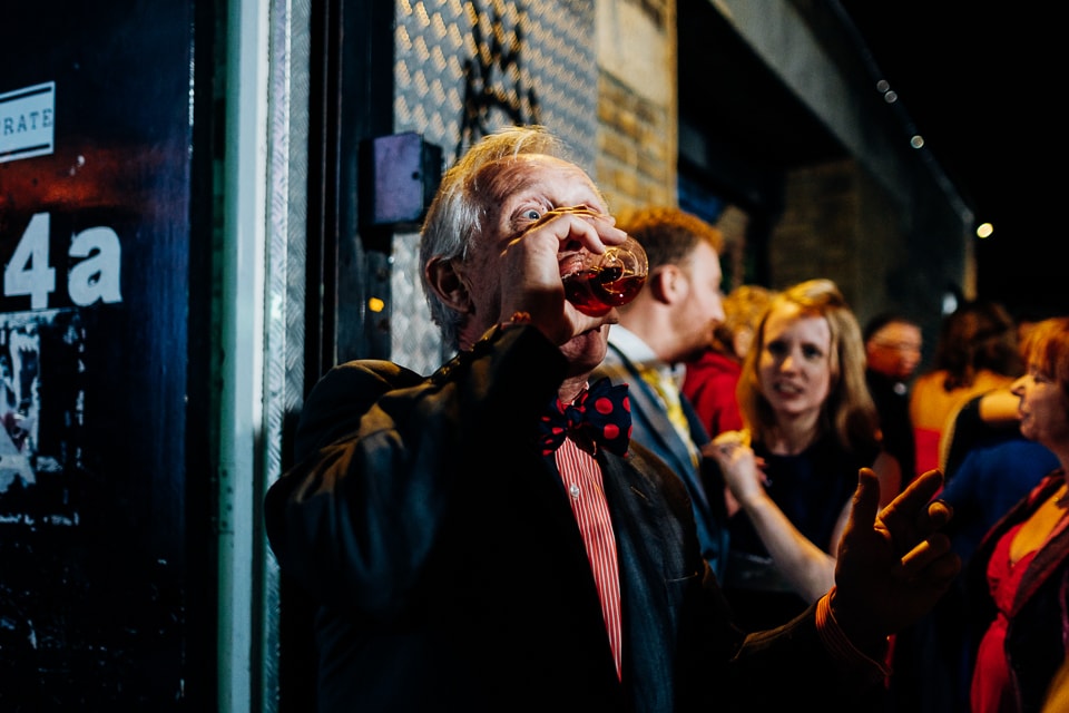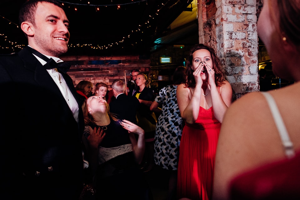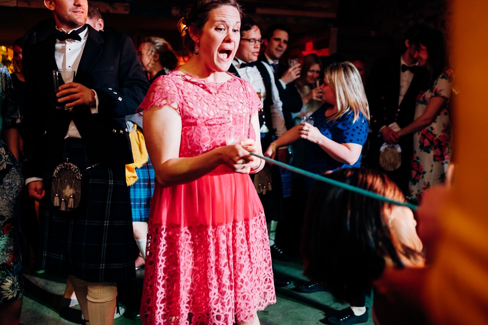 At the Crate Brewshed, (which is if you hadn’t guessed, a brewery!) they had Dosa waiting to serve delicious Indian canapes and dosas for their wedding meal! It was brilliantly casual, everyone just sat wherever they wanted on the benches and basically chilled out! They didn’t have any formal speeches (love the fact they did everything in a way that suited them as people), so after some quick thank yous they hit the dancefloor with some crazy ceilidh times. I think about half of the wedding was fun dancing times, which explains the abundance of dancing shots in this post! An Auld Lang Syne and many beers later they brought out the Jaegercake. Basically a mountain of jaeger bombs for everyone all round. Hence me including booze as a theme description! Once everyone’s physical abilities were impaired, the logical follow up was clearly to play beer pong, repping Team Clare with the reds and Team Kylie with the blue- matching their dresses!
