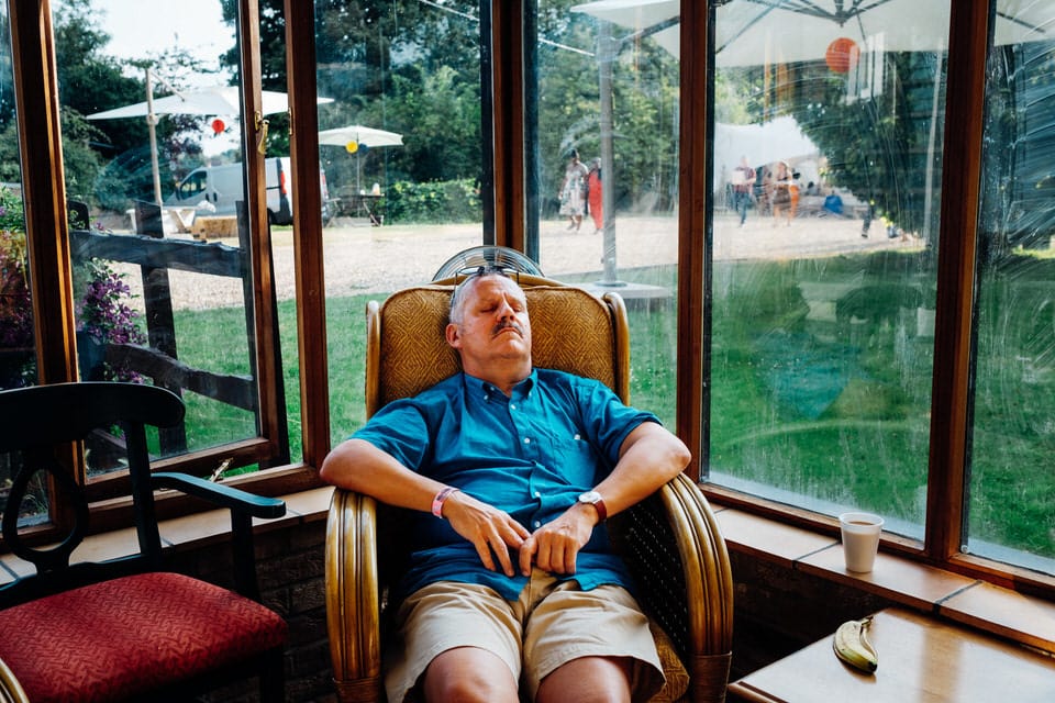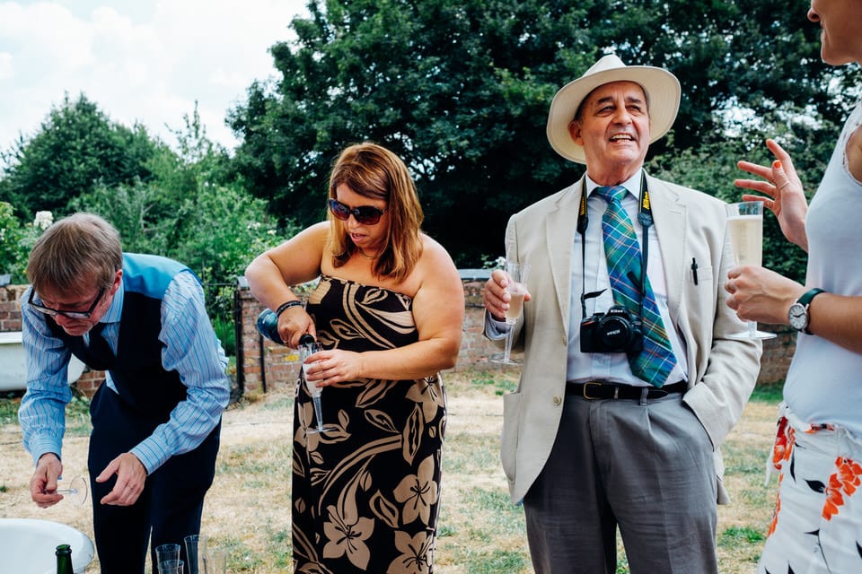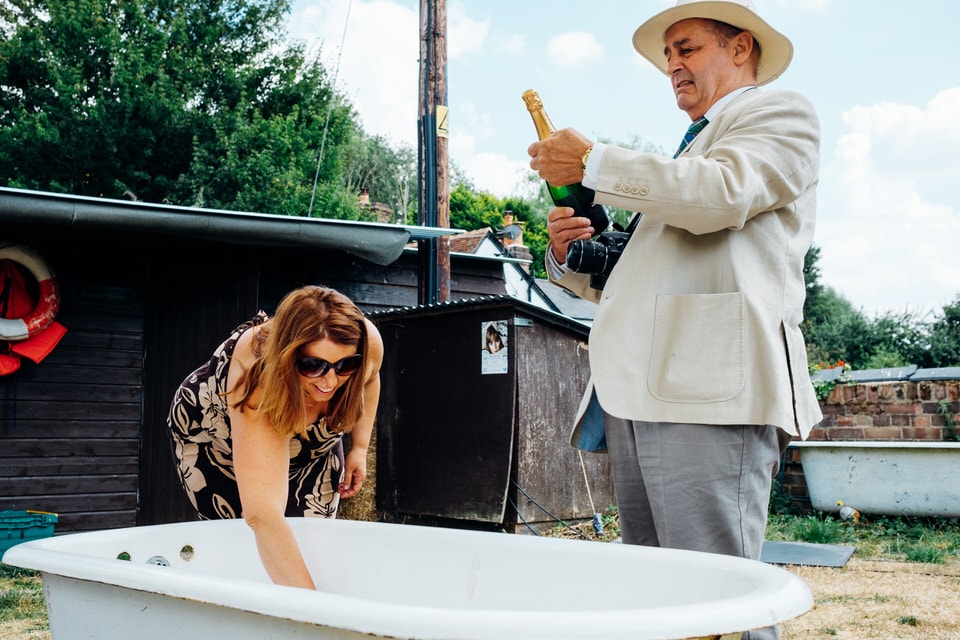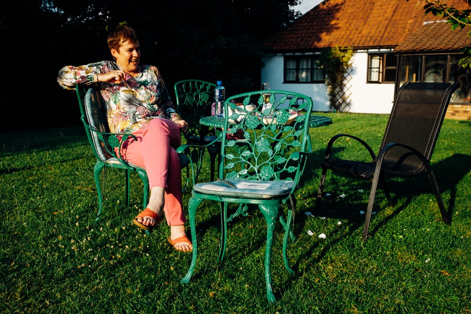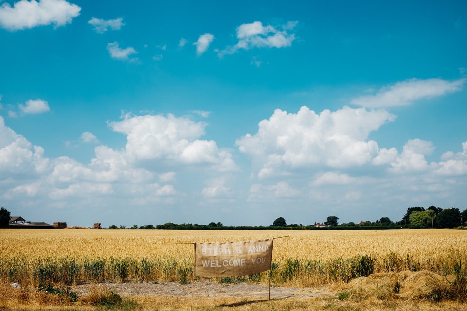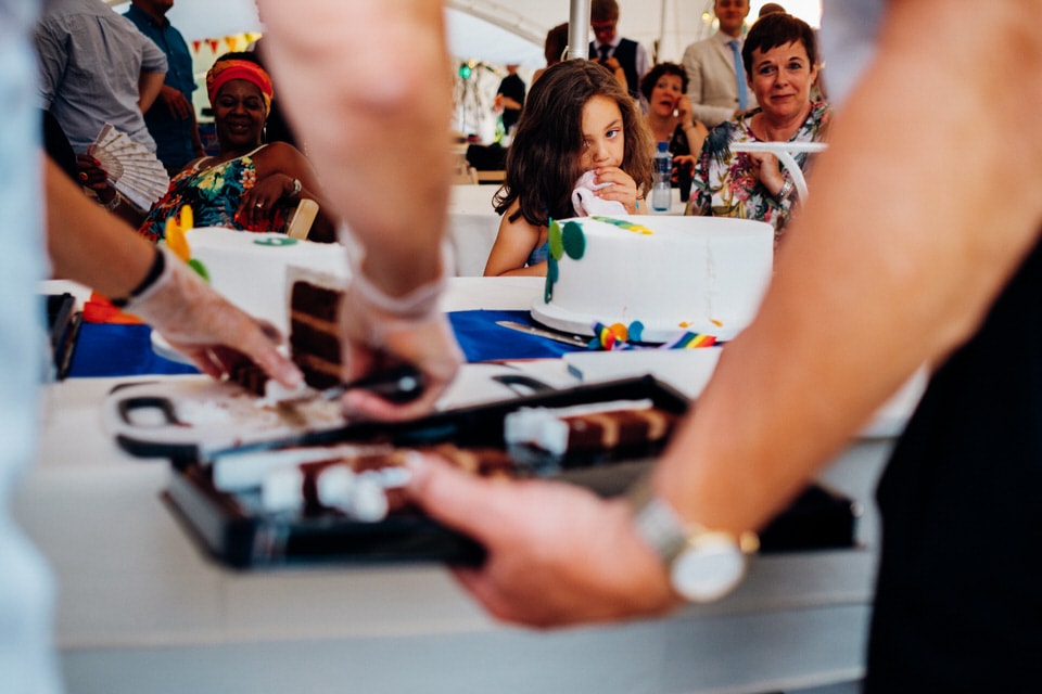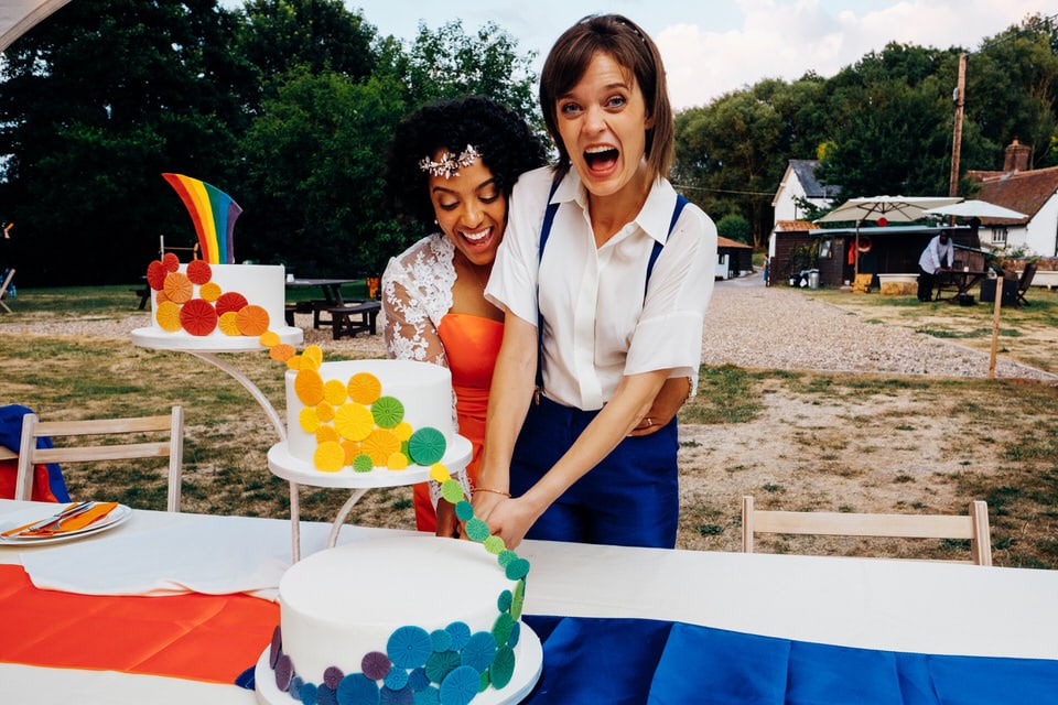 I went up to Bedfordshire the day before to shoot a bit of Anna’s family helping them set up. Bellows Mill is a barn and marquee-in-a-field type venue that sits next to a stunning lake. It has cottages where you can stay on site, making it ideal for an intimate relaxed festival style wedding. Anna and Step hung rainbow coloured Chinese lanterns all over the marquee, and named the tables after important music albums in coloured bottles with descriptions and stories behind the meaning of each album for them. Anna says “We decided early on that good food, good music and fun were of central importance to our wedding and all the fiddly bits (e.g. stationary, paper invitations, seating plans) were less important. We aimed for a relaxed wedding with lots of ‘chill out’ opportunities for guests, which turned out to be very welcome as the day was super super hot! Due to our outfits being less bridal than is traditional; and the day in general being less ‘wedding-y,’ we wanted to be a bit more traditional/bridal in the barn decoration so we went for cream and gold. The theme to our reception and wedding cake was Pride colours; the vibrancy reflected the festival feel which we aimed to bring to the day.