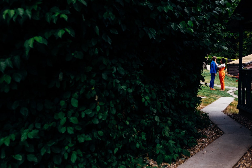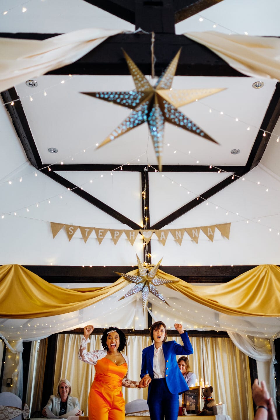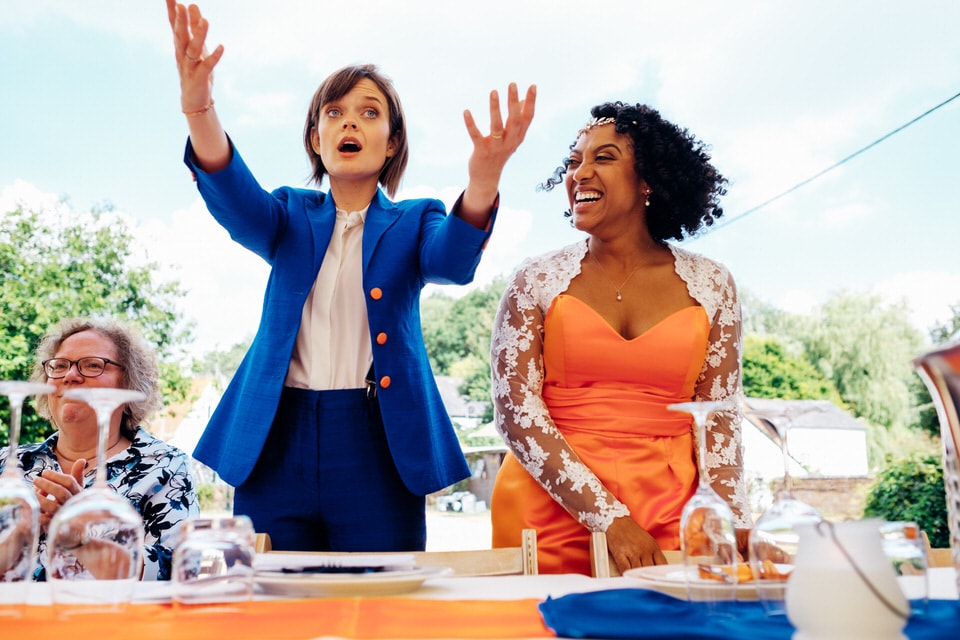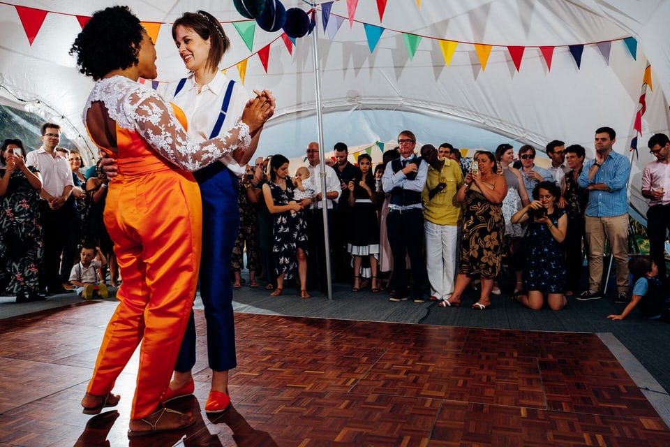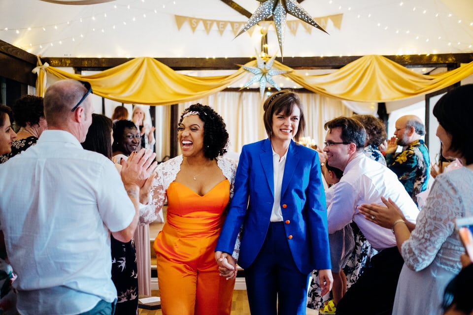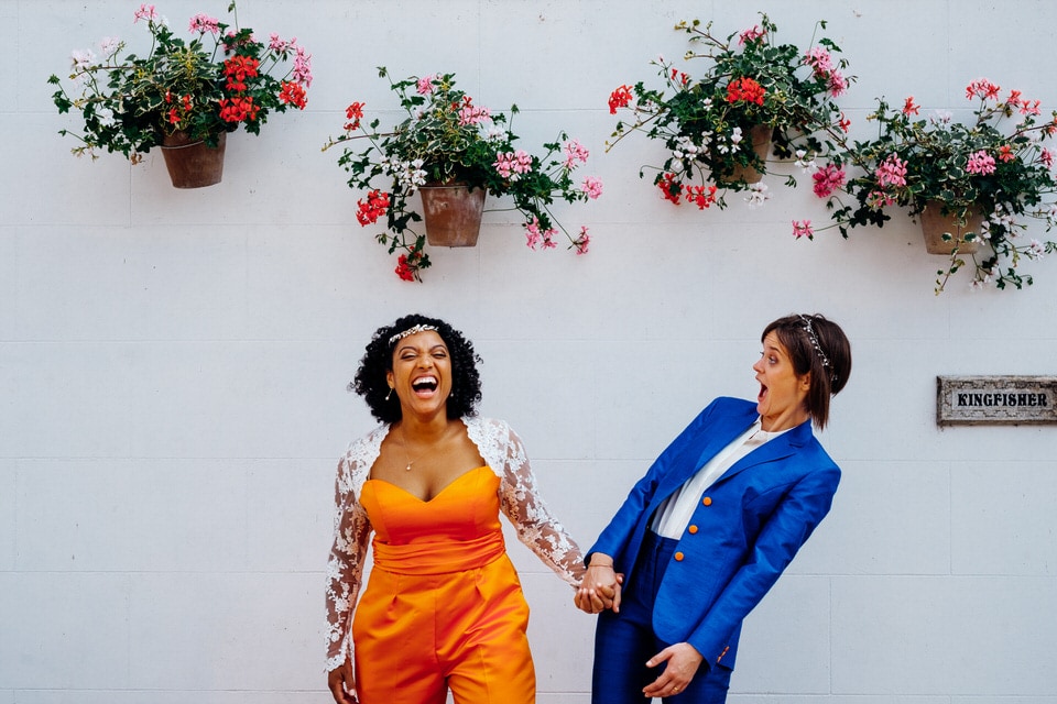Anna and Steph and their family got ready on site, wearing the most awesome orange and blue suit combos! As two women they decided not to go down the traditional ‘one dress, one suit’ route. Anna knew that she wanted to wear blue and was inspired by Janelle Monáe’s style to wear a suit with braces. Steph decided to go for a bridal jumpsuit in her favourite colour, orange (with a touch of lace). For both of them, pockets were an important feature. Anna’s bespoke suit was designed by a fabulous online tailor; iTailor.com. The electric blue silk gave that ‘Pow effect’ that she was looking for and she had orange buttons to match Steph! Steph’s jumpsuit was designed and made by Tina Waller Bridal Wear. She arrived at Tina’s studio with the unique request, which Tina brought to reality. Steph and her mum attended a number of design consultations as the outfit was created and Tina’s welcoming, knowledgeable and fun approach made the whole experience unforgettable. The couple said “seeing each other for the first time in our outfits on the day was a standout moment which Marianne captured so perfectly. “