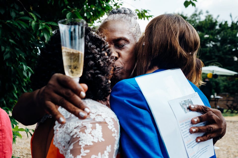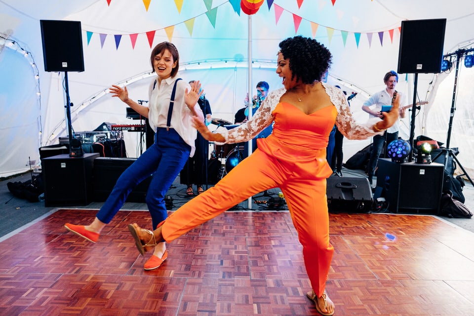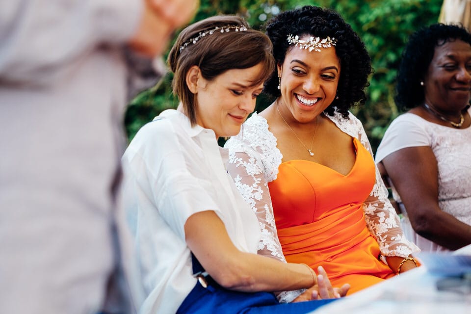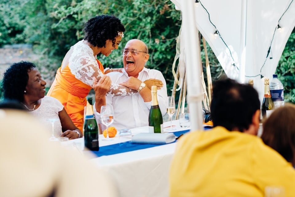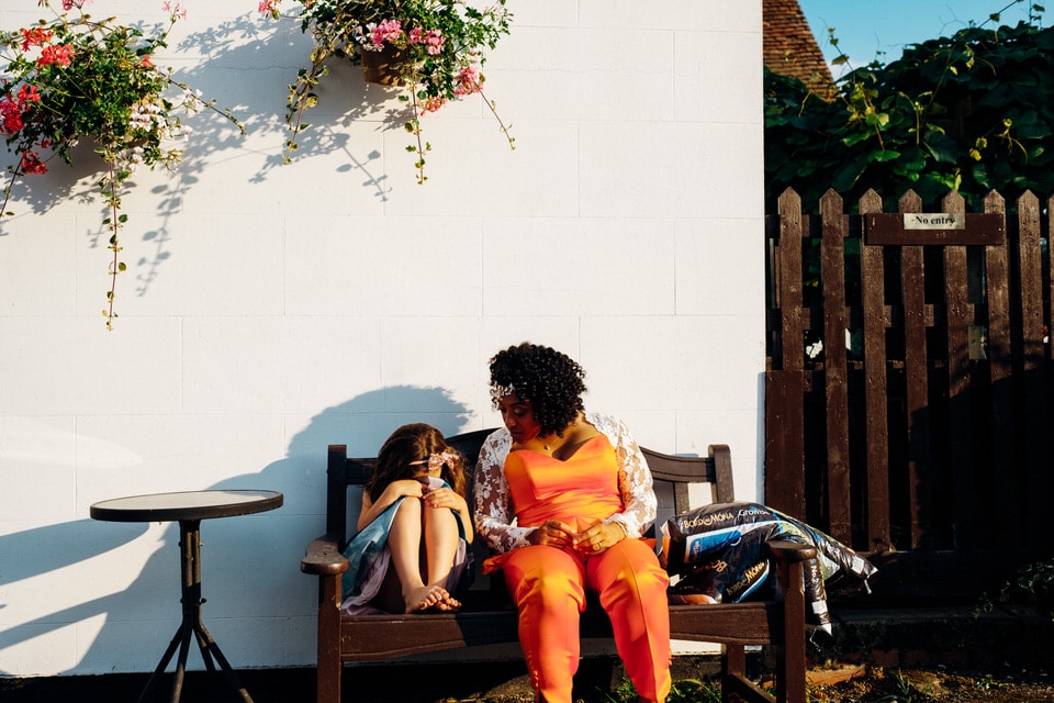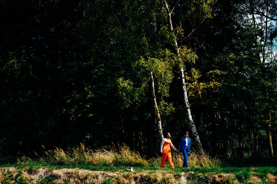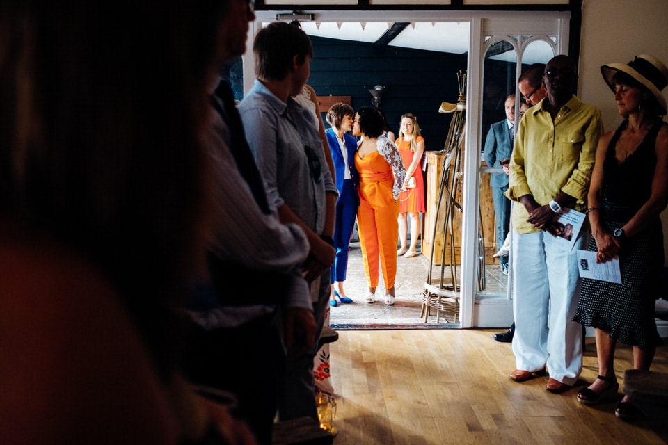 Anna and Steph and their family got ready on site, wearing the most awesome orange and blue suit combos! As two women they decided not to go down the traditional ‘one dress, one suit’ route. Anna knew that she wanted to wear blue and was inspired by Janelle Monáe’s style to wear a suit with braces. Steph decided to go for a bridal jumpsuit in her favourite colour, orange (with a touch of lace). For both of them, pockets were an important feature. Anna’s bespoke suit was designed by a fabulous online tailor; iTailor.com. The electric blue silk gave that ‘Pow effect’ that she was looking for and she had orange buttons to match Steph! Steph’s jumpsuit was designed and made by Tina Waller Bridal Wear. She arrived at Tina’s studio with the unique request, which Tina brought to reality. Steph and her mum attended a number of design consultations as the outfit was created and Tina’s welcoming, knowledgeable and fun approach made the whole experience unforgettable. The couple said “seeing each other for the first time in our outfits on the day was a standout moment which Marianne captured so perfectly. “