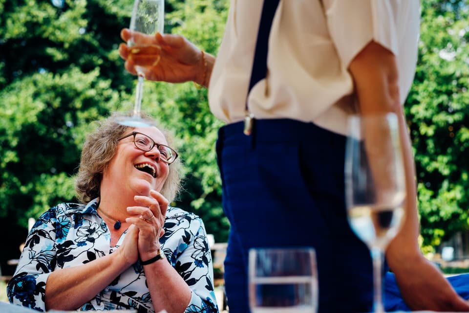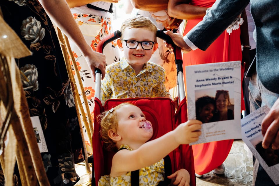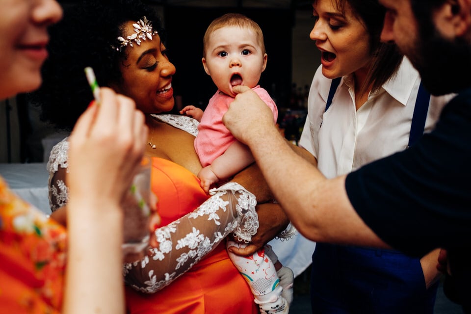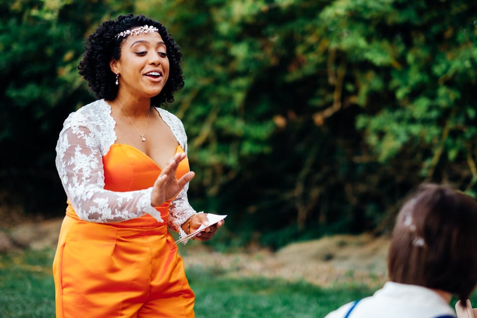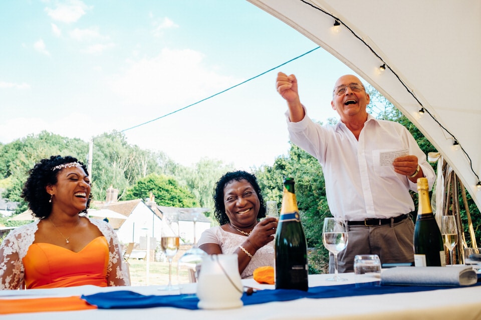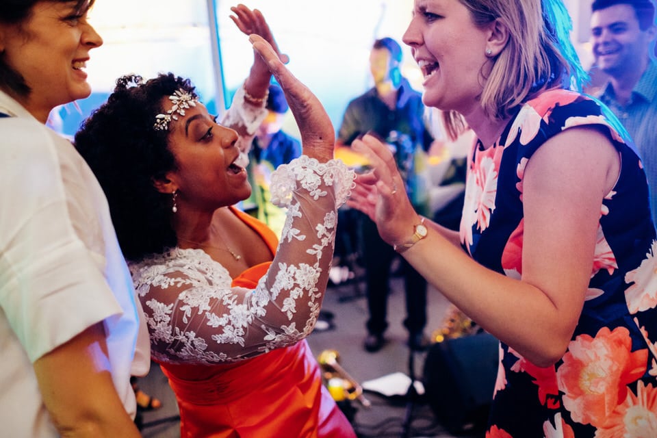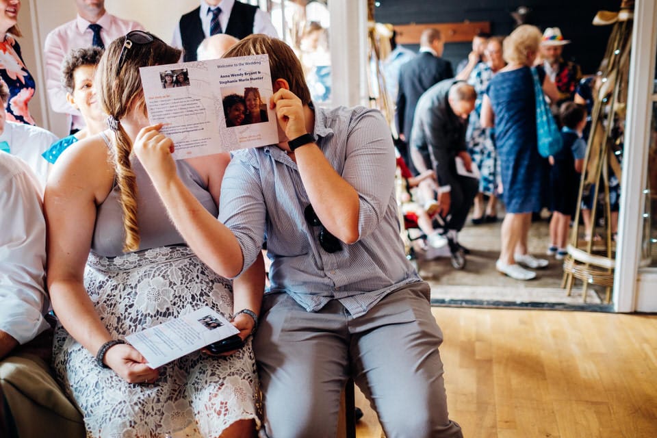 Anna and Steph and their family got ready on site, wearing the most awesome orange and blue suit combos! As two women they decided not to go down the traditional ‘one dress, one suit’ route. Anna knew that she wanted to wear blue and was inspired by Janelle Monáe’s style to wear a suit with braces. Steph decided to go for a bridal jumpsuit in her favourite colour, orange (with a touch of lace). For both of them, pockets were an important feature. Anna’s bespoke suit was designed by a fabulous online tailor; iTailor.com. The electric blue silk gave that ‘Pow effect’ that she was looking for and she had orange buttons to match Steph! Steph’s jumpsuit was designed and made by Tina Waller Bridal Wear. She arrived at Tina’s studio with the unique request, which Tina brought to reality. Steph and her mum attended a number of design consultations as the outfit was created and Tina’s welcoming, knowledgeable and fun approach made the whole experience unforgettable. The couple said “seeing each other for the first time in our outfits on the day was a standout moment which Marianne captured so perfectly. “