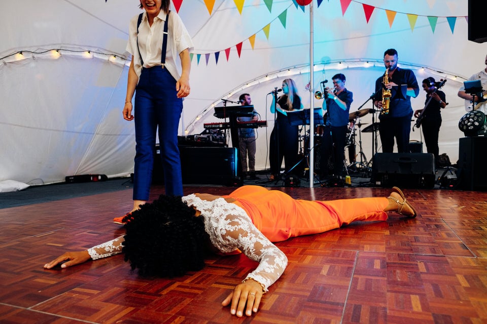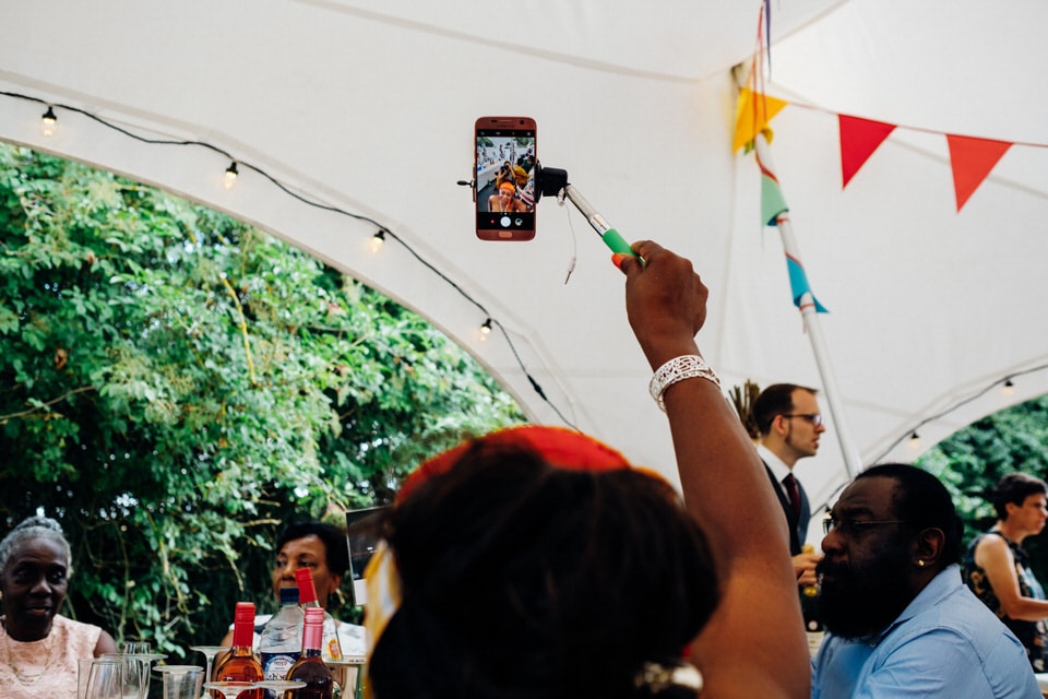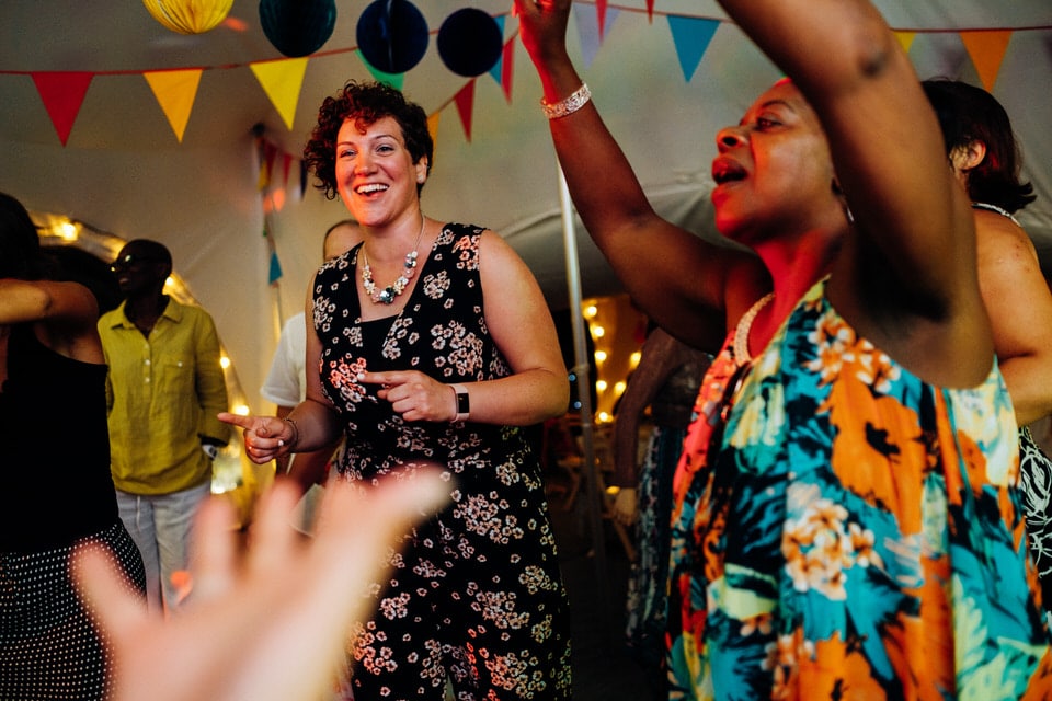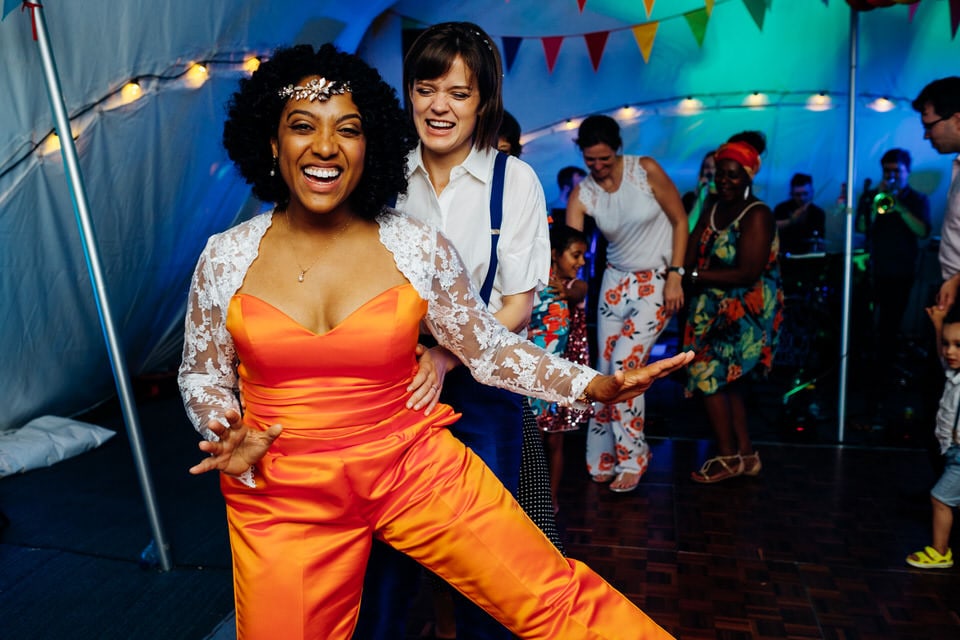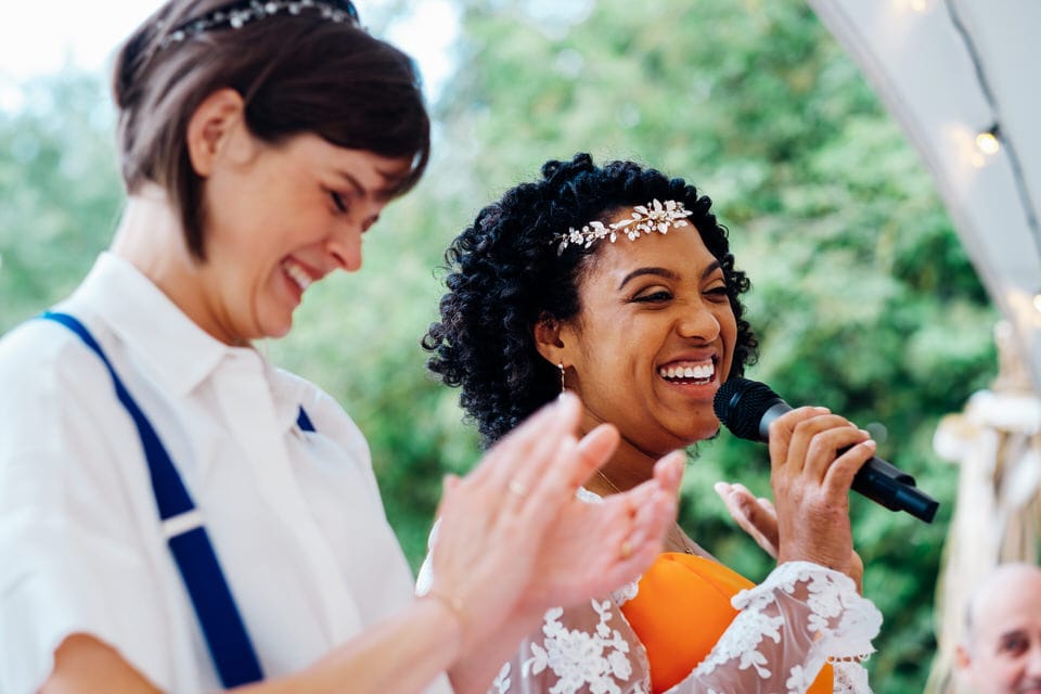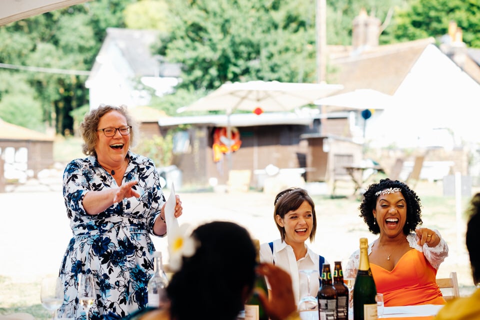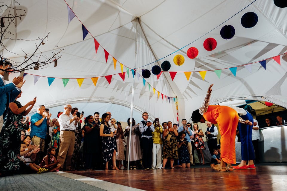 After a few drinks, the guests sat down in the stunning marquee where they enjoyed a welcome speech from the couple, followed by a Trinidadian feast by the lakeside. Trini Caribbean Catering made a mouth-watering menu of all their Trinidadian favourites, including the best dhal puri roti and doubles they’ve ever had! After dinner they had more emotional speeches, vegan puddings by Vinnie and their Godmother Christine, floral cupcakes by their friend Sukanaya and prideful wedding cake. Steph paid homage to Anna’s love of slam poetry and give her speech in the slam poetry style with everyone clicking at the moments of appreciation!