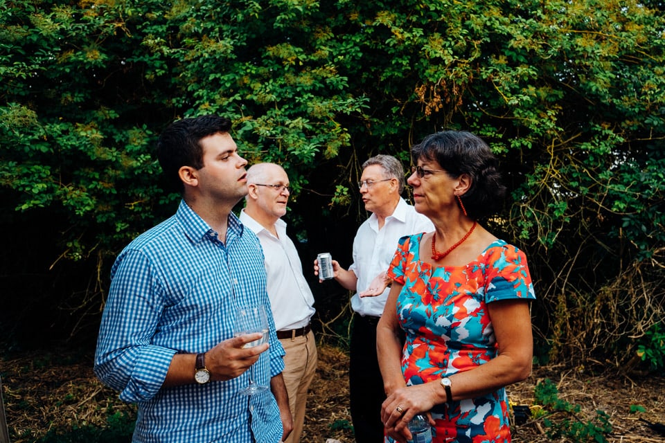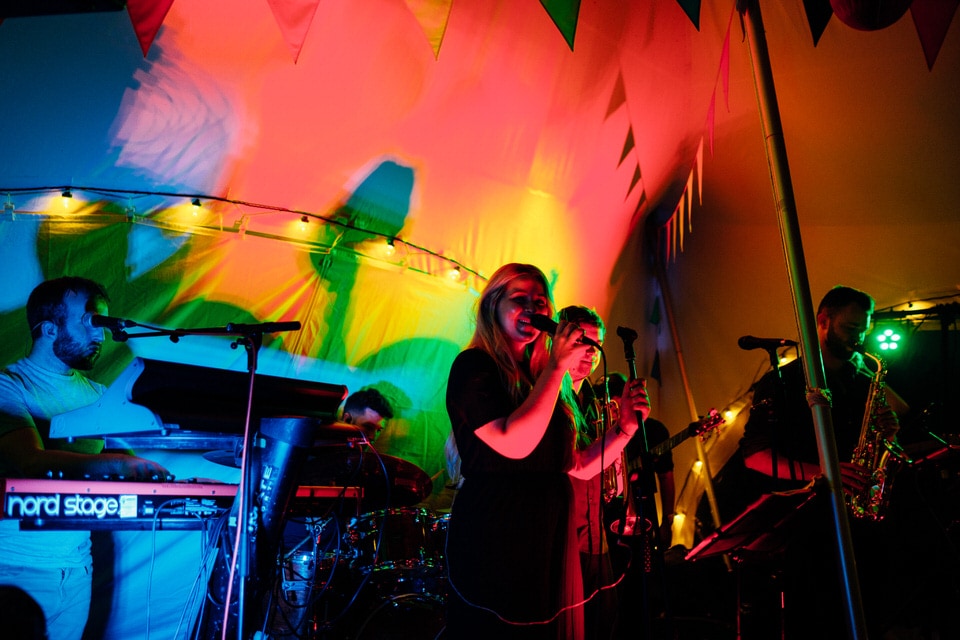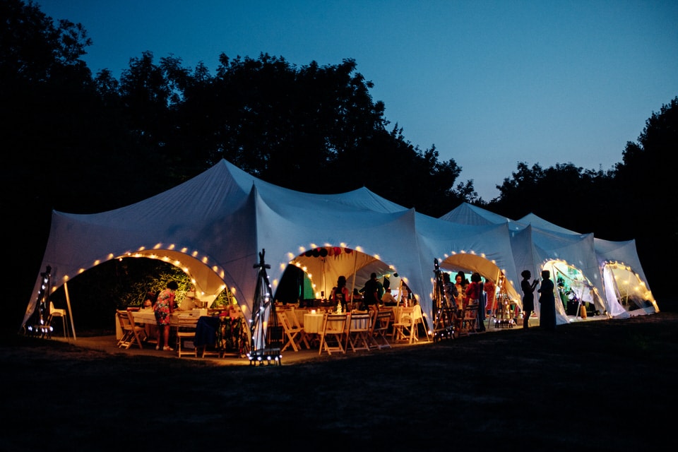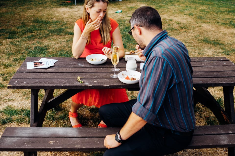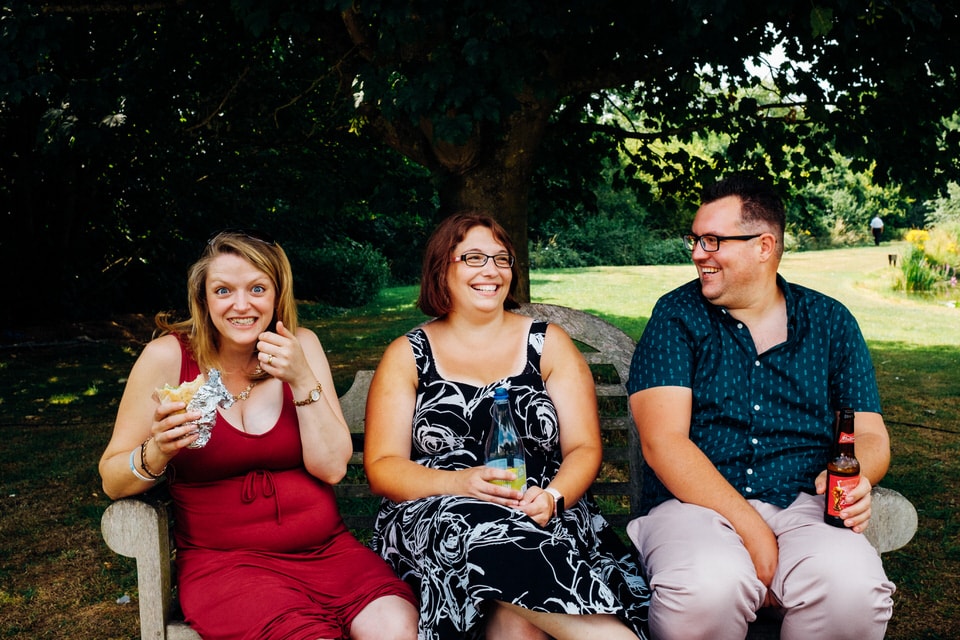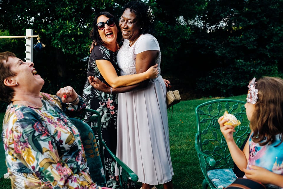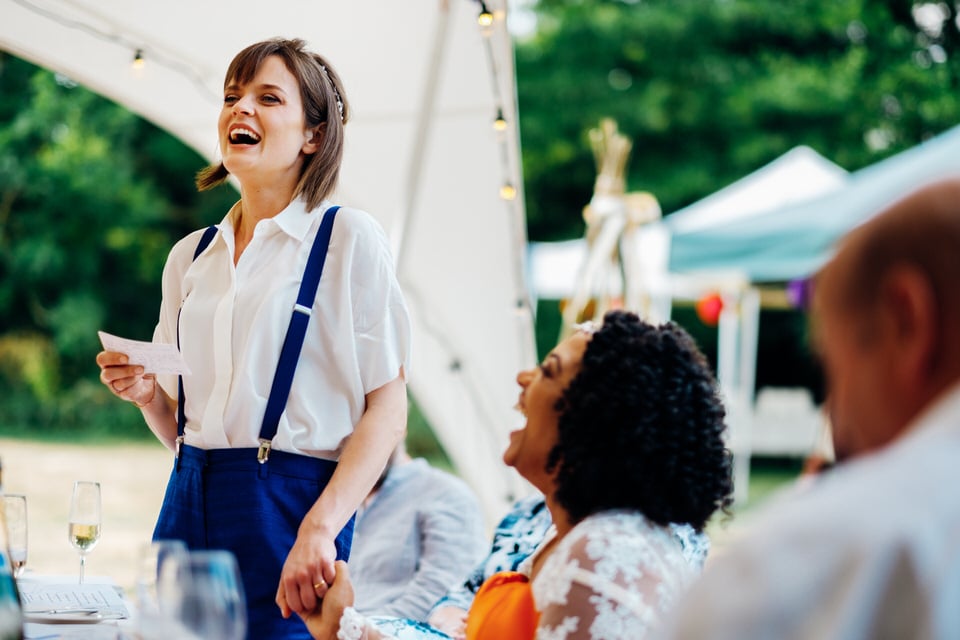 After a few drinks, the guests sat down in the stunning marquee where they enjoyed a welcome speech from the couple, followed by a Trinidadian feast by the lakeside. Trini Caribbean Catering made a mouth-watering menu of all their Trinidadian favourites, including the best dhal puri roti and doubles they’ve ever had! After dinner they had more emotional speeches, vegan puddings by Vinnie and their Godmother Christine, floral cupcakes by their friend Sukanaya and prideful wedding cake. Steph paid homage to Anna’s love of slam poetry and give her speech in the slam poetry style with everyone clicking at the moments of appreciation!