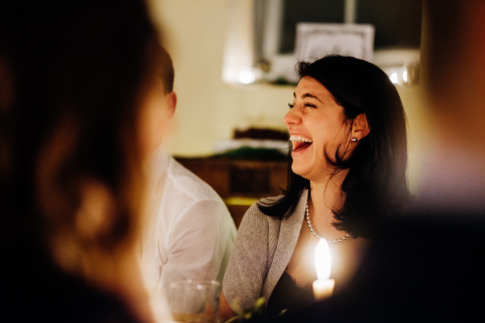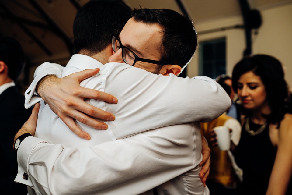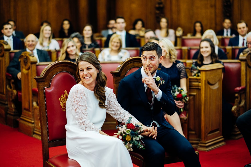 Eve and Gary had two ceremonies on their wedding day as Gary is Jewish and Eve isn’t. They started off with a civil ceremony at Islington Town Hall and then at their reception venue in Stoke Newington, Abney Public Hall, they had a Jewish ceremony with two of their friends as Rabbis. Eve got ready at their flat into an elegant Charlie Brear dress complete with Eve’s gran’s fur and vibrant red Jimmy Choos. After their short civil ceremony everyone boarded a red routemaster bus and headed to Abney Public Hall. Eve, Gary and I jumped off the bus early to take a few shots around the corner at an old Antiques courtyard. Back at Abney Public Hall four of their friends held the chuppah and another two friends conducted the ceremony. They had musicians play Israeli music during the ceremony and after Gary smashed the glass they kicked off Jewish dancing including the hora, jumping and a lot of flinging. Following this they had dinner interlaced with speeches, a coffee martini bar and the cutting of the cake which was baked by Eve’s mum. The music in the evening was brought by various DJ friends with a proper garage throwback!