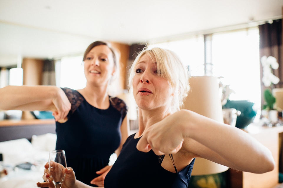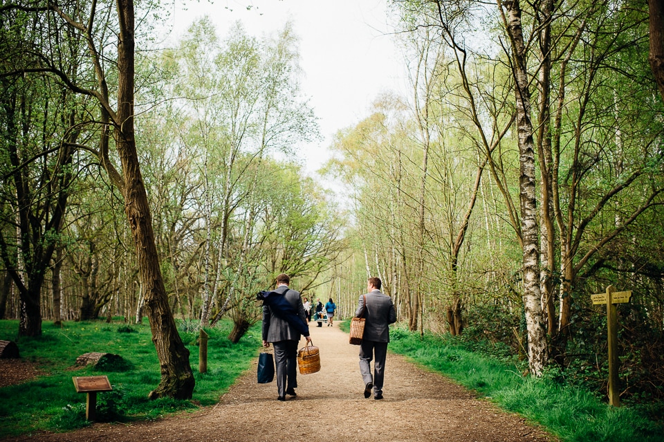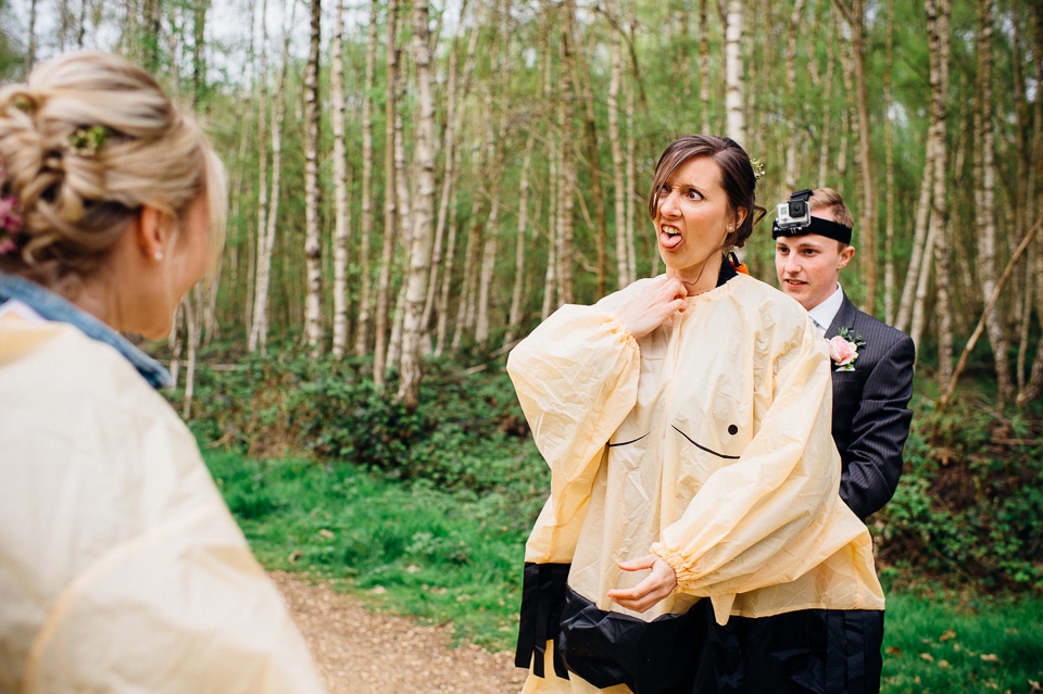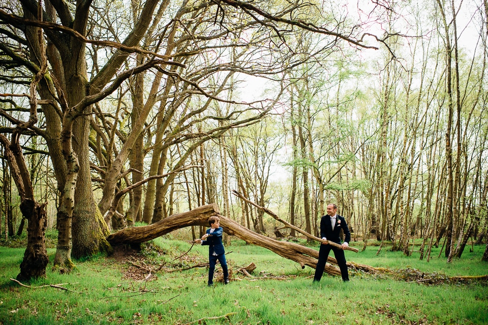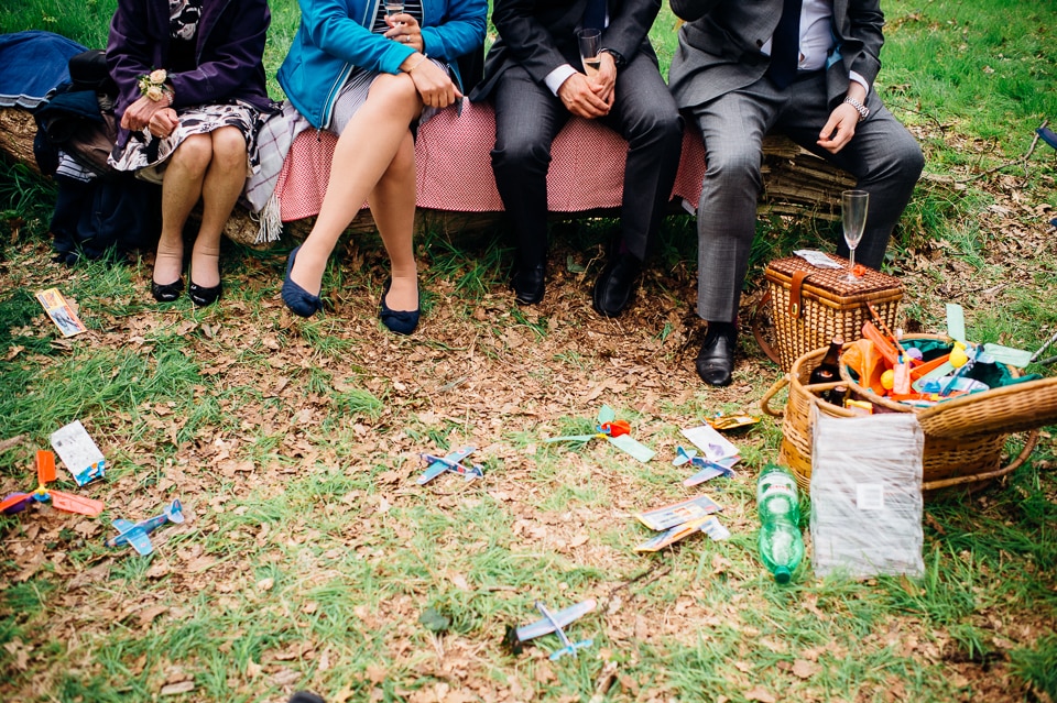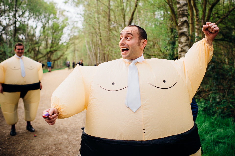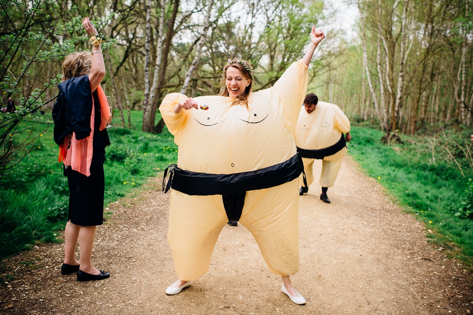 Although the big surprise picnic in the woods was for the guests, Harriet and Dave also received a surprise of their own when Harriet’s brother, who was in charge of some woodland games, produced these hilarious sumo suits and declared it was time for the sumo (creme) egg and spoon race! As Harriet is a photographer as well, they were very keen to make the time for some proper couple photos in the woods, and I suggested we also go for a wicked shot where they got mercilessly attacked by polystyrene planes. Love it!