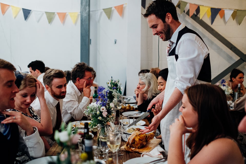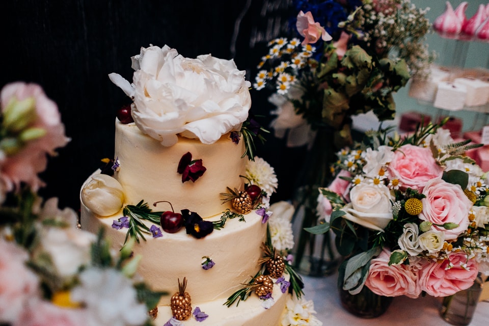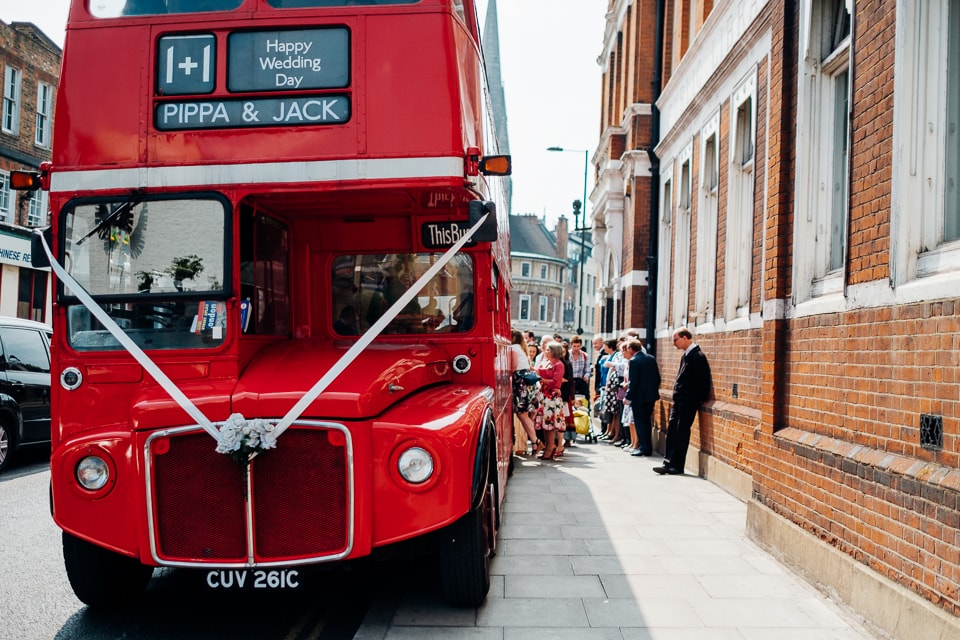 Pippa and Jack are, by their friend’s declaration, the cutest couple ever! Pippa didn’t fall short of the title with her baby pink classic vintage Ferragamo heels and cute A line lace dress with a home made large pink bow made by Pippa’s mum. Jack wore an equally cute blue tweed suit with a floral blue tie to match! The bridesmaids wore A line polka dot dresses. They had a civil ceremony at the Stoke Newington Town Hall before jumping on a classic red London double decker bus with a little twist of a conductor clipping all the personalised Pippa and Jack bus tickets! They then rode the bus to a private garden which was decorated with gorgeous bunting and has a little musical quartet playing! After drinks and canapes in the lovely garden they got on the bus again to The Russet next to Hackney Downs Studios, which is coincidentally where my good friends Mazi Mas held their social enterprise/restaurant! Here they had whole roast chicken for dinner carved up by the guests followed by a stunning dessert table covered with the most gorgeous marshmallows, kisses and golden blackberry and floral decorated cake from Lily Vanilli.