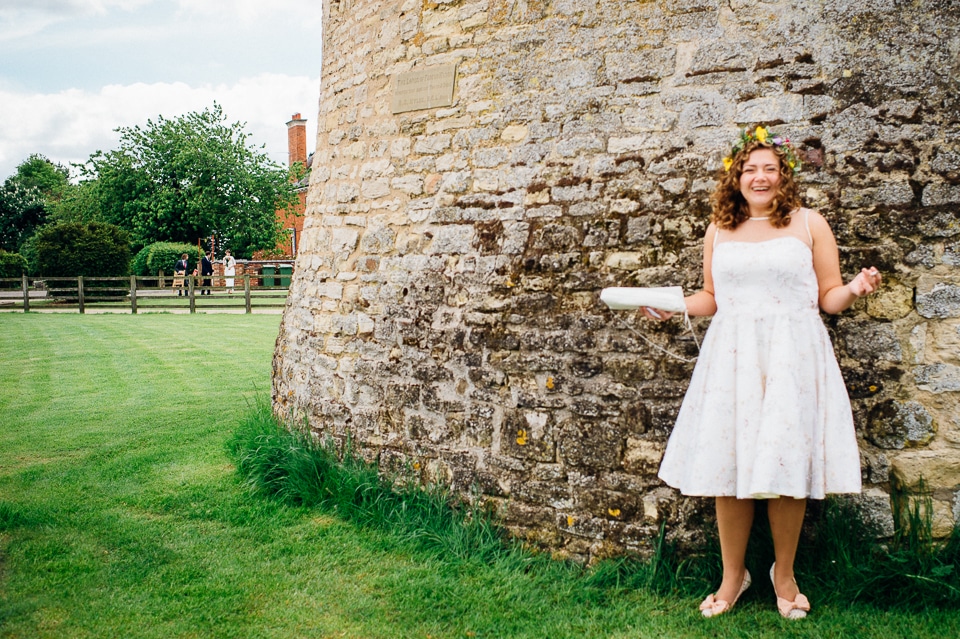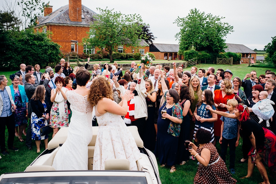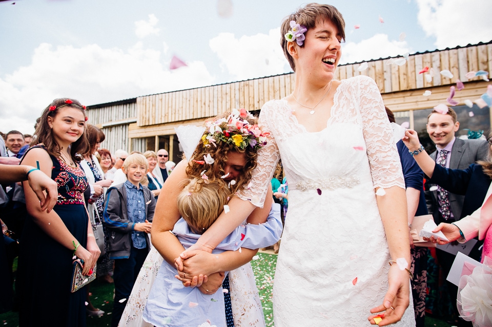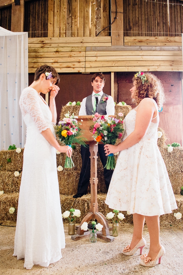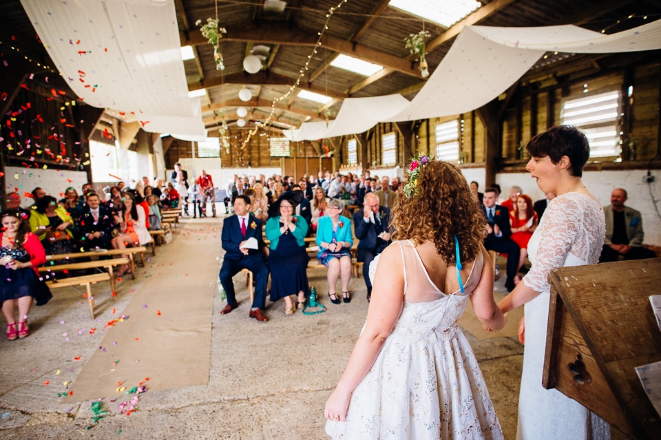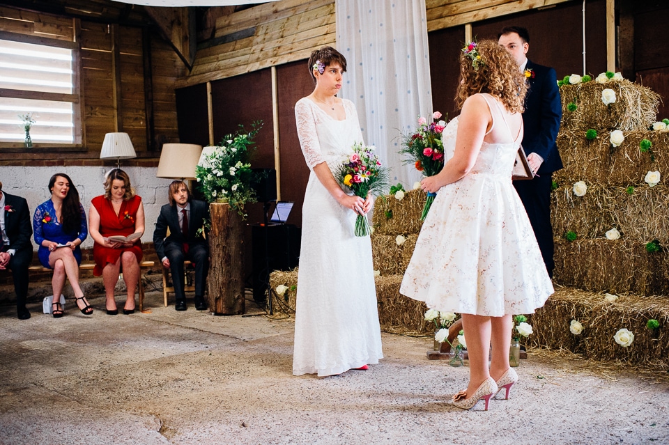 I was recommended to Rosie and Laura by their friend and my fellow wedding photographer Nikki Cooper, so I want to start by saying thank you to Nikki for the awesome wedding opportunity! I started the day at Rosie’s where she was getting into a beaded dress her Aunt handmade for her, a bright floral crown and crochet Irregular Choice shoes. Their handfasting ceremony was held at Furtho Manor Farm in the barn which they beautifully decorated with white roses, glass cola bottles of flowers, white drapes and fairy lights. Laura was already getting ready at Furtho and it was really important for the two ladies that they enter the ceremony as equals, rather than one of them waiting at the top for the other, which I really respected. When Laura was going to her entrance, I caught Rosie having a sneaky pre ceremony ciggie! There were a lot of emotions from both ladies, their friends and families AND their officiant who was their good friend Dylo (pronounced die-low *injoke alert*). At the end of the ceremony they let off confetti cannons, and in case that wasn’t enough hair debris they also had a ton of confetti chucked at them as they left the barn!