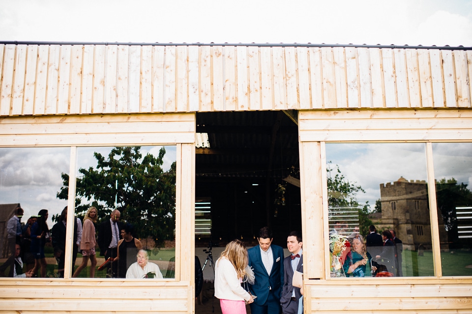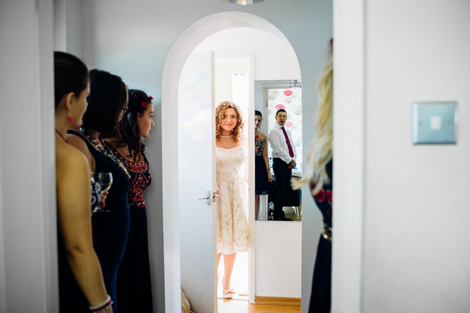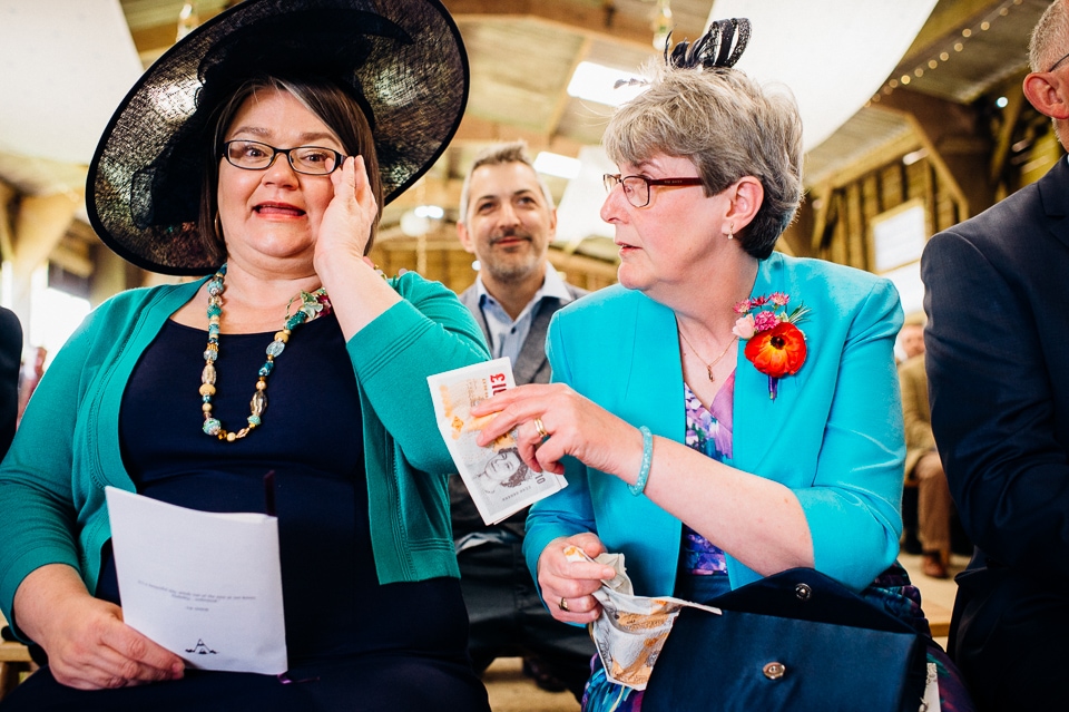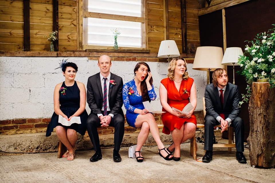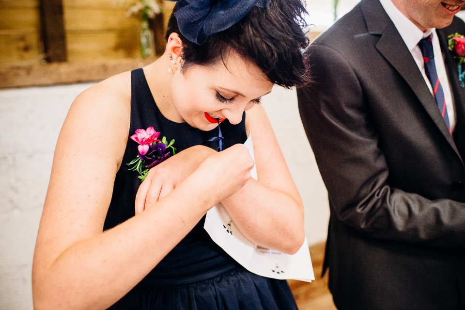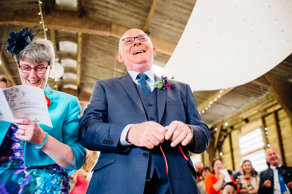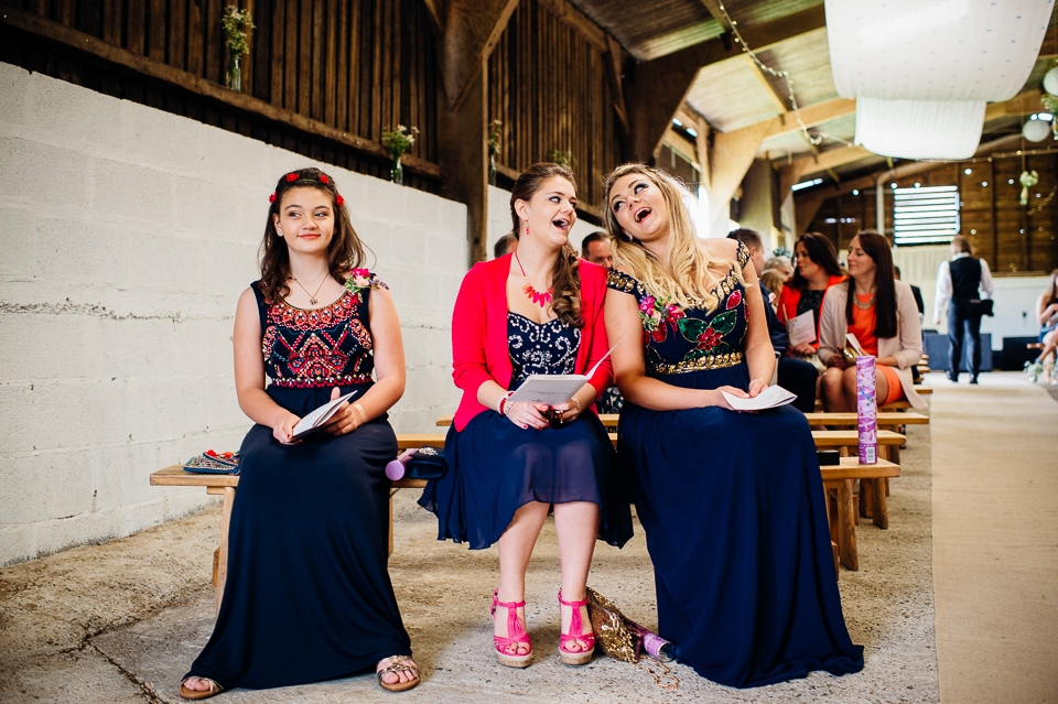 I was recommended to Rosie and Laura by their friend and my fellow wedding photographer Nikki Cooper, so I want to start by saying thank you to Nikki for the awesome wedding opportunity! I started the day at Rosie’s where she was getting into a beaded dress her Aunt handmade for her, a bright floral crown and crochet Irregular Choice shoes. Their handfasting ceremony was held at Furtho Manor Farm in the barn which they beautifully decorated with white roses, glass cola bottles of flowers, white drapes and fairy lights. Laura was already getting ready at Furtho and it was really important for the two ladies that they enter the ceremony as equals, rather than one of them waiting at the top for the other, which I really respected. When Laura was going to her entrance, I caught Rosie having a sneaky pre ceremony ciggie! There were a lot of emotions from both ladies, their friends and families AND their officiant who was their good friend Dylo (pronounced die-low *injoke alert*). At the end of the ceremony they let off confetti cannons, and in case that wasn’t enough hair debris they also had a ton of confetti chucked at them as they left the barn!