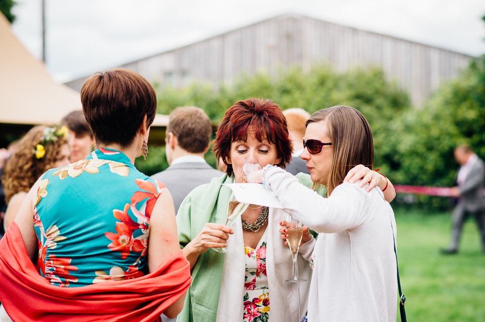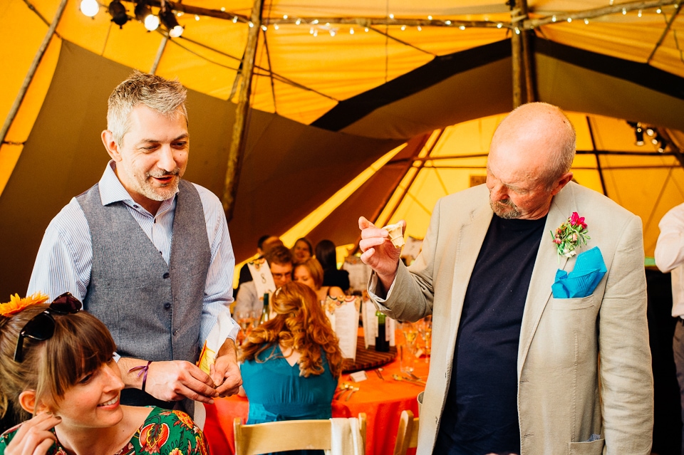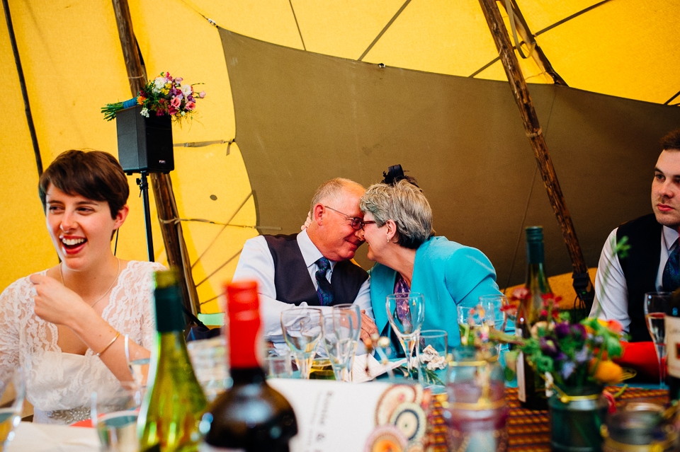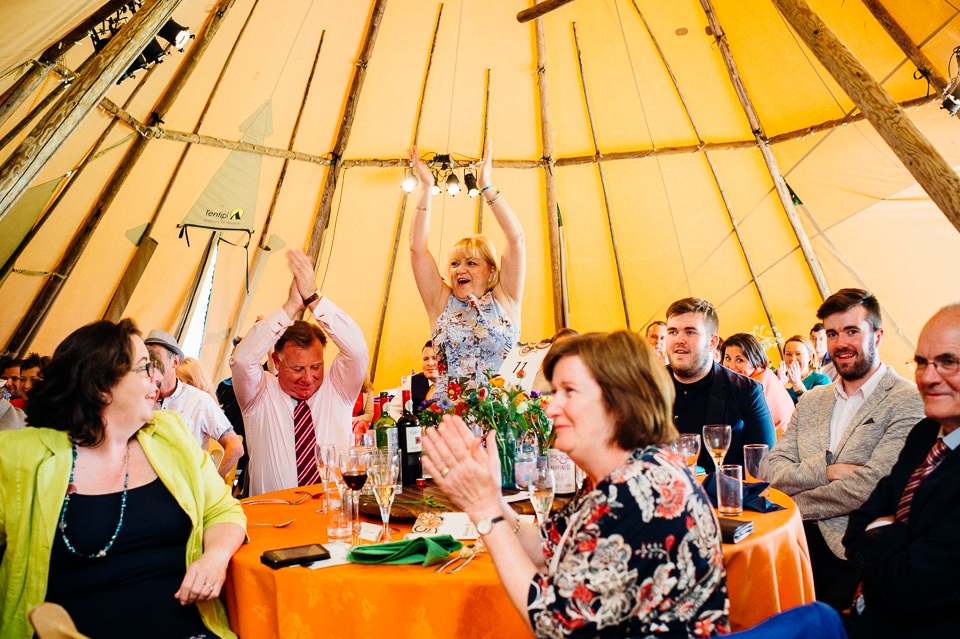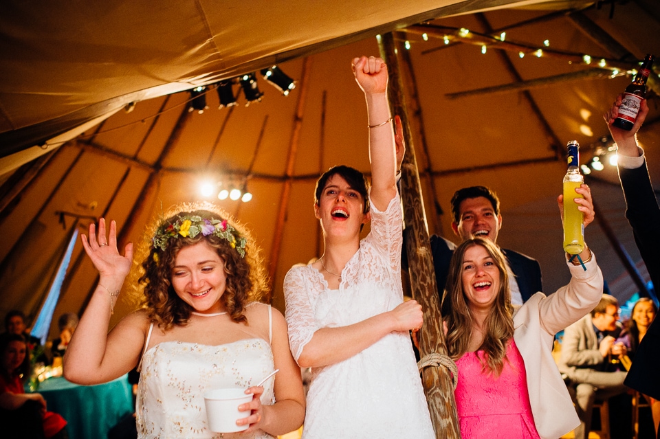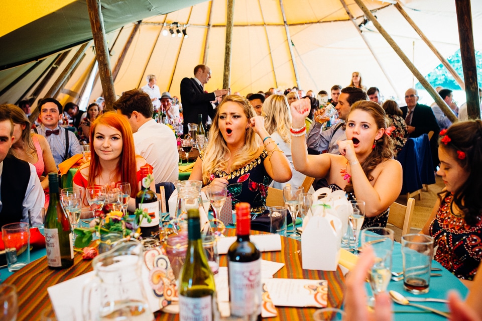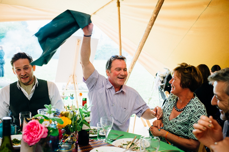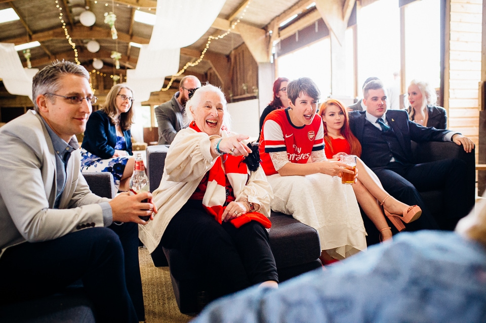The reception was held in a tipi set up in the next field. They had decorated it with beautiful bright silky materials, wild flowers and beaded colourful glassware. As Laura and her family are huge Arsenal fans, the match was aired so the drinks reception was both a reception and a footie session. They had a barbecue and an ice cream van for dessert which was followed by very emotional speeches. After that it descended into the madness I know and love where Great Grandma caught the double bouquet toss from a VW and then… wait let me linger for a second because this story is so awesome it deserves to be included: When I shared the bouquet toss shot on my FB page (this is all public by the way so it’s fine for me to share), G-Gma, the bad ass boss lady she is, posted this-