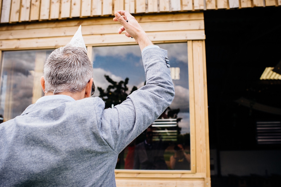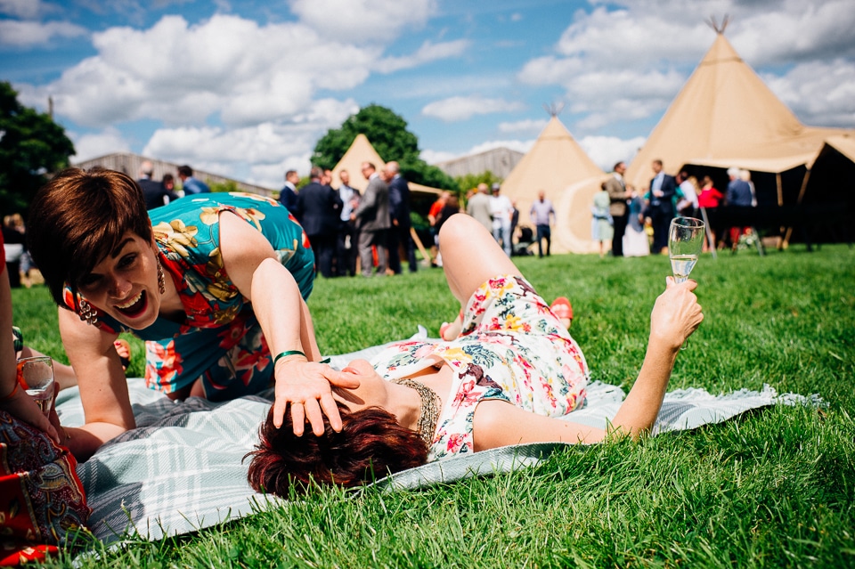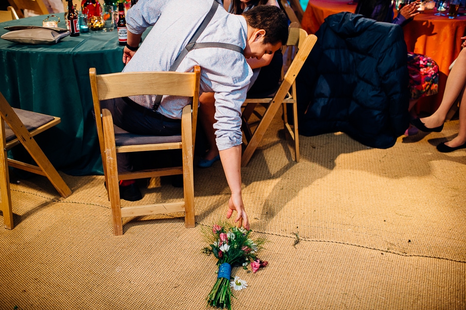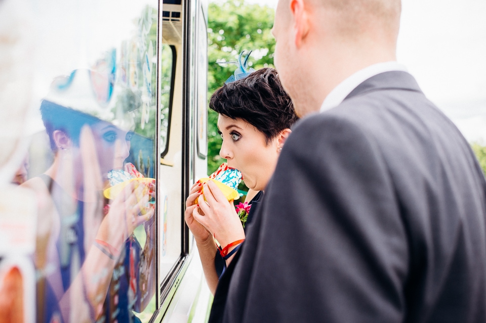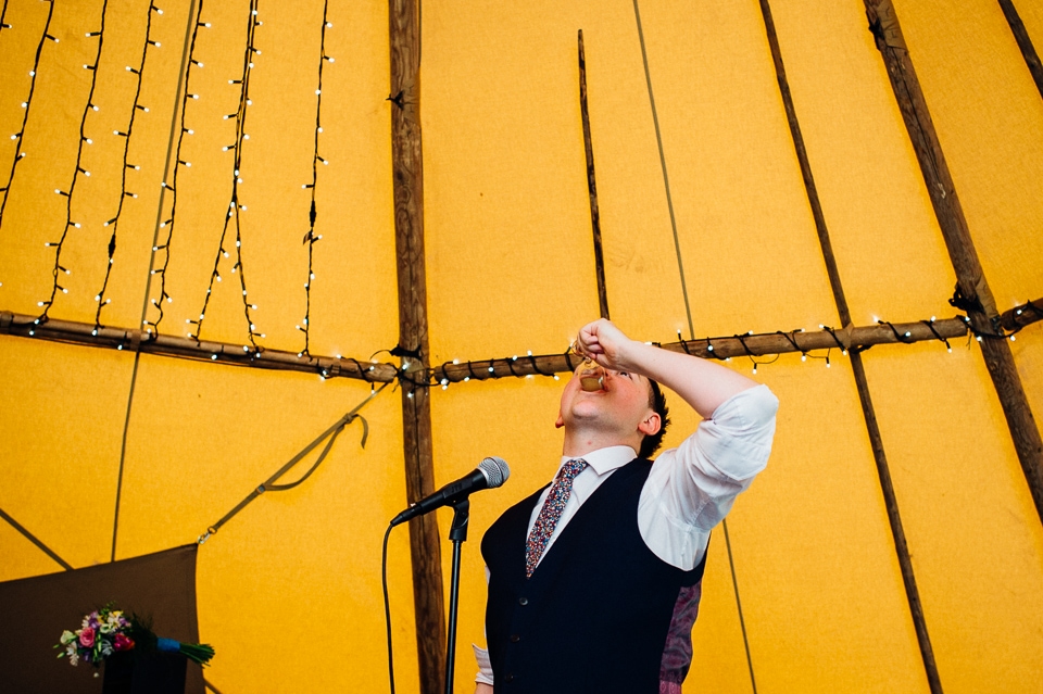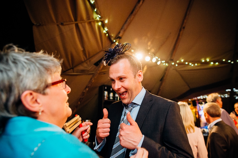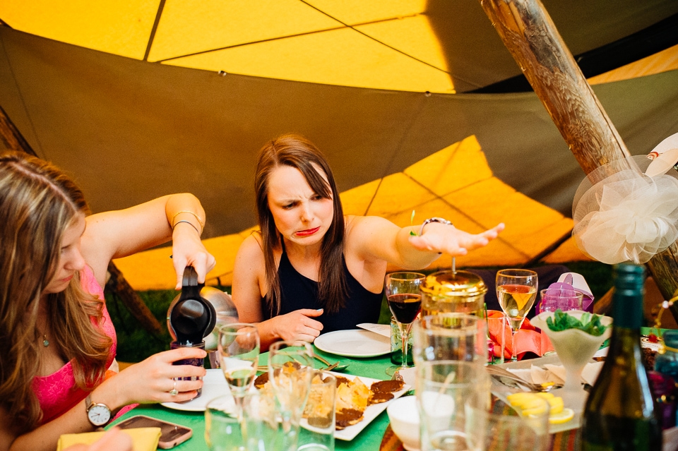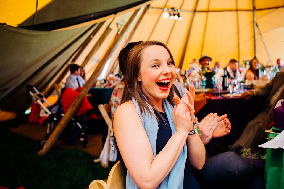 The reception was held in a tipi set up in the next field. They had decorated it with beautiful bright silky materials, wild flowers and beaded colourful glassware. As Laura and her family are huge Arsenal fans, the match was aired so the drinks reception was both a reception and a footie session. They had a barbecue and an ice cream van for dessert which was followed by very emotional speeches. After that it descended into the madness I know and love where Great Grandma caught the double bouquet toss from a VW and then… wait let me linger for a second because this story is so awesome it deserves to be included: When I shared the bouquet toss shot on my FB page (this is all public by the way so it’s fine for me to share), G-Gma, the bad ass boss lady she is, posted this-