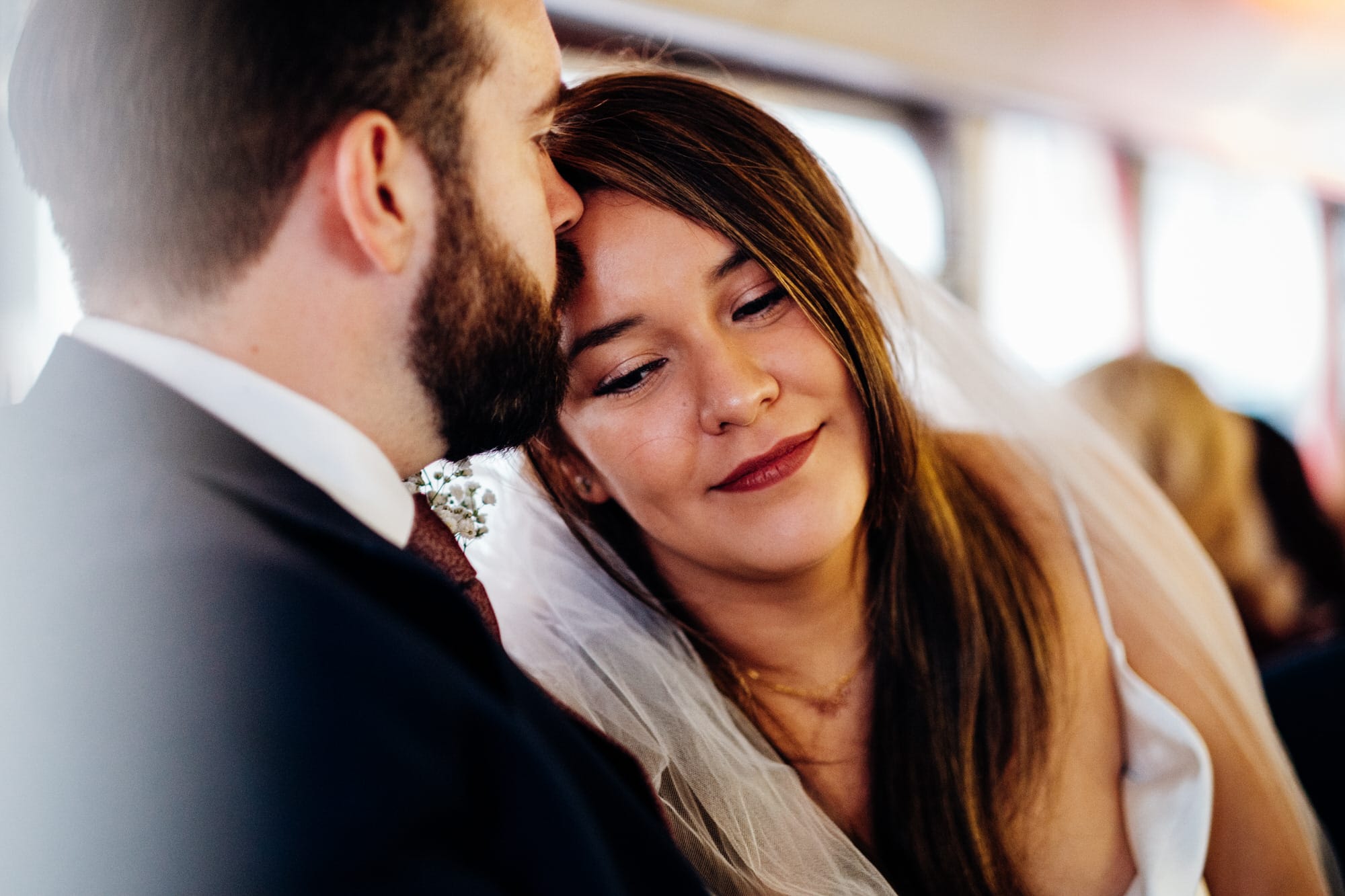 Betty kept it classic with a long veil and modern silk slip style wedding dress and Mark wore a blue suit with a deep maroon patterned tie.