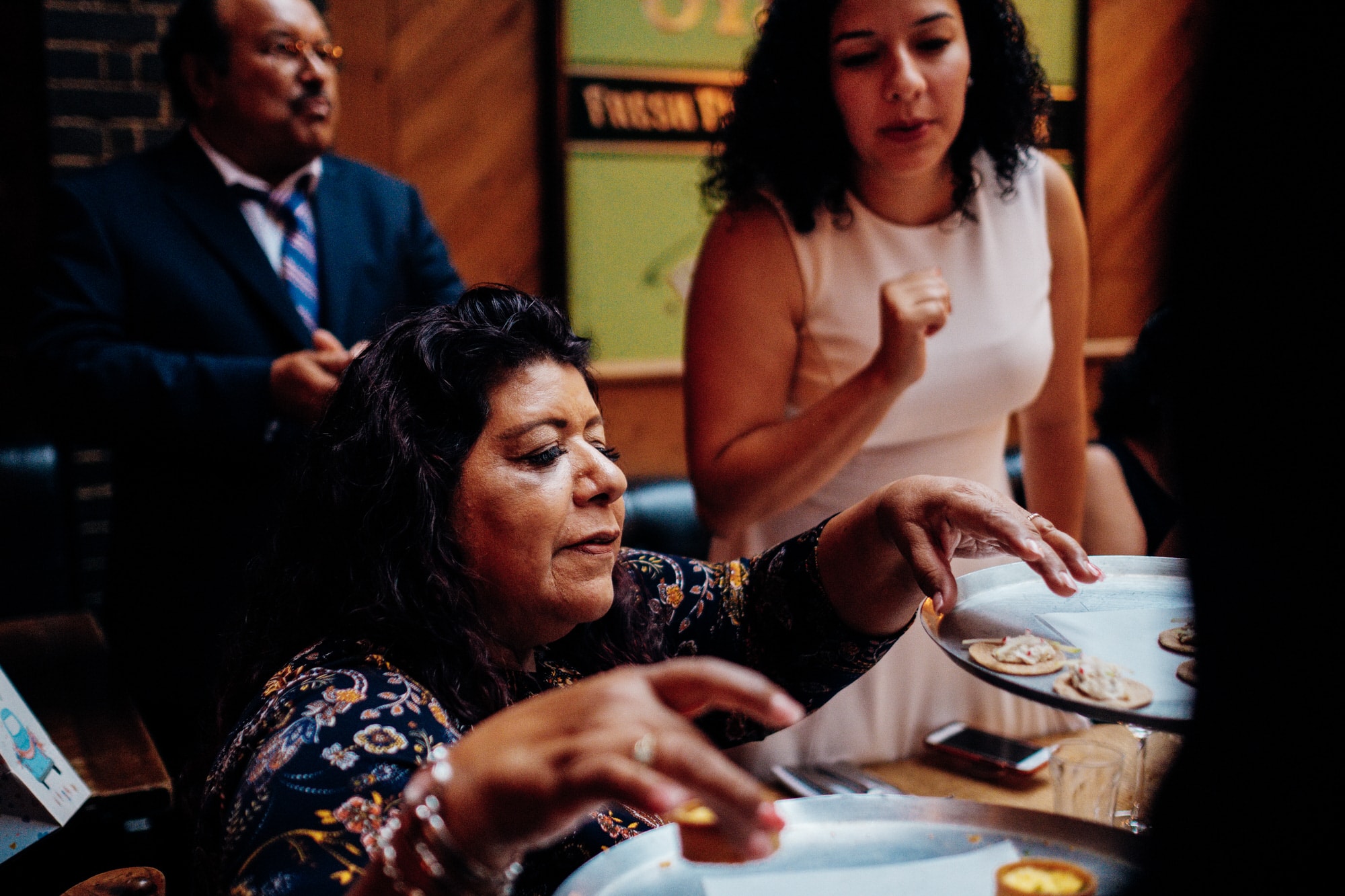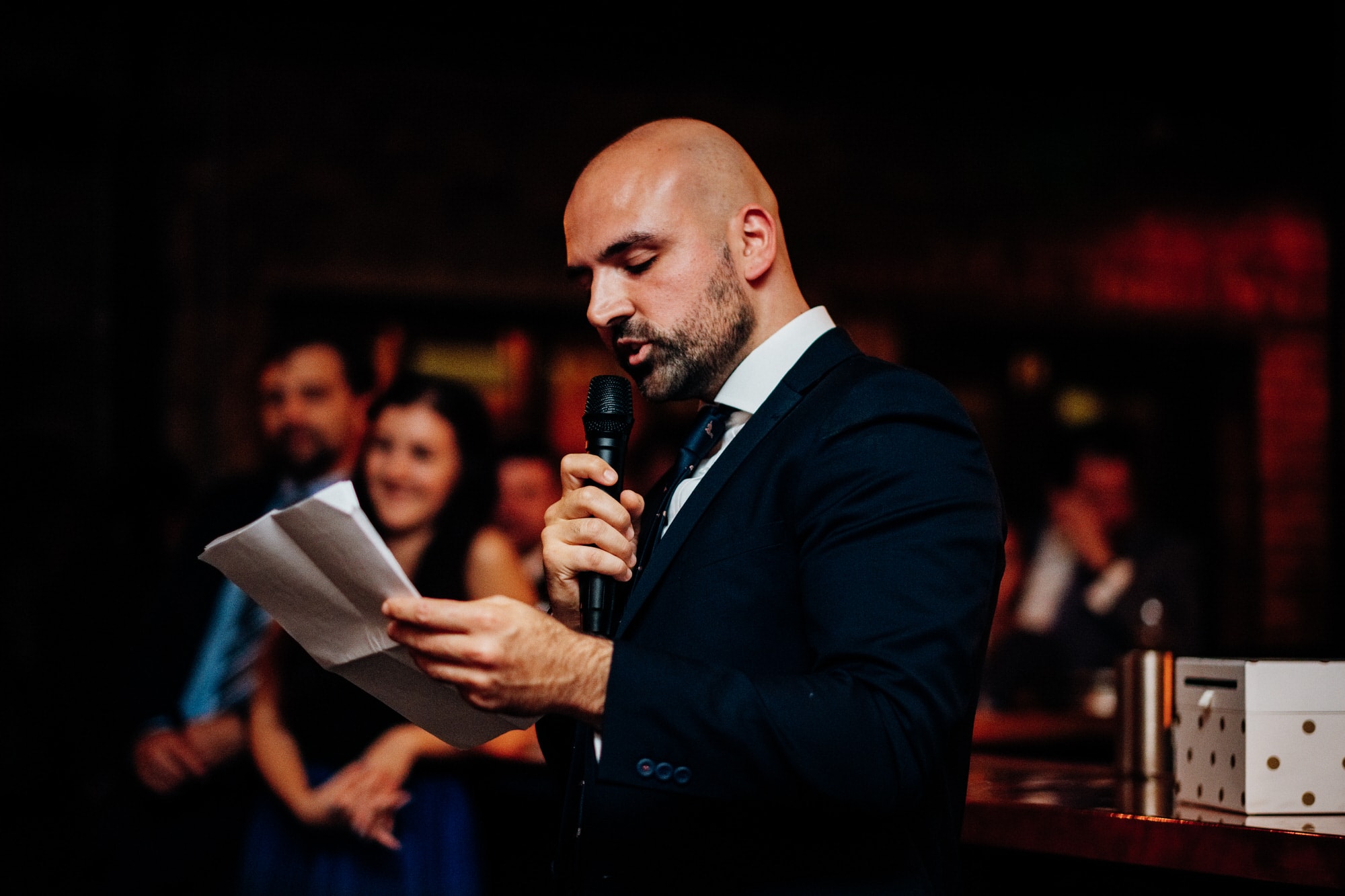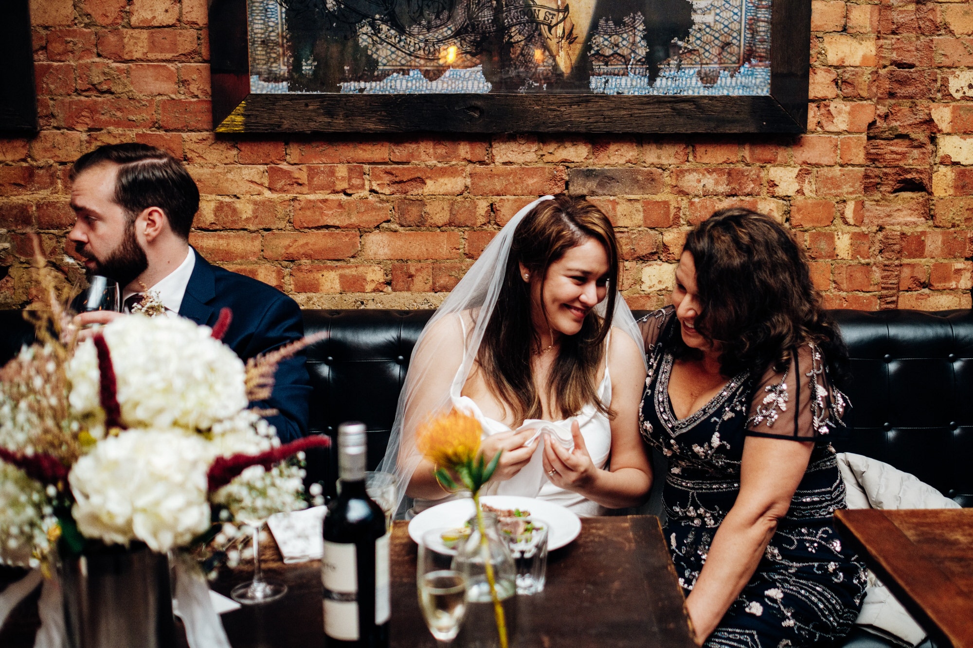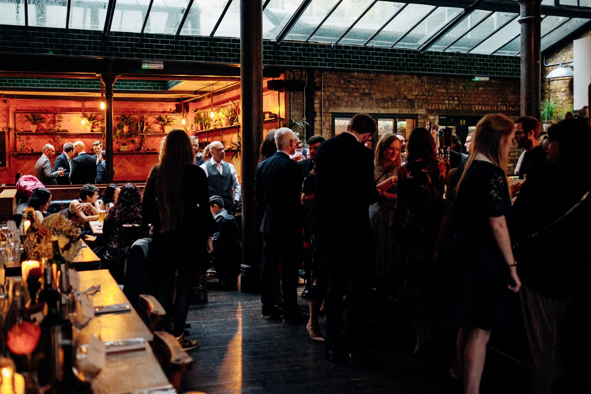 Betty and Mark booked me after seeing the first Harrild and Sons London wedding that I photographed, so I was very happy to be back again at a beautiful underrated East London wedding venue that’s bang in the middle of London with tons of space for dining, drinks and dancing! It has the ground floor level restaurant, but sneakily a cocktail bar in the basement which acts as a good chance for the team to shuffle the dinner tables away, and for dessert and cake cuttings! It is a big industrial urban style wedding venue with lovely vintage pub and restaurant signs decorating the rooms. The guests and couple all gathered in the main restaurant area for their drinks and canapés, and we did a few family group shots in the corner of the space.