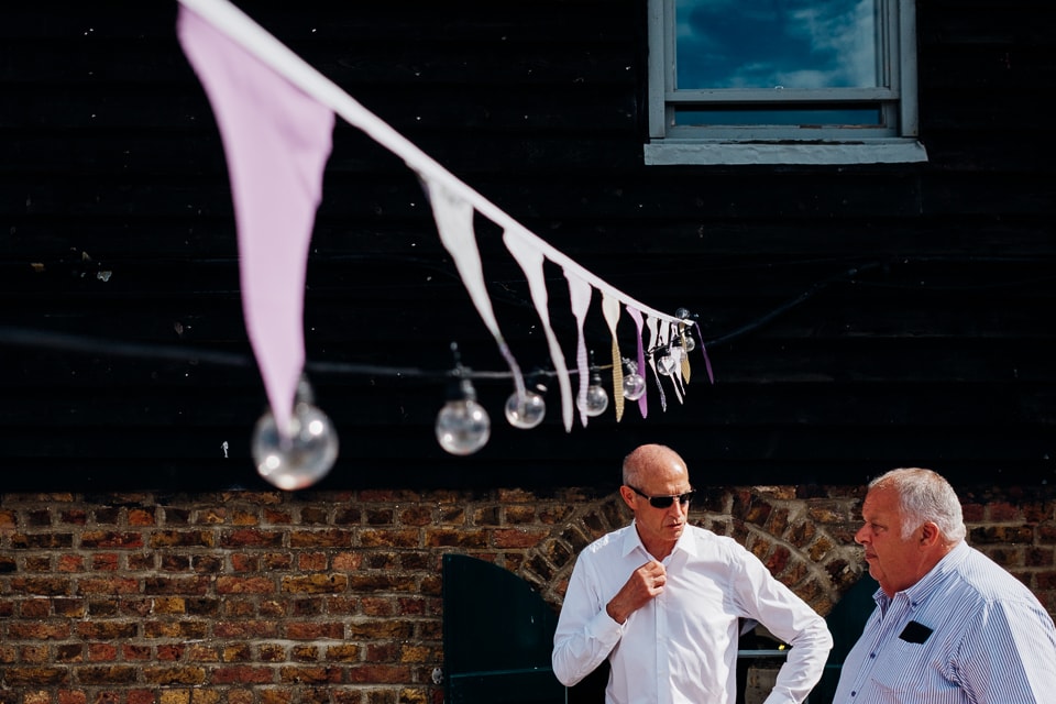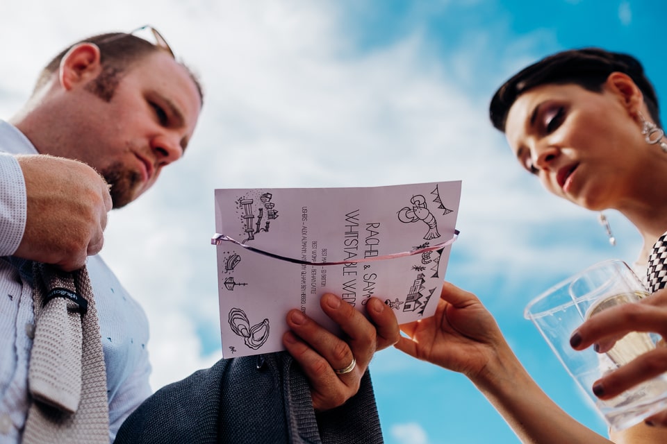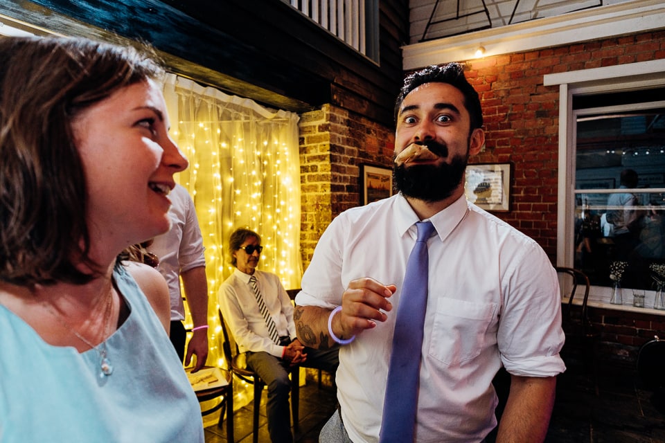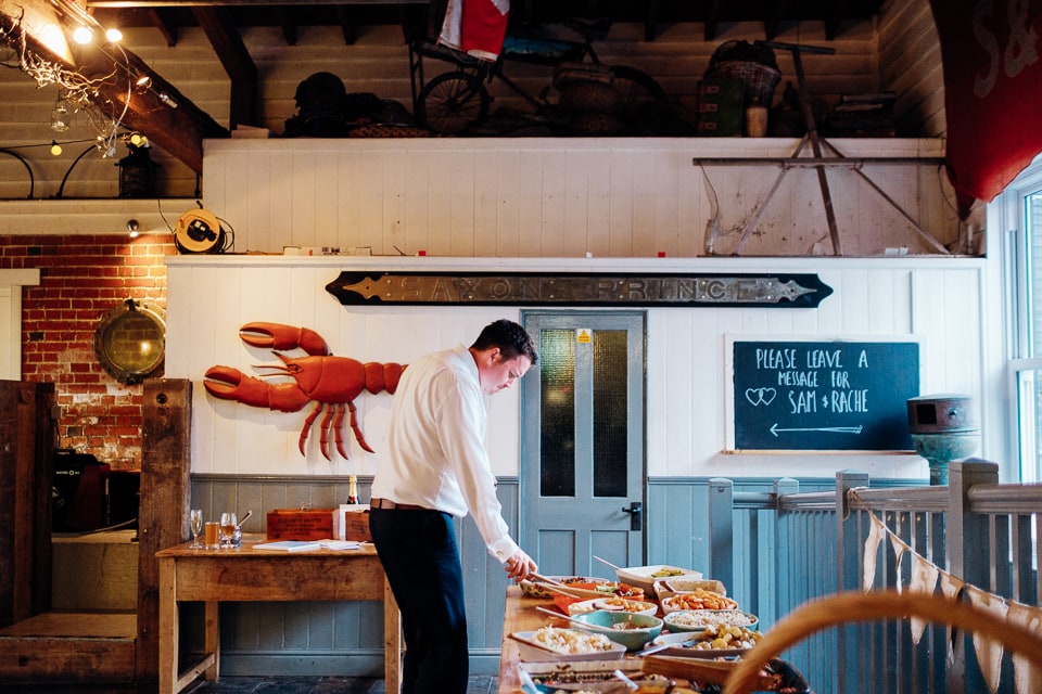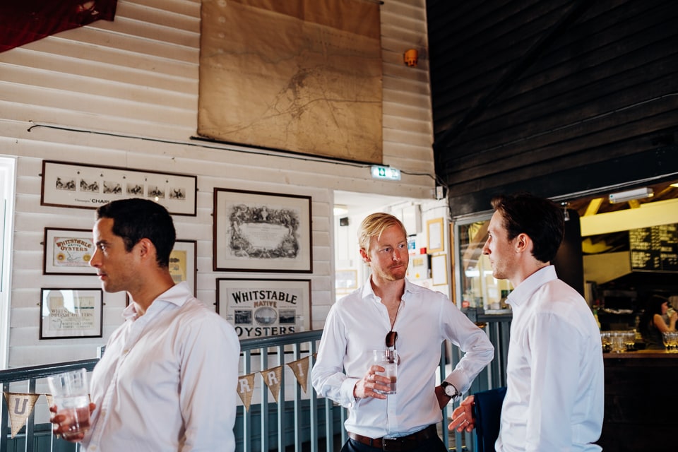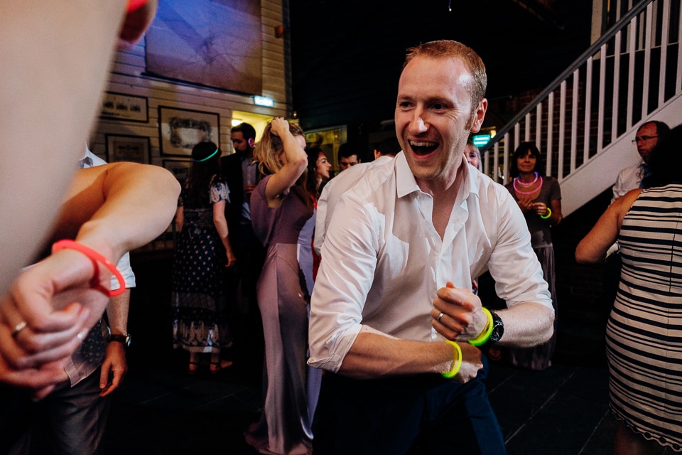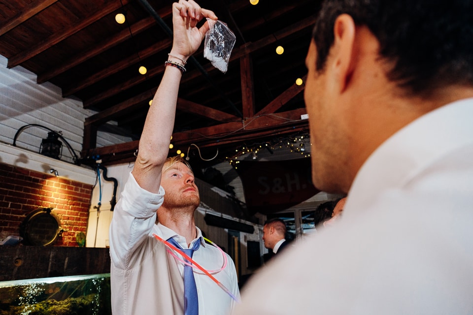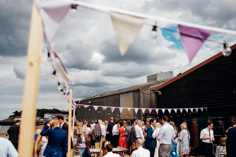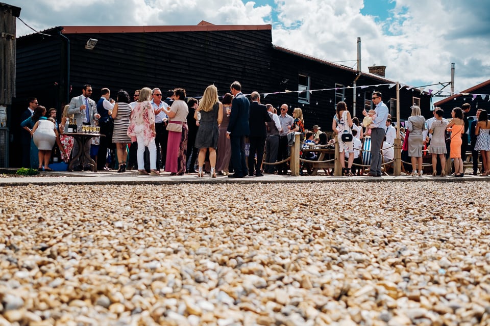 Sam and Rachel are a wicked couple who, despite being society’s definition of fitty mcvites are both humble and sweet, preferring to not have any getting ready photos as they’re not keen on the attention! So I started my day at the amazing East Quay Venue which sits right on the beach at Whitstable, the town famous for its oyster festival (seafood, nom nom nom). Rachel wore a gorgeous Maggie Sottero dress and a hair vine handmade by her friend. Sam wore a wicked Paul Smith suit in a peacock blue. It’s super cool decked out with fairy lights and it has atmospheric wood and brick all over. Sam and Rachel named the tables after drinks with stories about their lives that made each drink special. They hand made the place cards by cutting out head shots of their friends and family and mounting them onto corks and hand painting the corky bodies! It was a surprise to the guests who had no clue their photos had been sneaked from social media etc., so it was a fun reveal! They also had a truly unique wedding “cake” which was actually a green jelly sandcastle surrounded by biscuit crumbs that resembled sand! After the ceremony the guests had drinks on the stoney beach whilst Rachel’s brother and their various talented friends provided the music! In the evening after their BBQ dinner they got our the glow sticks as the groom took to the DJ decks for a short stint alongside their DJ friends.