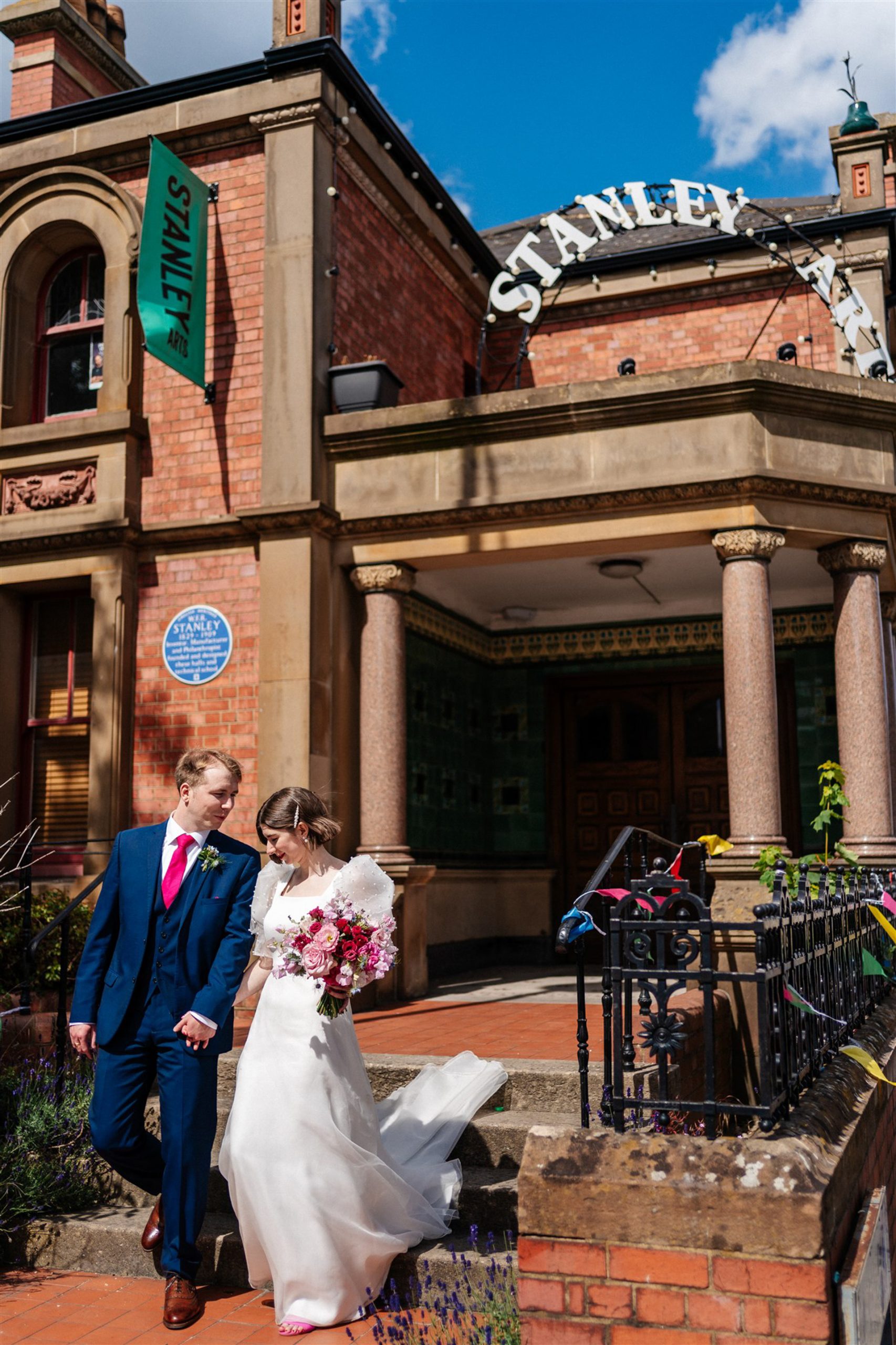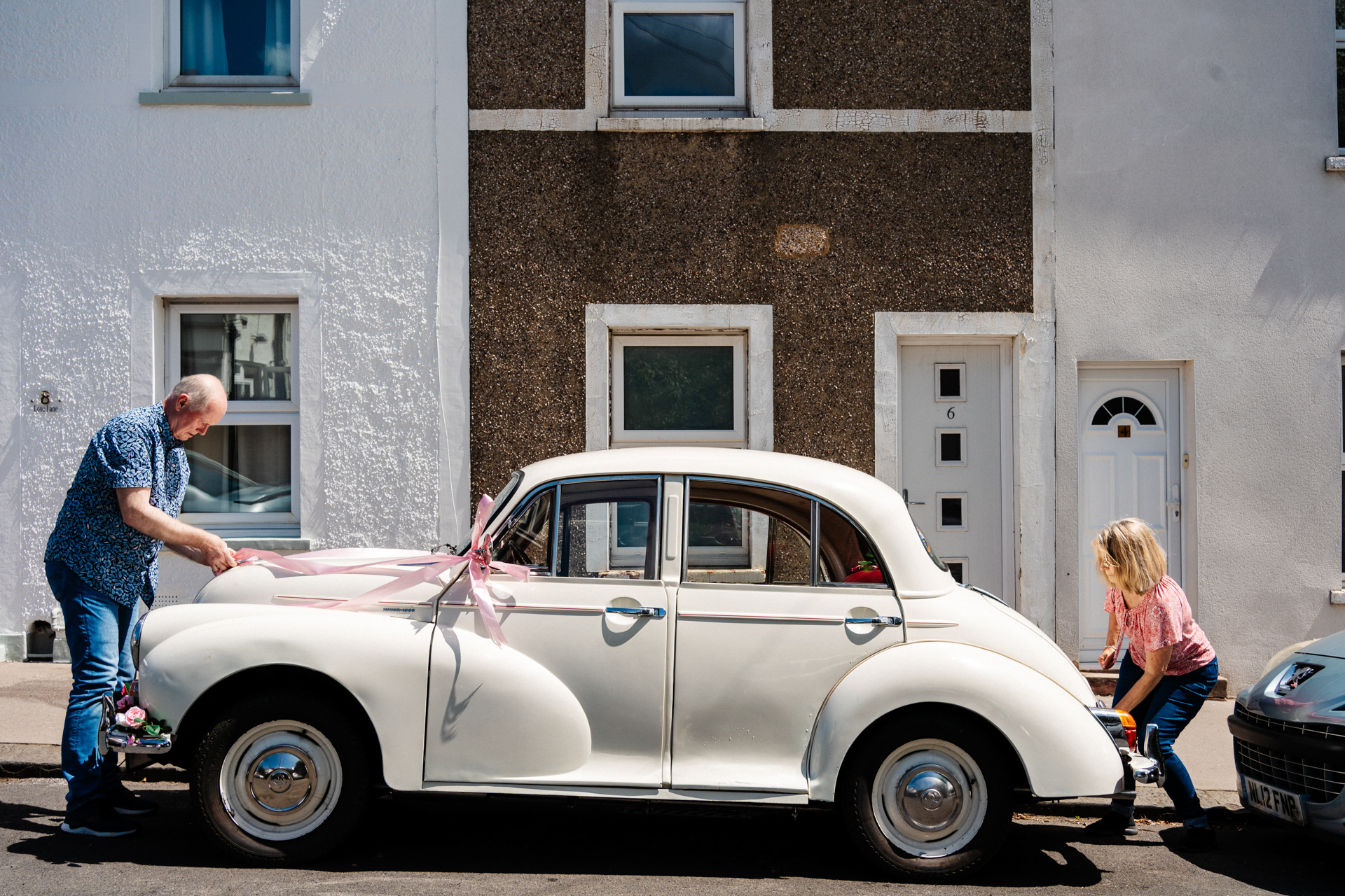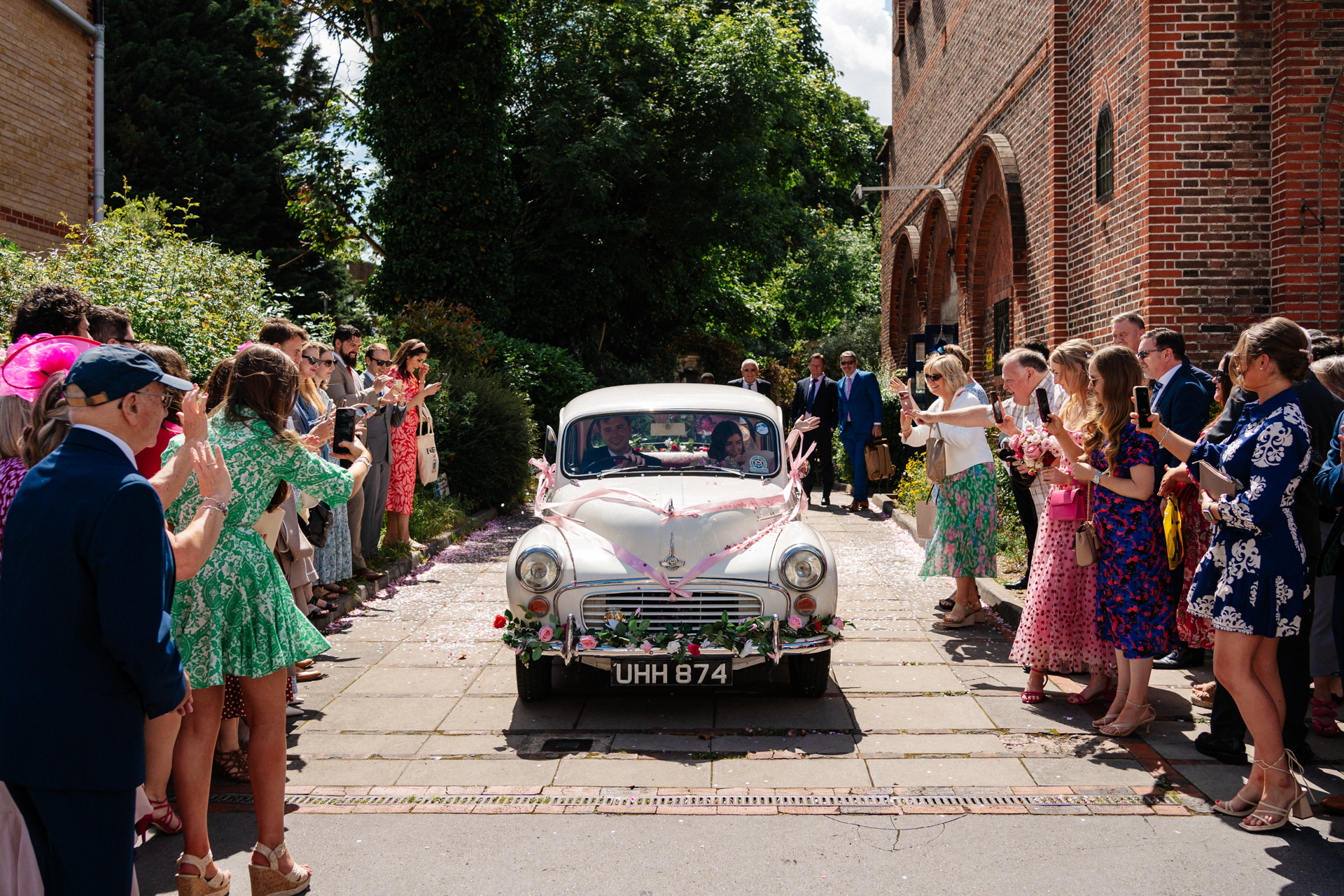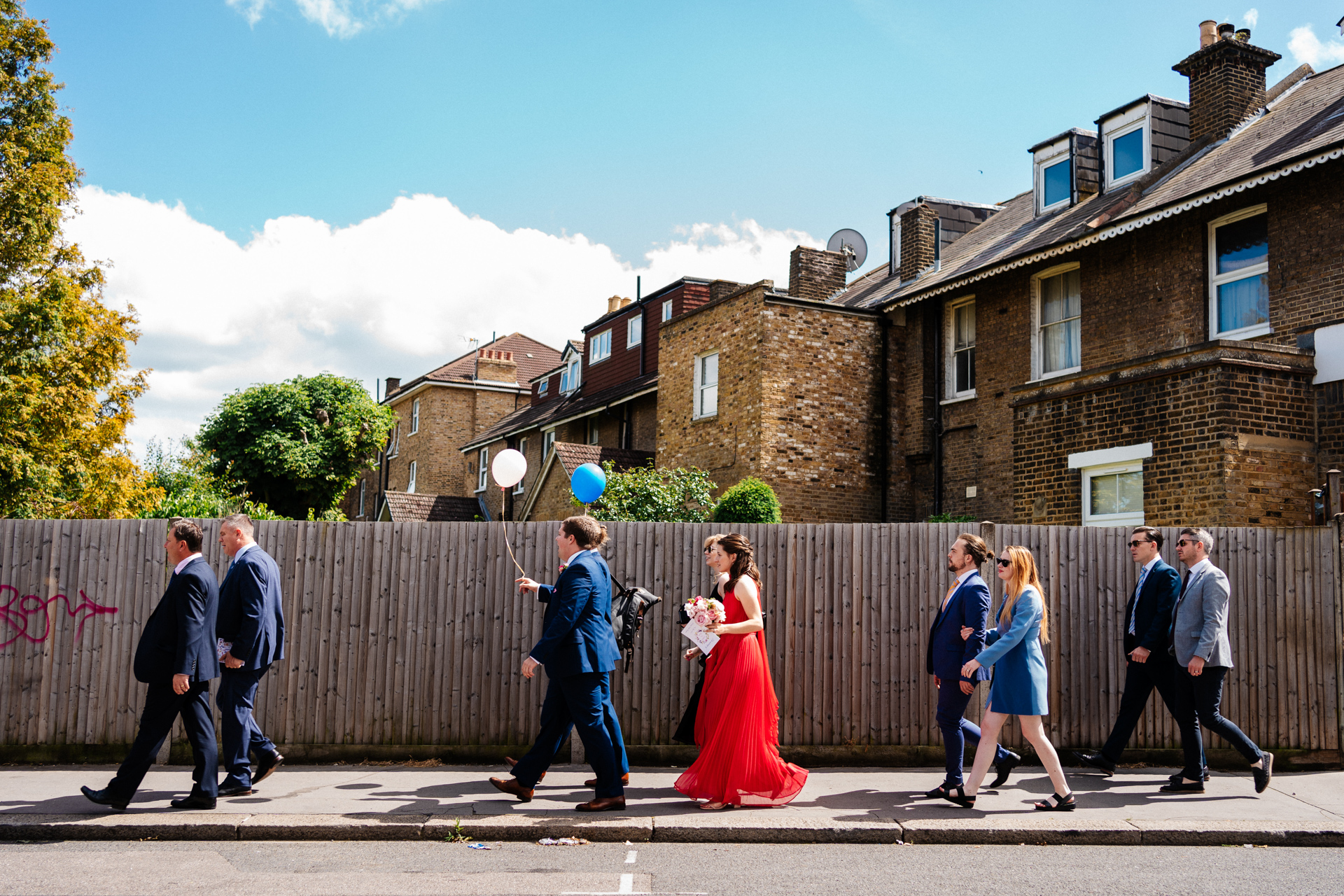 After the church ceremony all their guests took a short walk through South London to the wedding reception venue: Stanley Arts. The bride and groom drove off in the vintage Morris Minor! They used a balloon procession to help guide the guests.