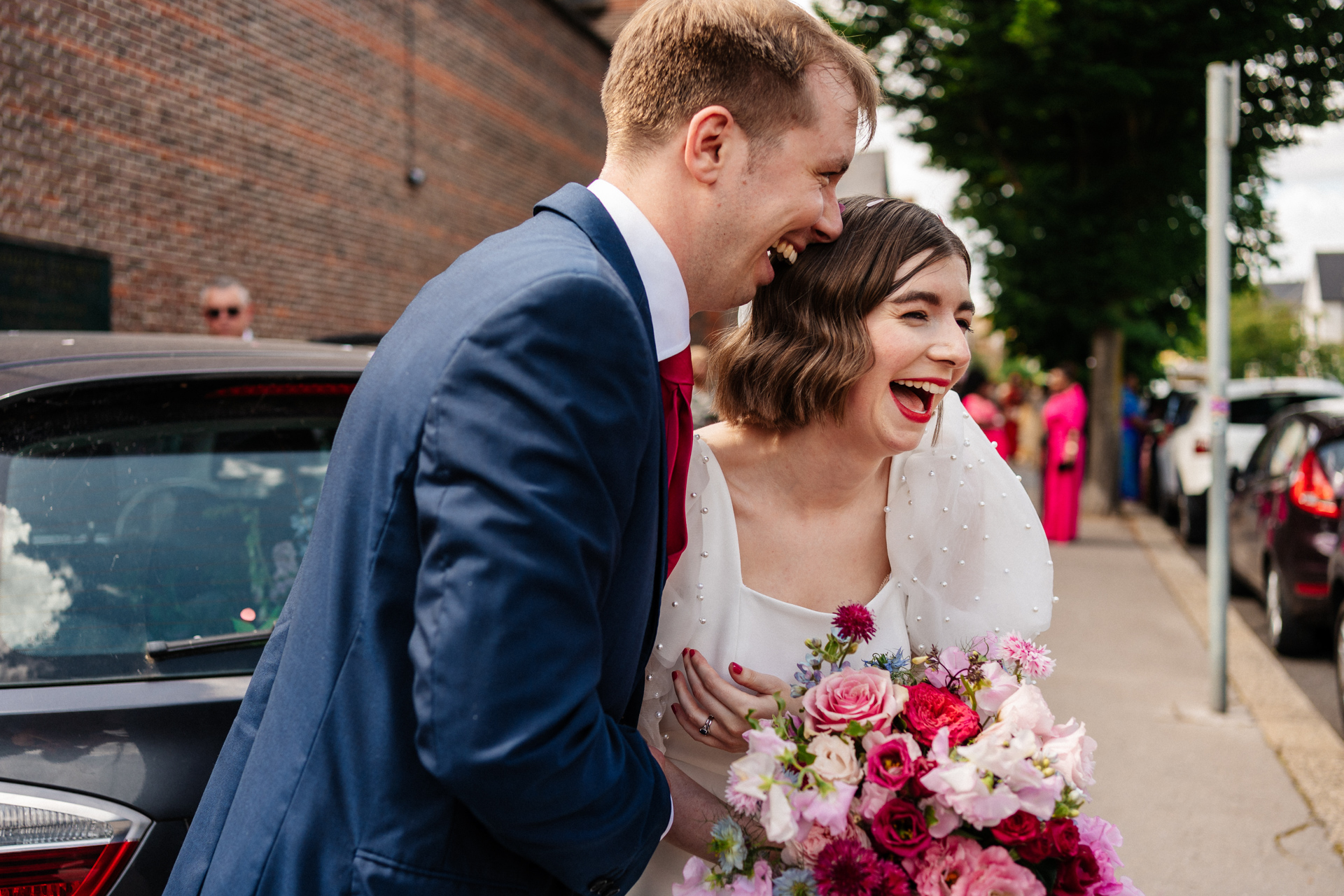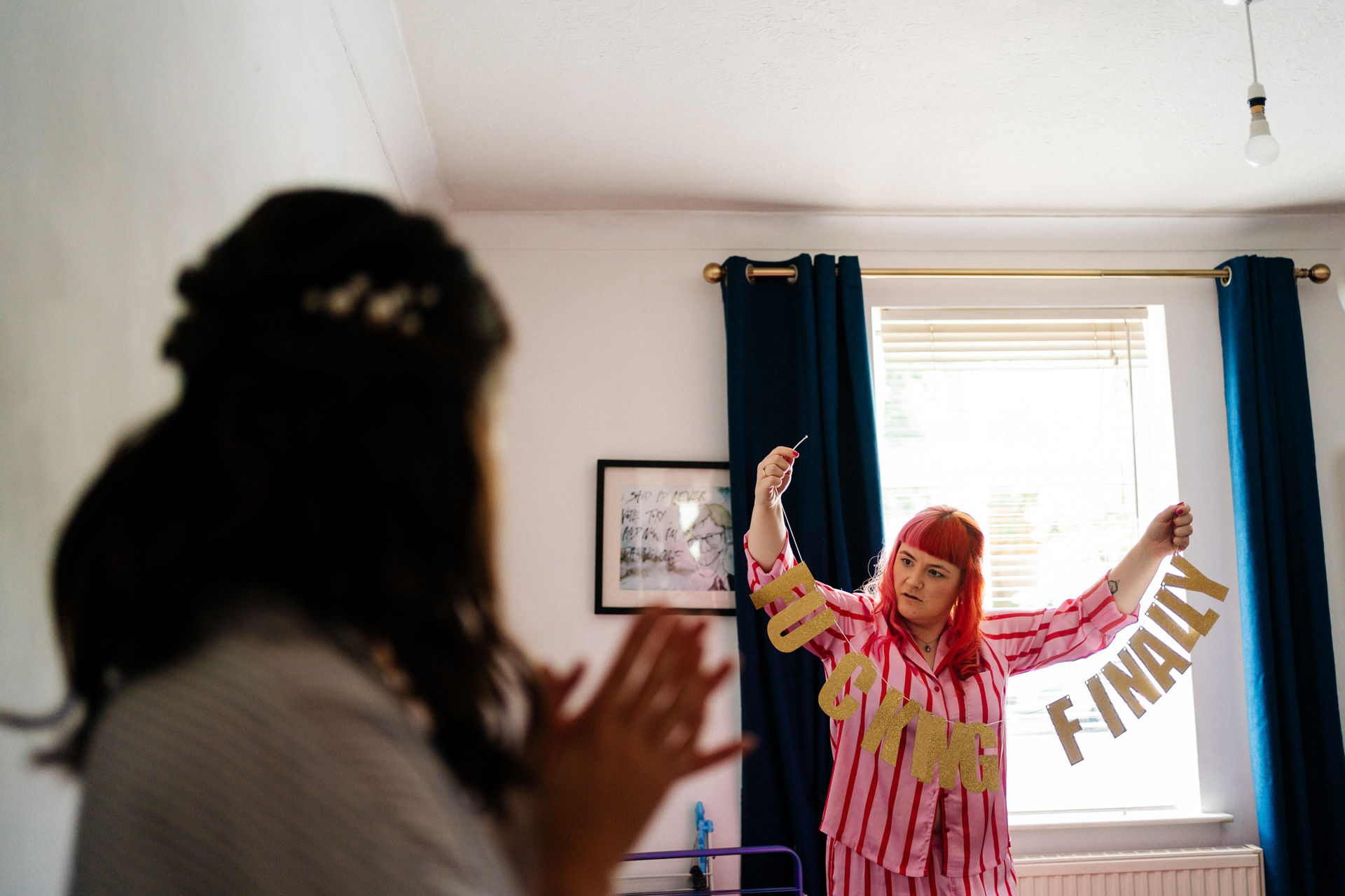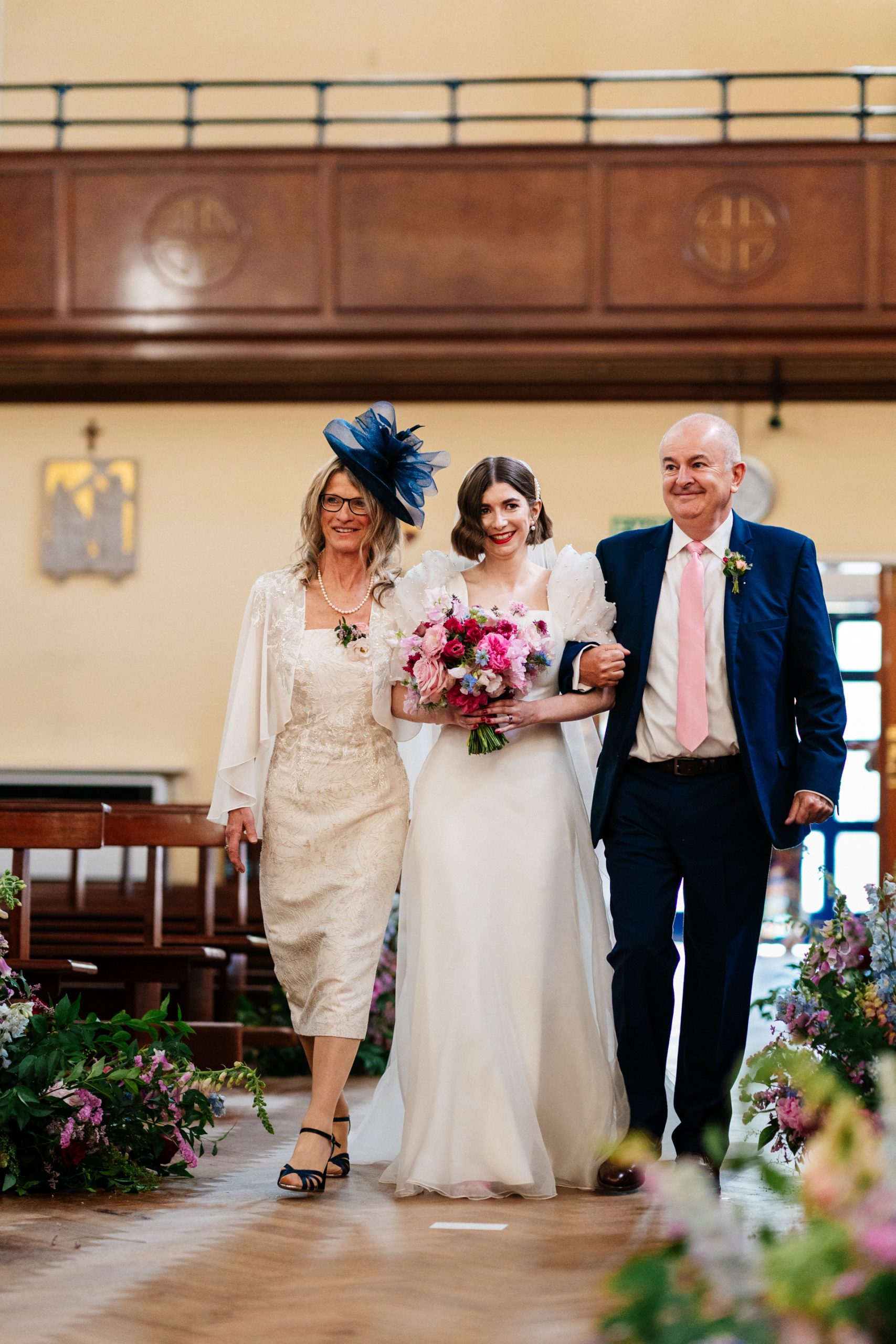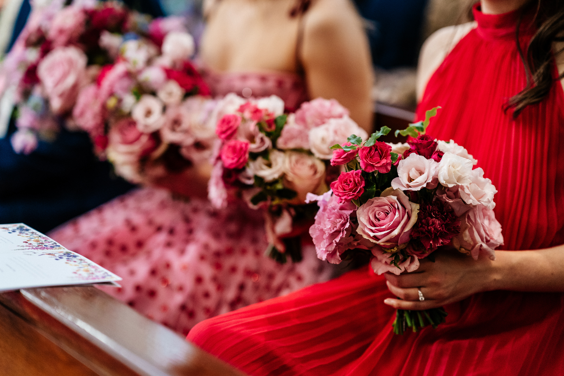 I started the day at their home getting ready. T wore a truly unique Jesus peiro wedding dress from the infamous British wedding boutique Miss Bush Bridal. Her dress had small pearls sewn into the puffed sleeves. The dress complemented her neat bob wave perfected by Hannah Monk and made for some stunning photos. The bridesmaids wore electric pink dresses.