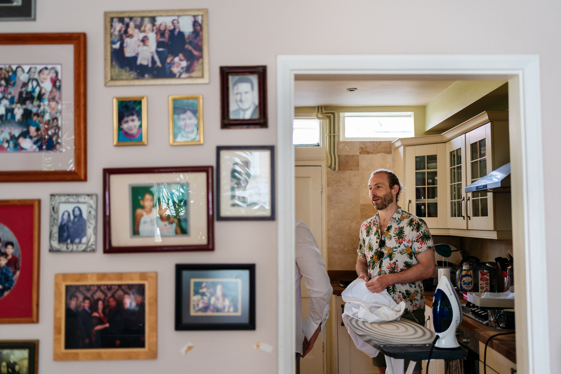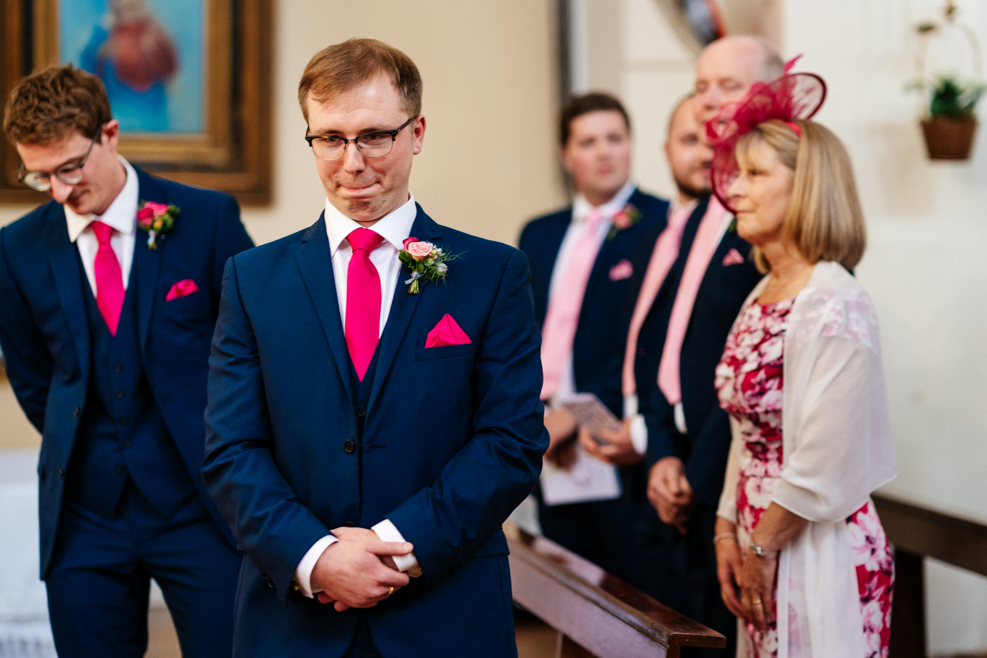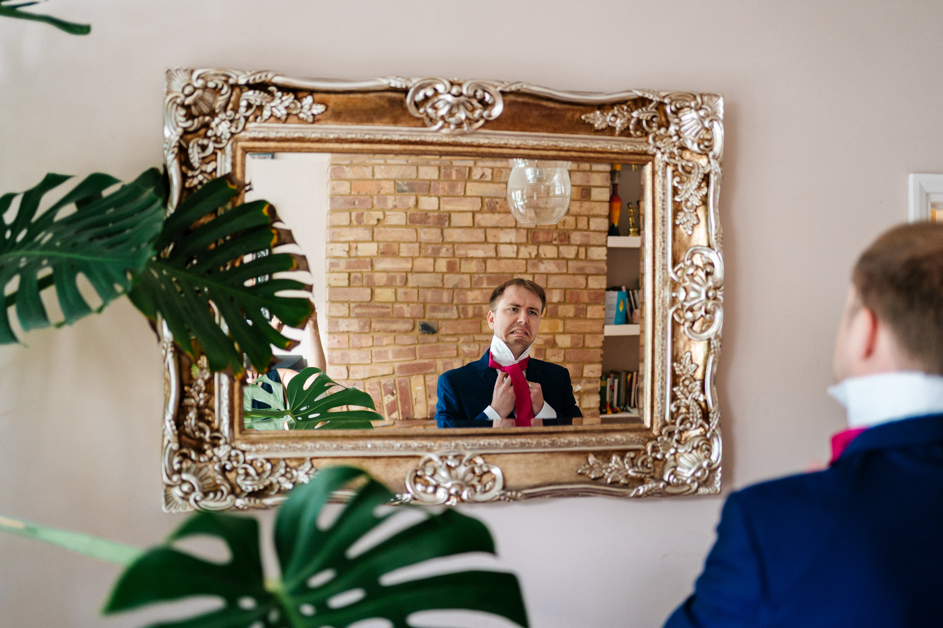 I started the day at their home getting ready. T wore a truly unique Jesus peiro wedding dress from the infamous British wedding boutique Miss Bush Bridal. Her dress had small pearls sewn into the puffed sleeves. The dress complemented her neat bob wave perfected by Hannah Monk and made for some stunning photos. The bridesmaids wore electric pink dresses.