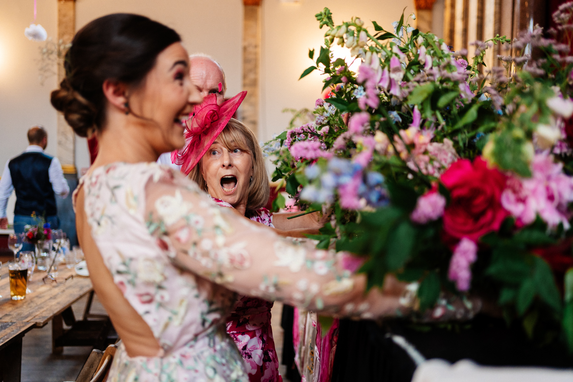 The groom and his family, who are huge West Ham fans, had a giant West Ham mascot at the drinks reception. The main long trestle tables were decorated with stunning pink floristry by Floral Evolution. The chair hire was provided by The Little Wedding Warehouse.