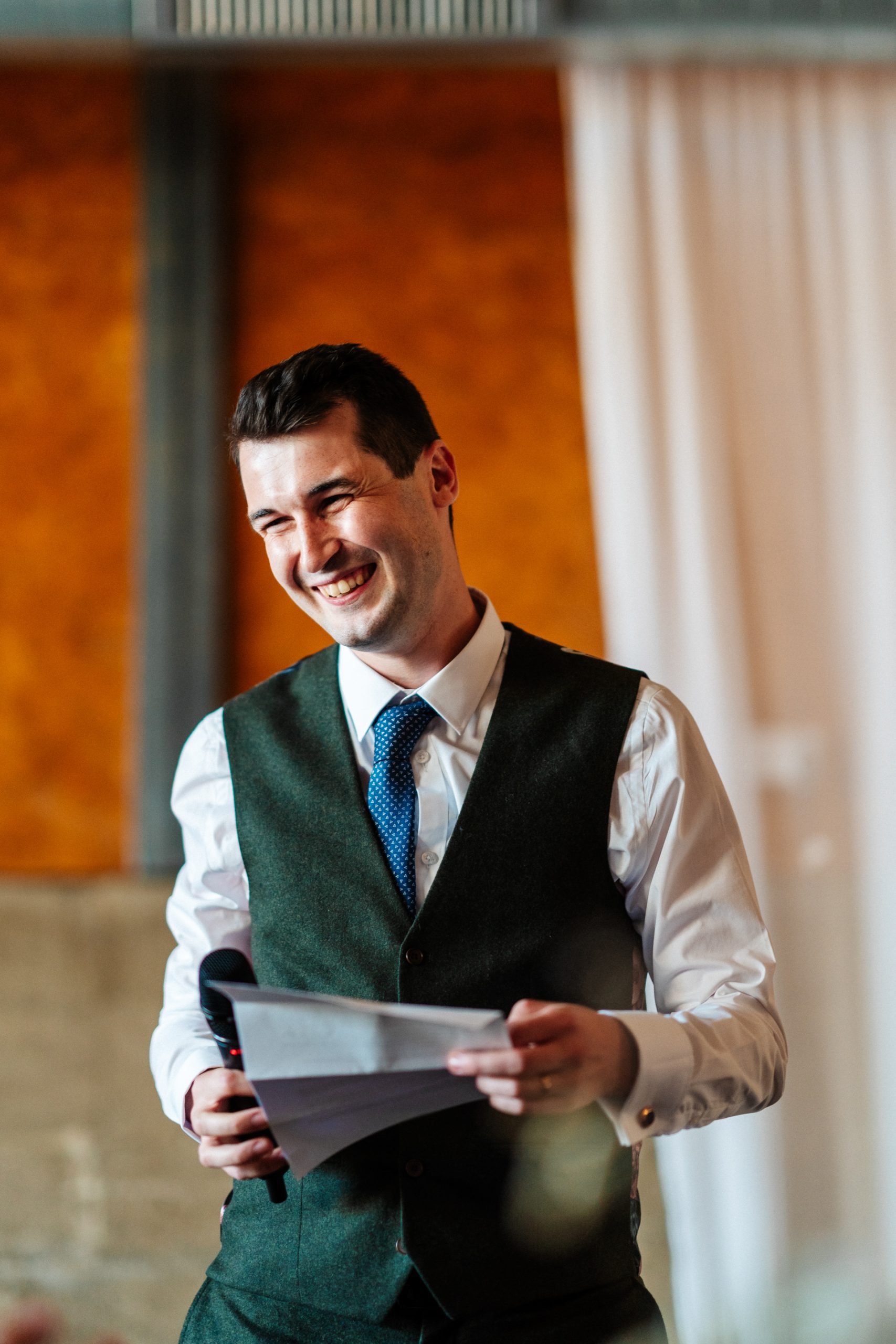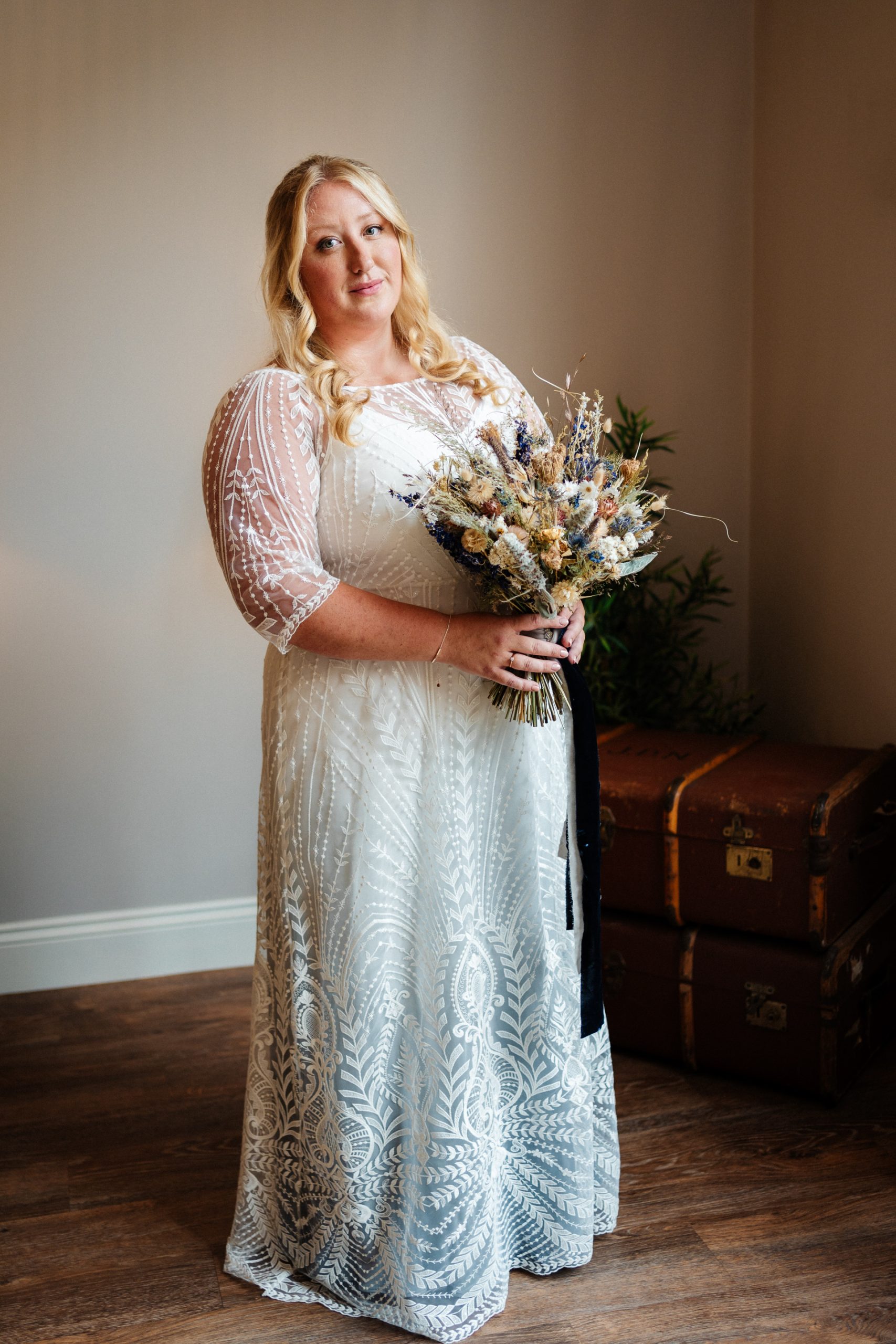 The bride wore a gorgeous Lucy Can’t Dance wedding dress. Lucy can’t dance is an Essex based alternative wedding dress designer. She’s a lovely person to boot with a great dress shop in Chelmsford that’s inclusive and welcoming. She’s know for her signature colourful dip dyes and beading detail. Rosehip and Wren provided the stunning dried flowers. The groom wore a cool dark green suit with a blue tie that matched the bottom of the bride’s brey/grey dip dyed dress.