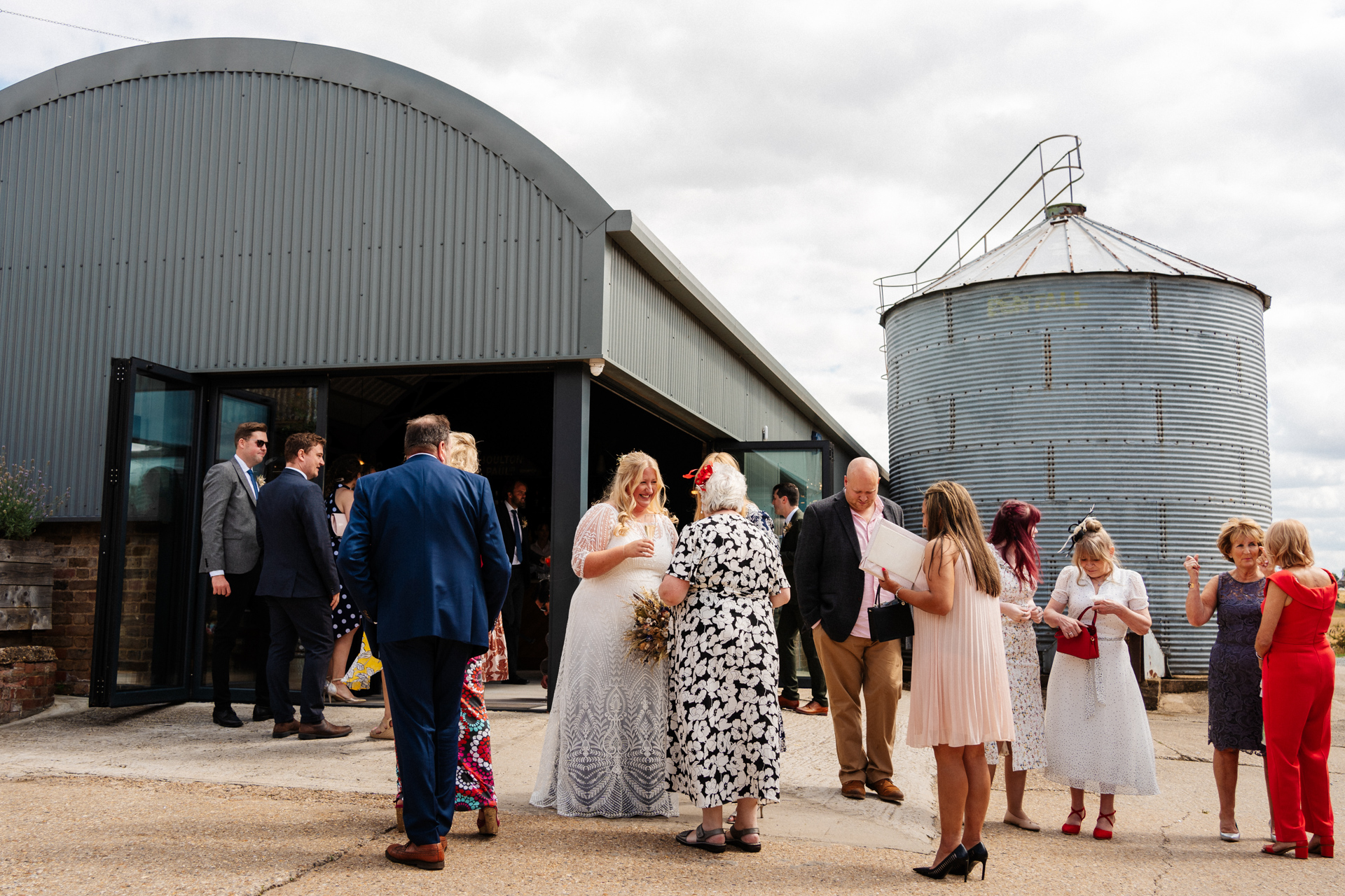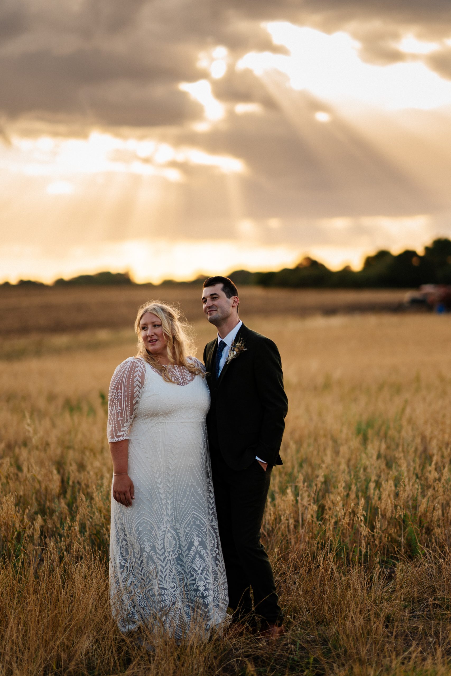 After the ceremony the brilliant and experienced venue team offered all the guests drinks. Outside you’ll find wooden tables next to rustic hay bales and solid farming equipment. There’s plenty of backdrops for nice group photos. There’s also the cool silos and a field for couple photos, and the team at The Barns at Lodge Farm wedding venue were really kind and helpful and kept an eye on the ideal sunset time for us to head out!