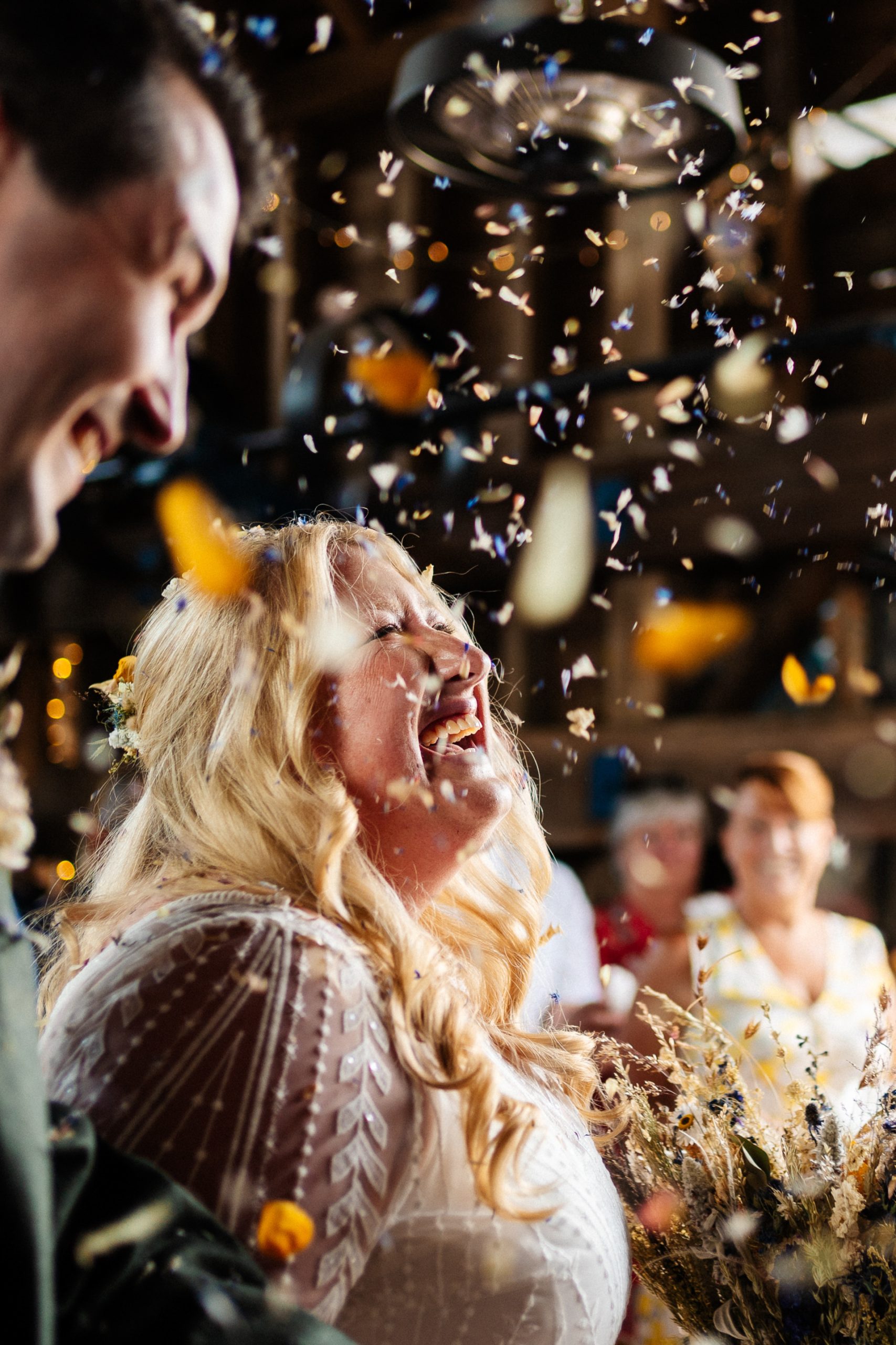 You can throw confetti either inside the ceremony space of outside the barn. My couple opted to have a confetti throw inside the barn as they naturally exited and the light looked gorgeous.
