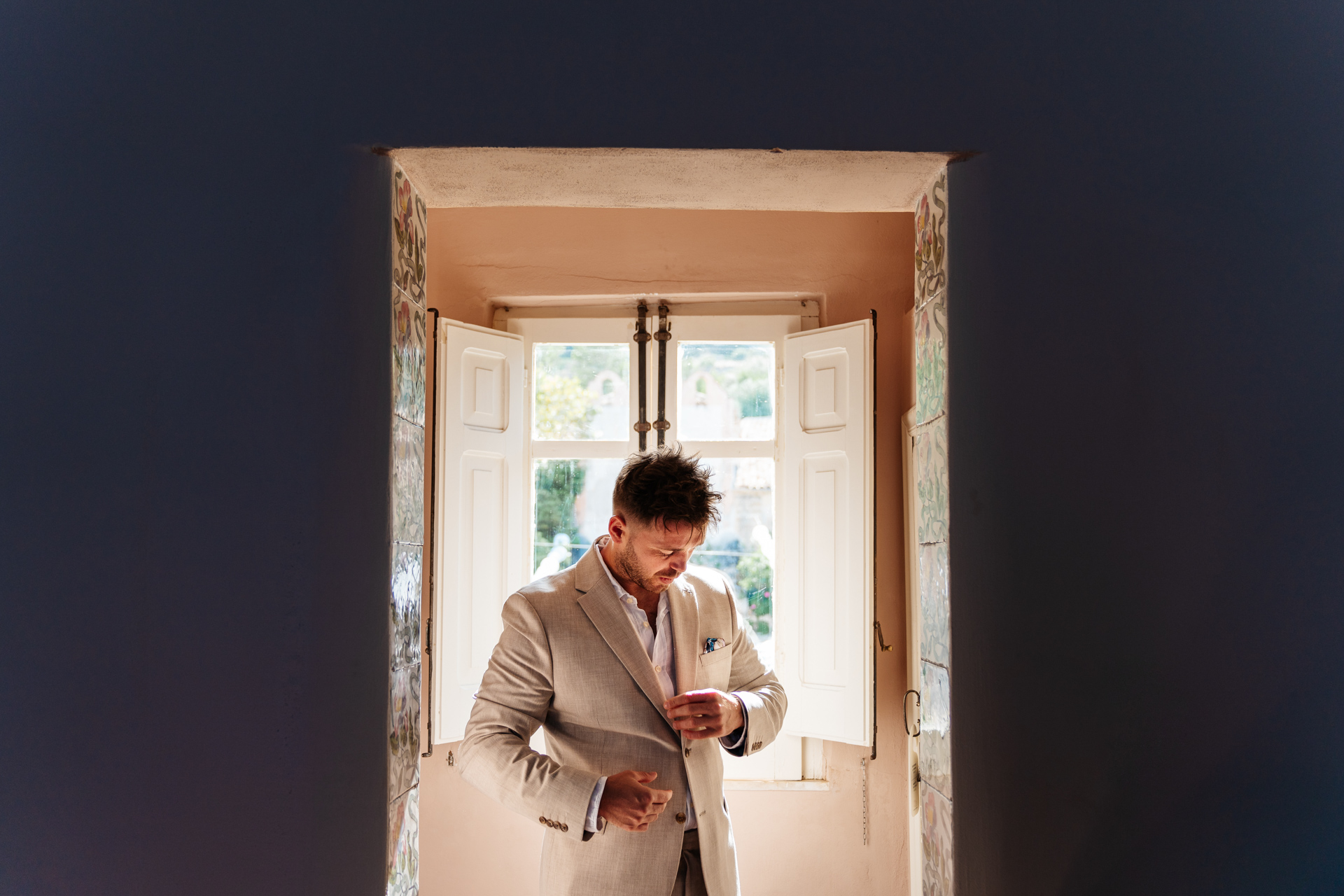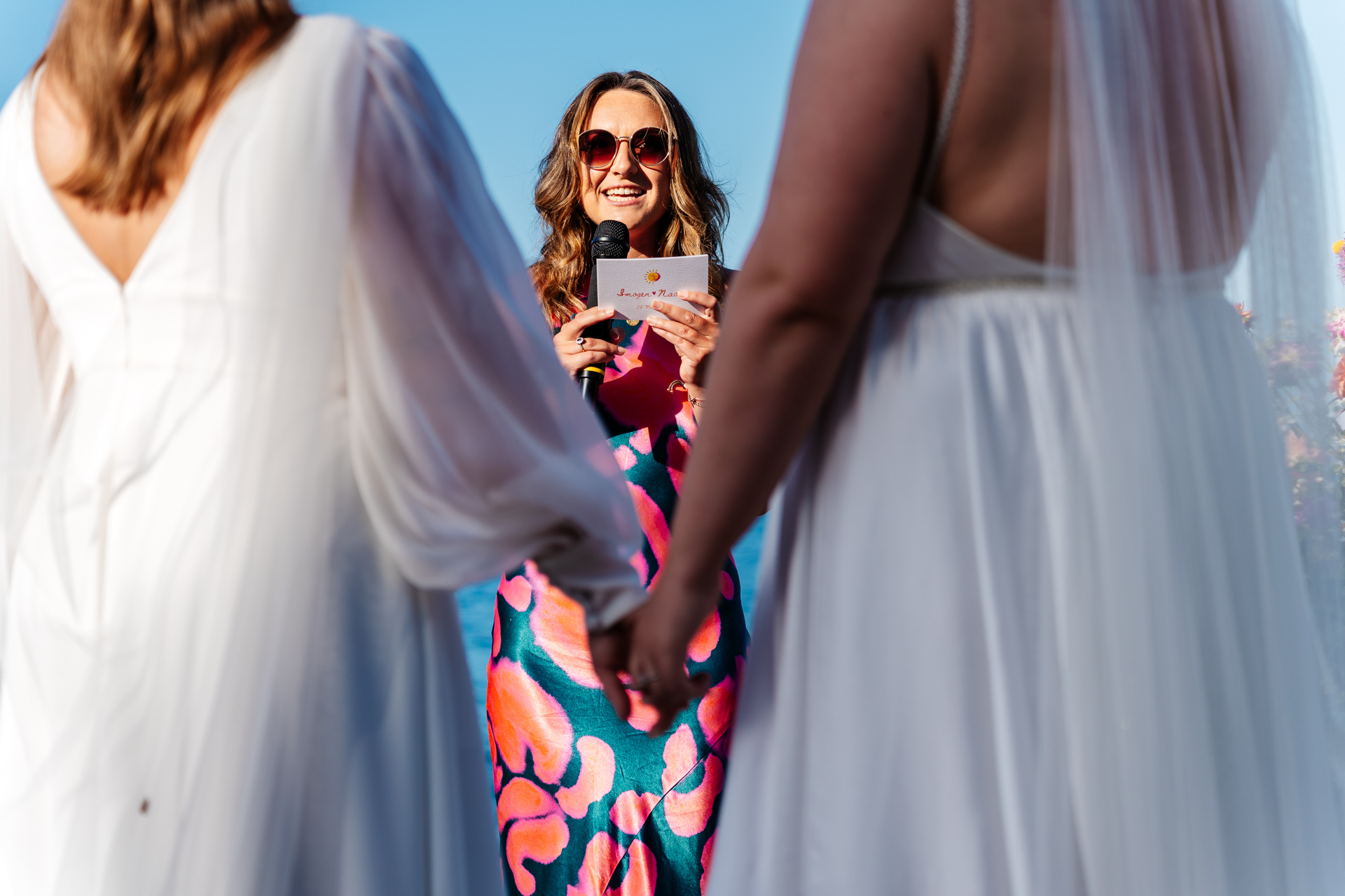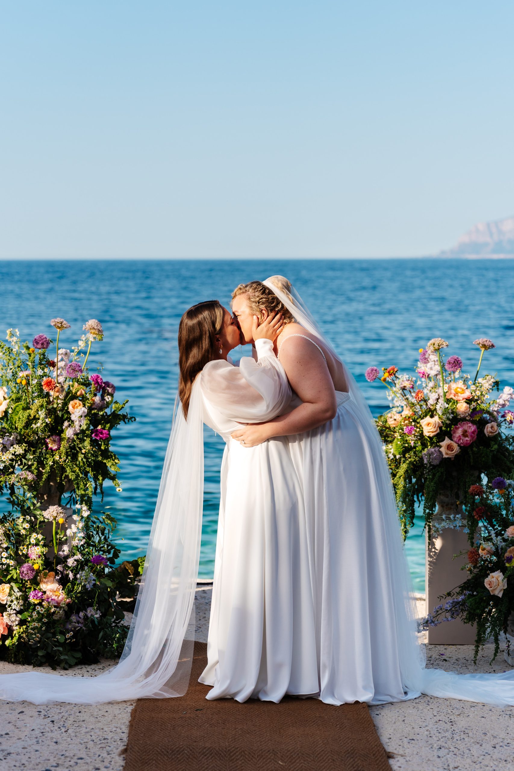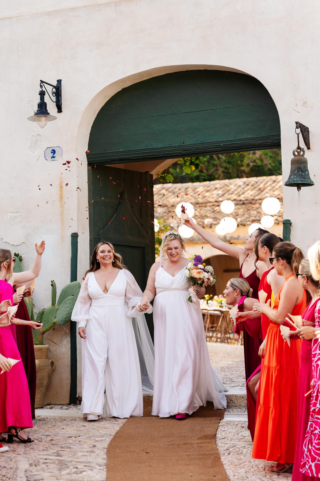 When you book Tonnara Di Scopello you get ready in the main house. They close the site to the public so you have the whole place to yourself. There’s plenty of rooms on site for your guests to get ready in. Other guests can stay at the many hotels and airbnbs in the nearby walkable town of Scopello. The brides had their hair and make up done by the celebrity hair stylist Narad Kutowaroo and fashion make up artist Gabriella Floyd. I’s wedding dress was by House of Flora from Bridal Indulgence and N’s custom jumpsuit was by Jesus Peiro from Miss Bush Bridal. N wore Christian Louboutin trainers, Prada sunglasses and Monica Vinader earrings.