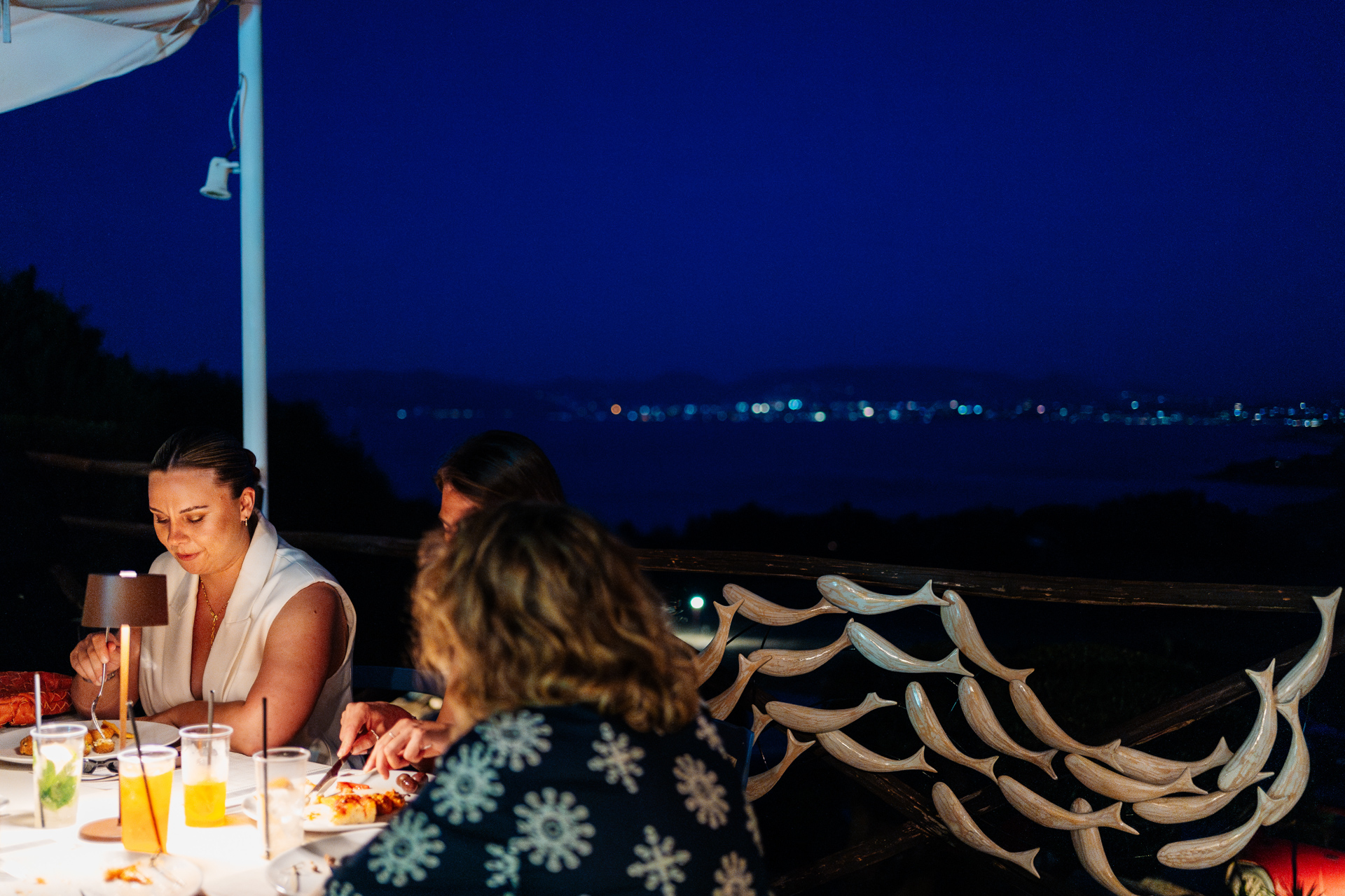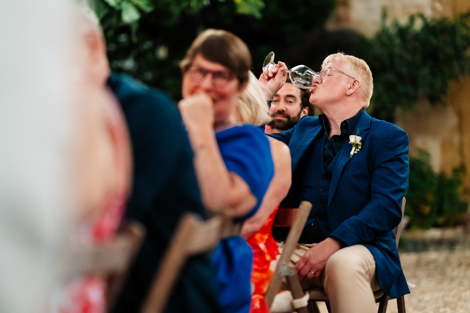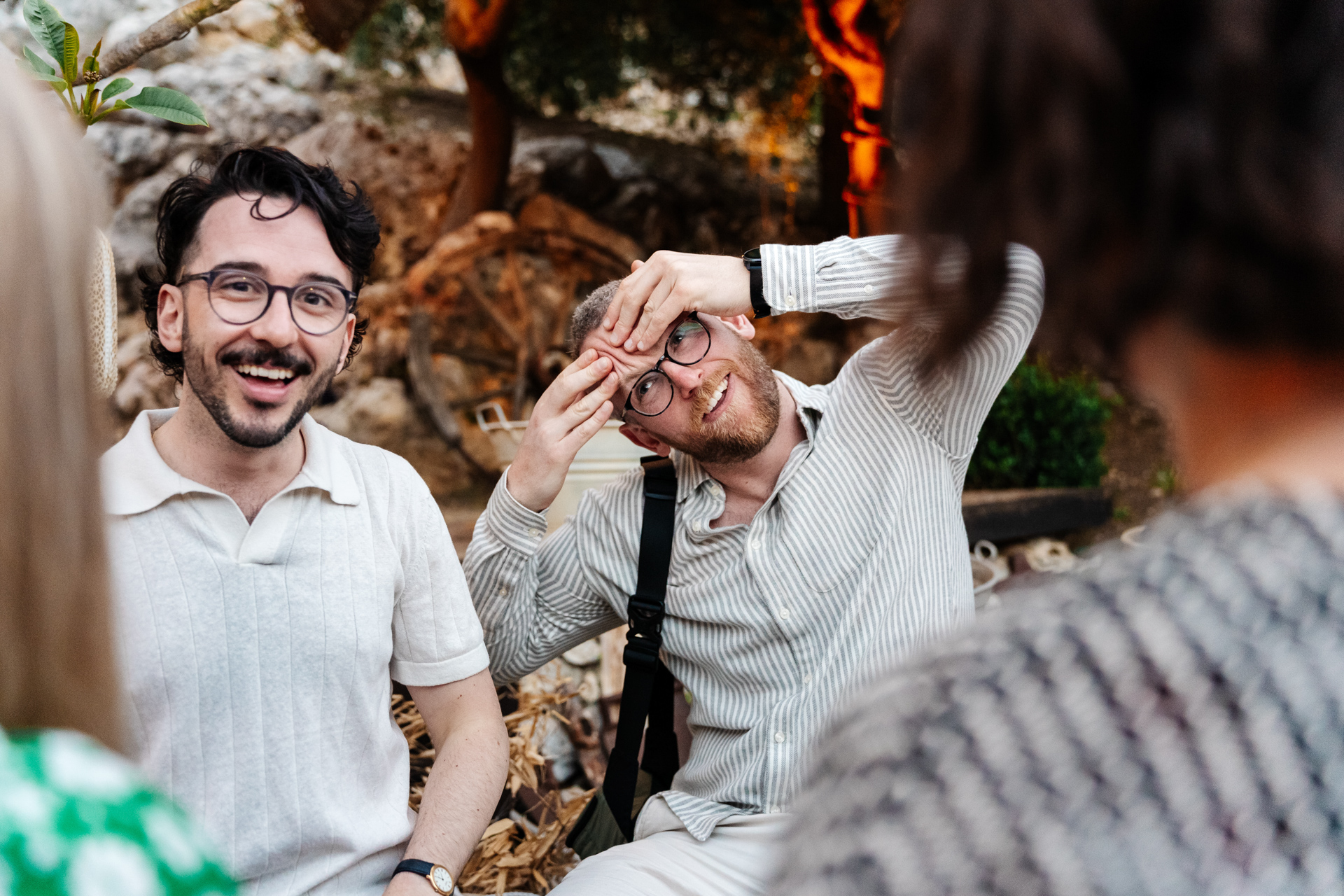 The dinner is set up in the gorgeous fair light ambient courtyard outside the small stone church. The couple had their fab podcaster host friends as MCs, who opened the dinner with a funny song they’d written. N surprised all the guests by having a mid wedding hair cut! Going into a fresh loose wavy bob for the dinner and evening party. The guests had scratch cards for their wedding favours and local hand painted tiles. They had a lot of stunning custom items like their wedding logo embroidered on all the napkins.