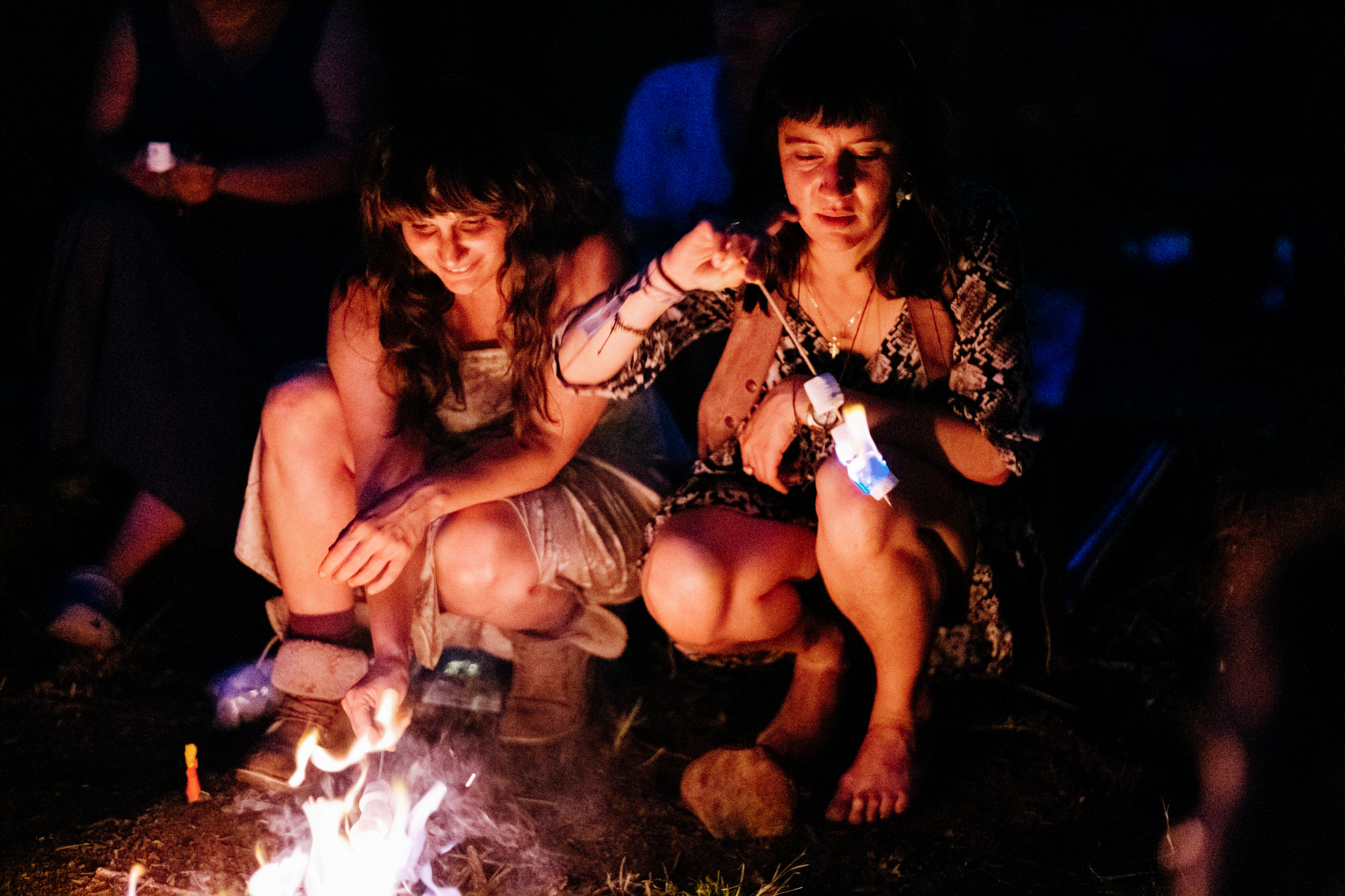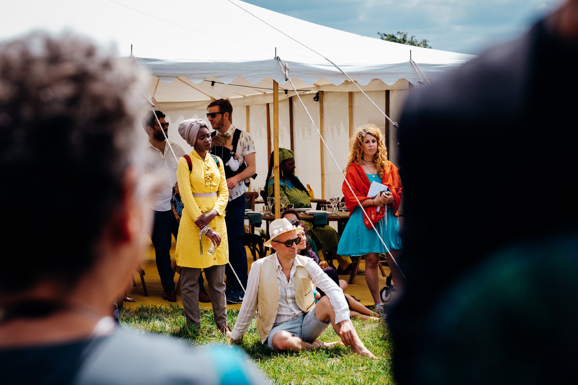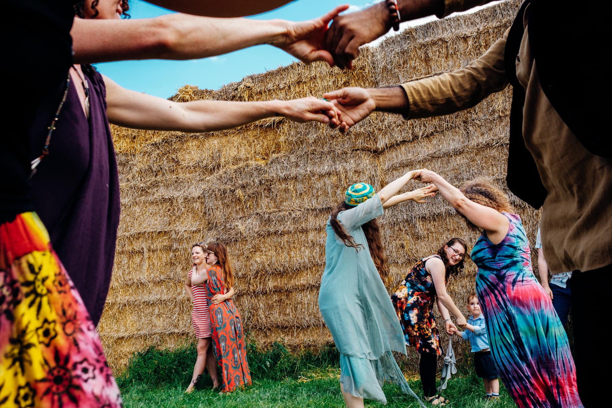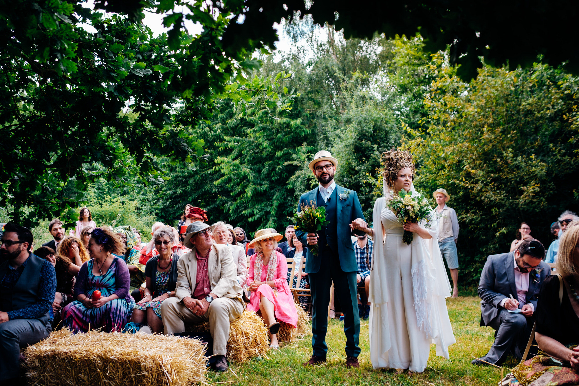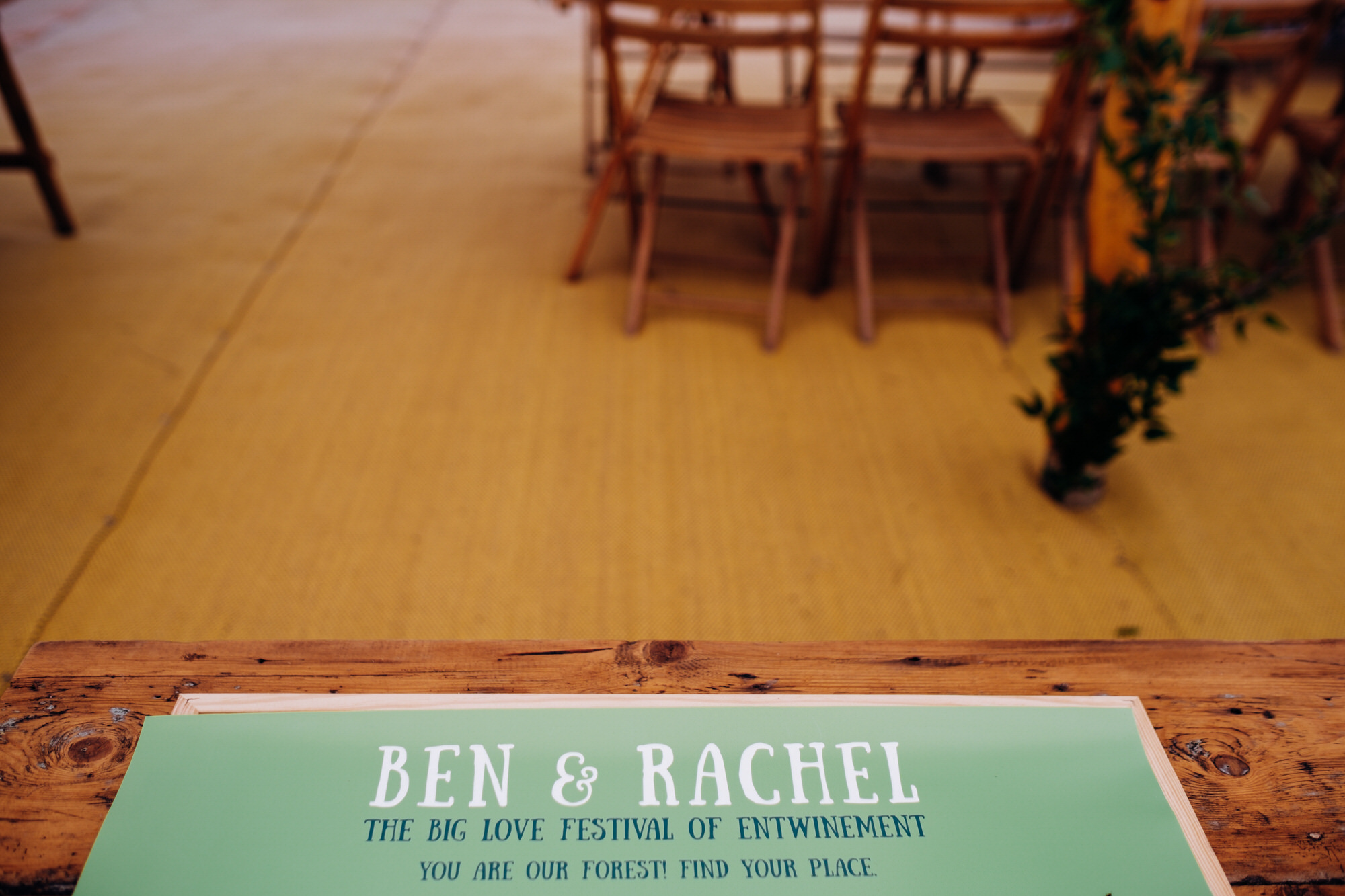 I was absolutely delighted to shoot for this couple, having photographed the bride several times before as a celebrant and wedding guest, and even more excited when I heard about their incredibly unique plans. Rachel is a storyteller who works on the festival circuit, so it was fitting that Ben and Rachel chose to really customise their entire bohemian wedding festival. For them, the wedding started from the day before, when a handful of their close friends and family joined them to help set up the DIY elements of their wedding. Their friends and family helped them to make colourful fabric bunting and put up the signposts. Wildstems created their beautiful rustic floristry for the tables. Their caterers Red Moon Roots were an integral part of the wedding, staying on site with us and providing nourishment throughout, including watermelon breaks between learning the songs for the main ceremony day. We were blessed with incredible perfect weather as we set up our tents and worked until it was dinner time served around the campfire. Ben and Rachel also arranged for a surprise ice cream van to treat their friends and family and surprise vegan marshmallows for the evening campfire.