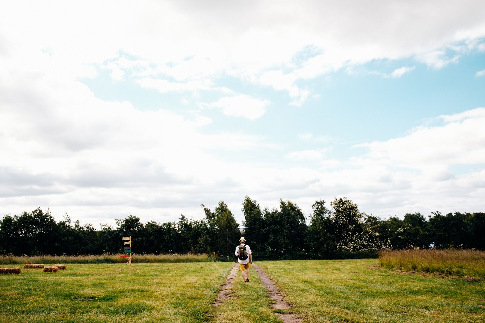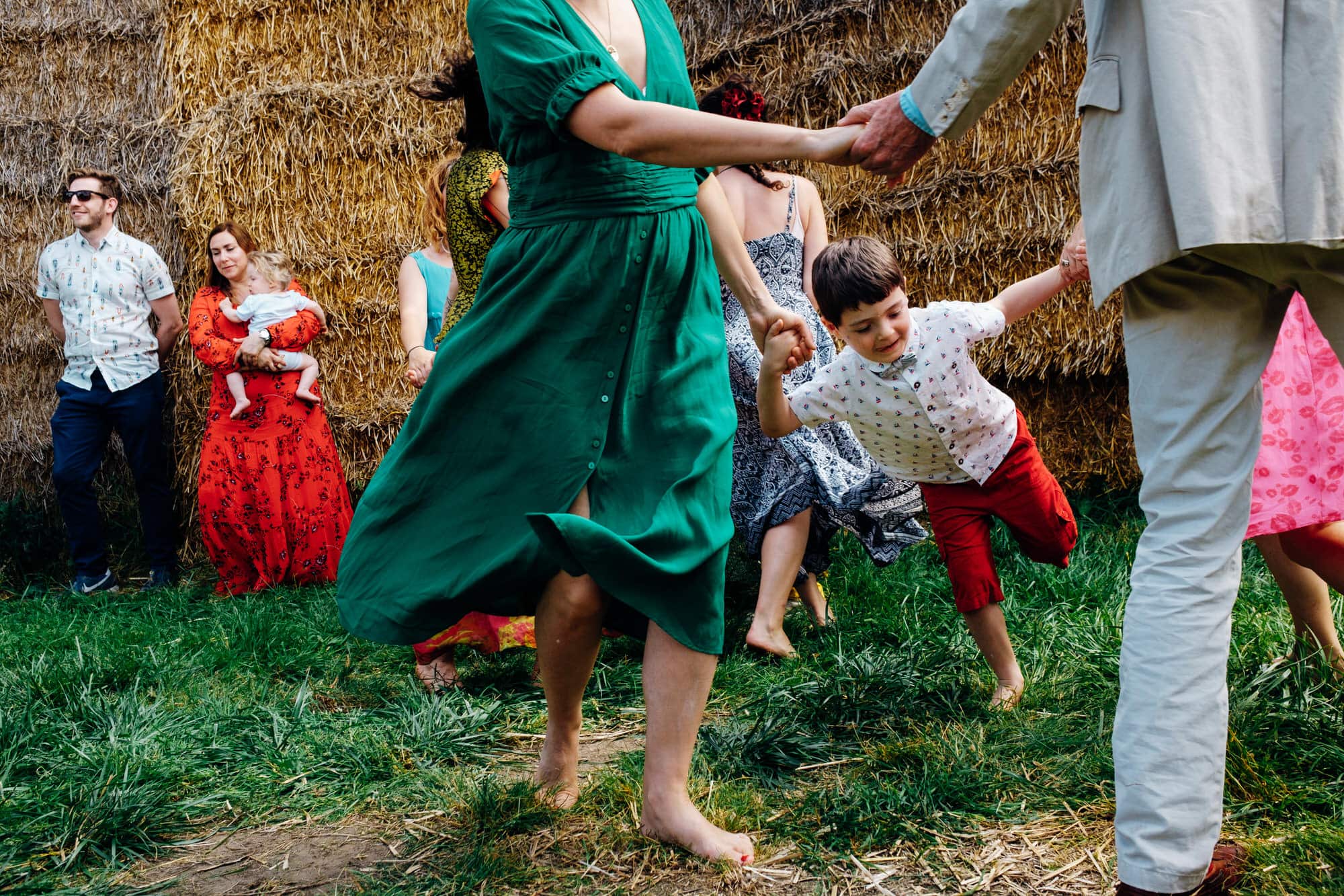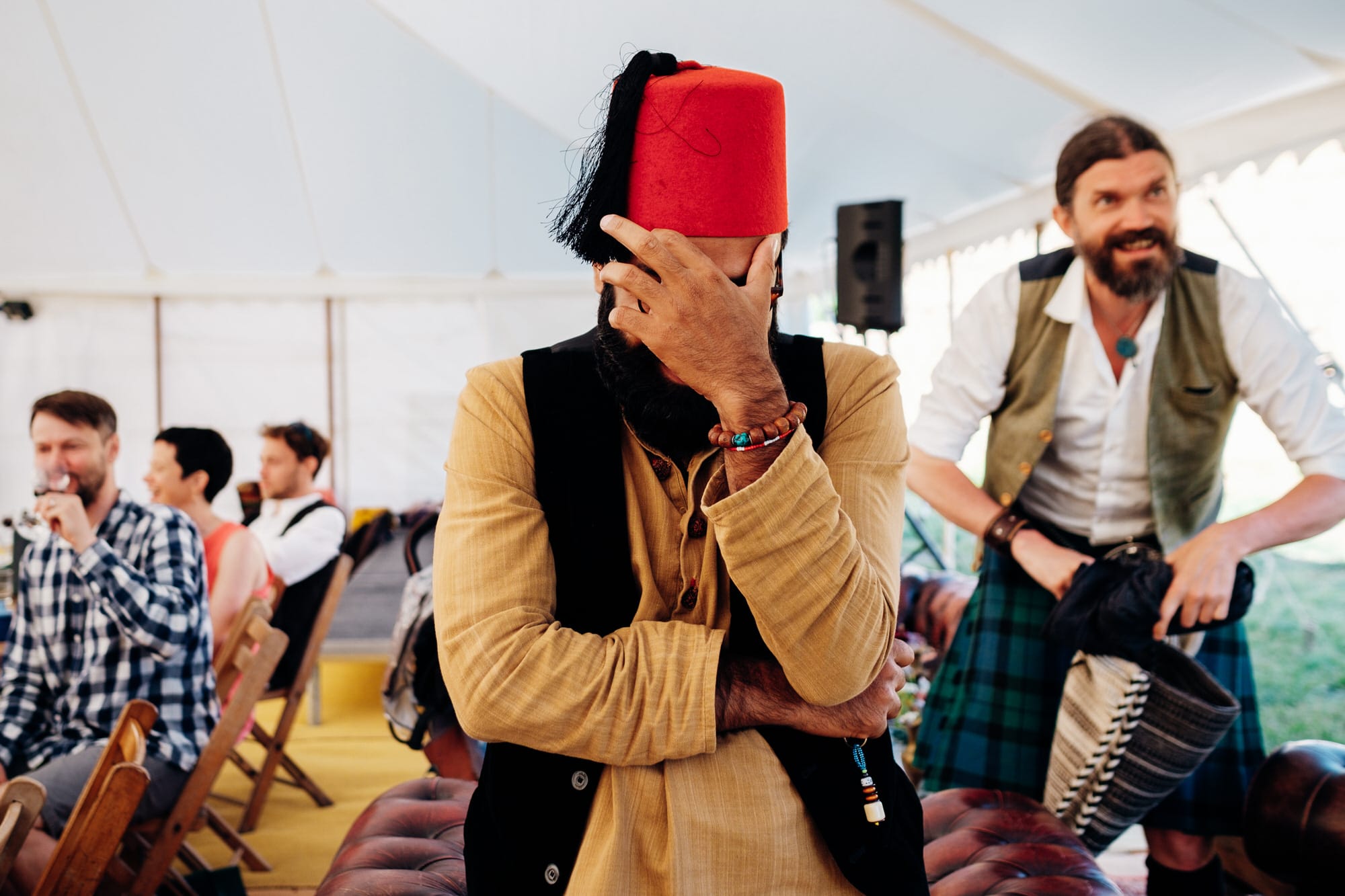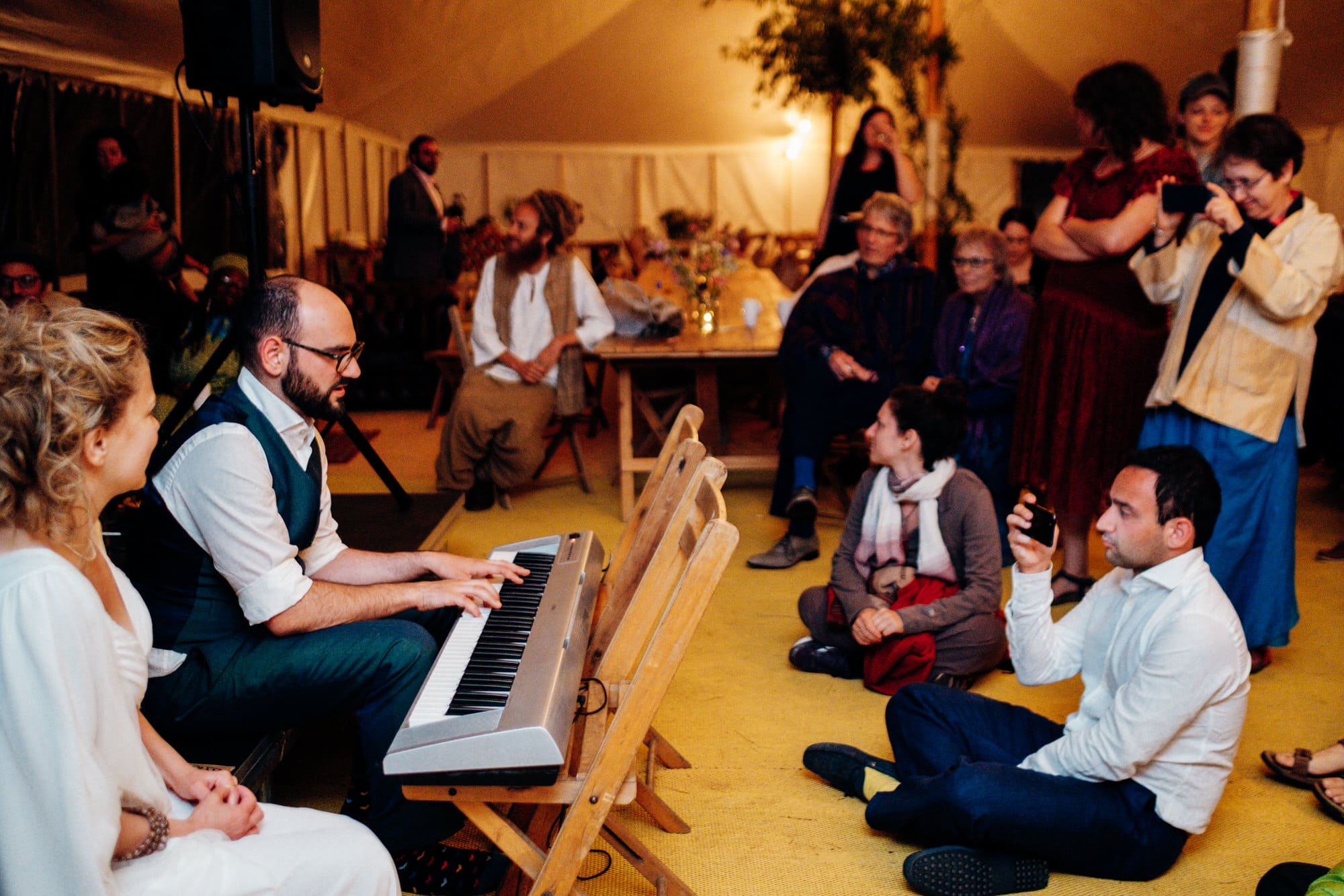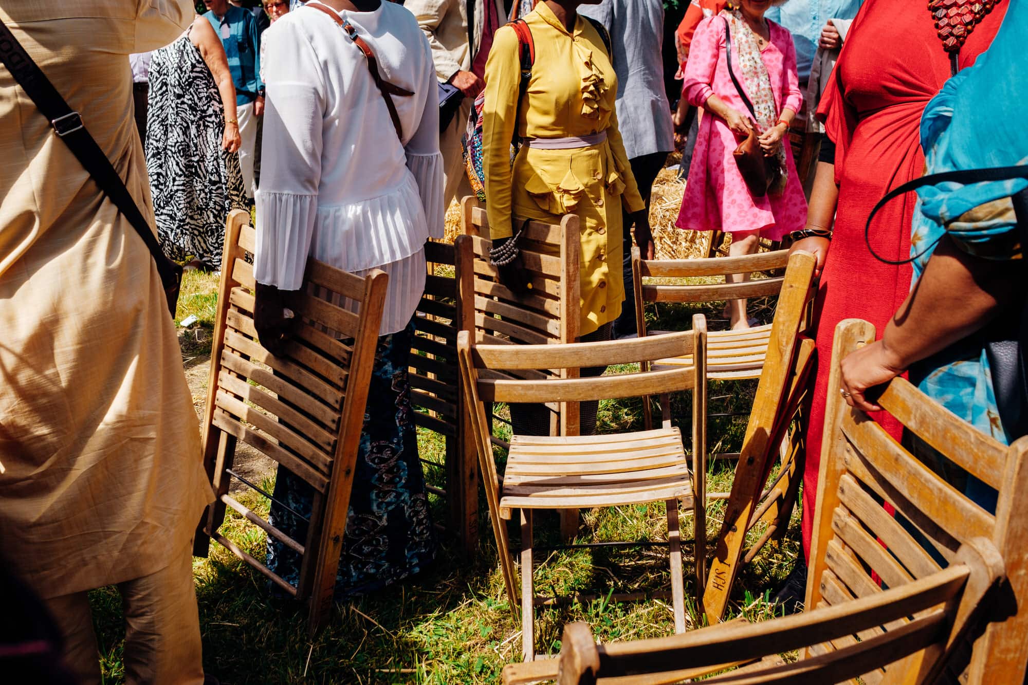 I was absolutely delighted to shoot for this couple, having photographed the bride several times before as a celebrant and wedding guest, and even more excited when I heard about their incredibly unique plans. Rachel is a storyteller who works on the festival circuit, so it was fitting that Ben and Rachel chose to really customise their entire bohemian wedding festival. For them, the wedding started from the day before, when a handful of their close friends and family joined them to help set up the DIY elements of their wedding. Their friends and family helped them to make colourful fabric bunting and put up the signposts. Wildstems created their beautiful rustic floristry for the tables. Their caterers Red Moon Roots were an integral part of the wedding, staying on site with us and providing nourishment throughout, including watermelon breaks between learning the songs for the main ceremony day. We were blessed with incredible perfect weather as we set up our tents and worked until it was dinner time served around the campfire. Ben and Rachel also arranged for a surprise ice cream van to treat their friends and family and surprise vegan marshmallows for the evening campfire.