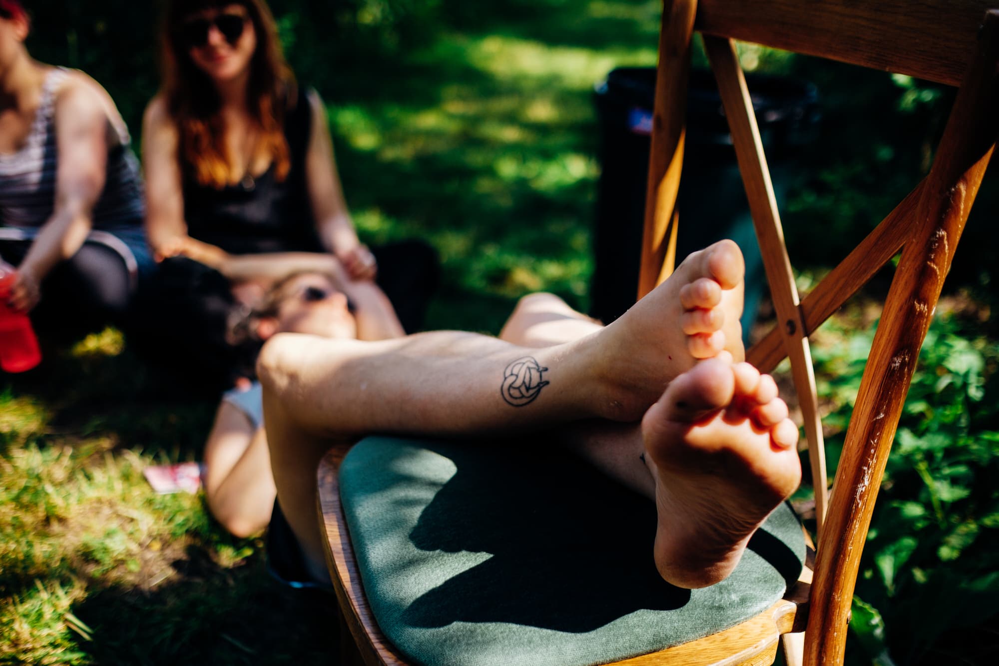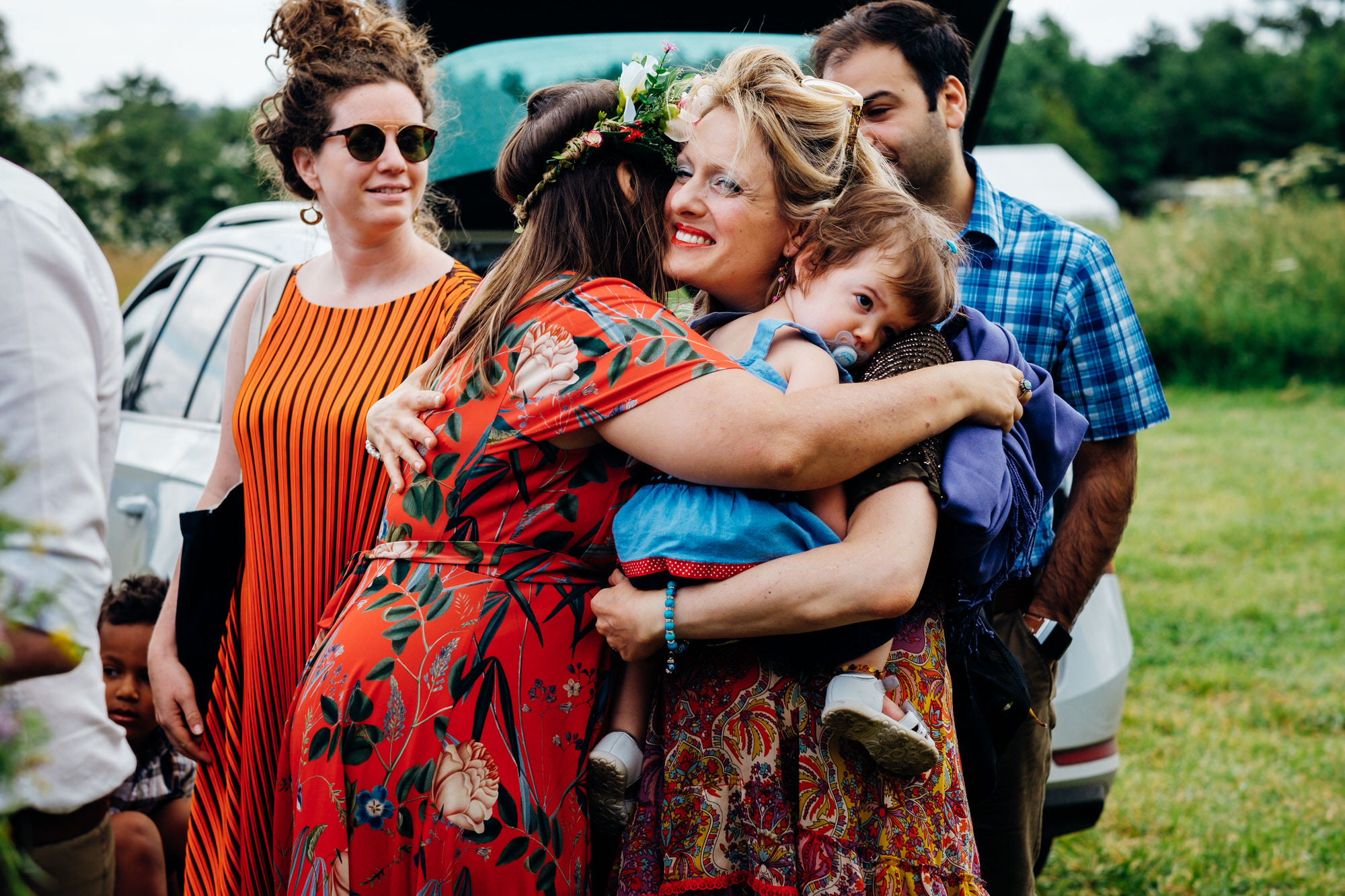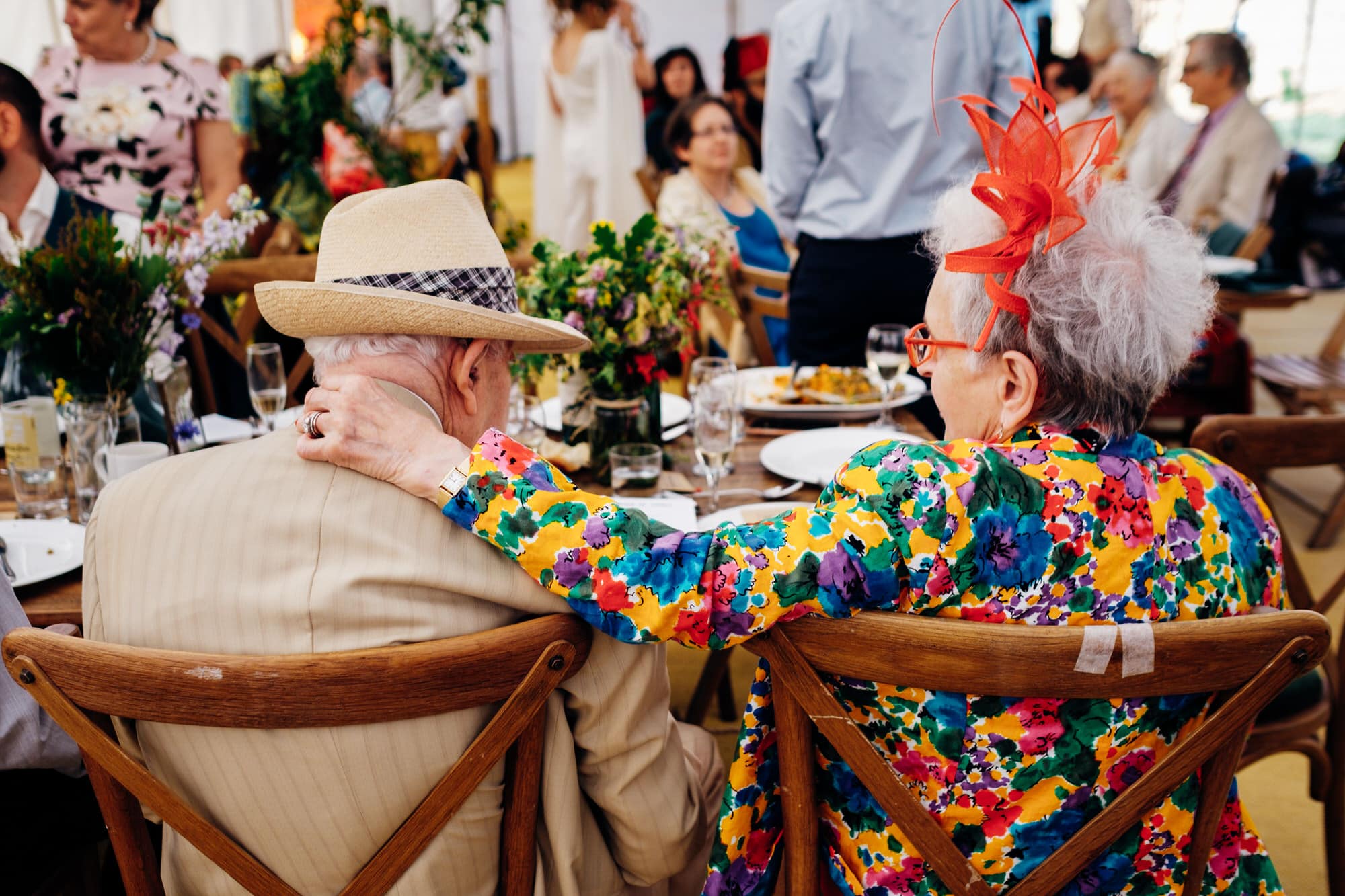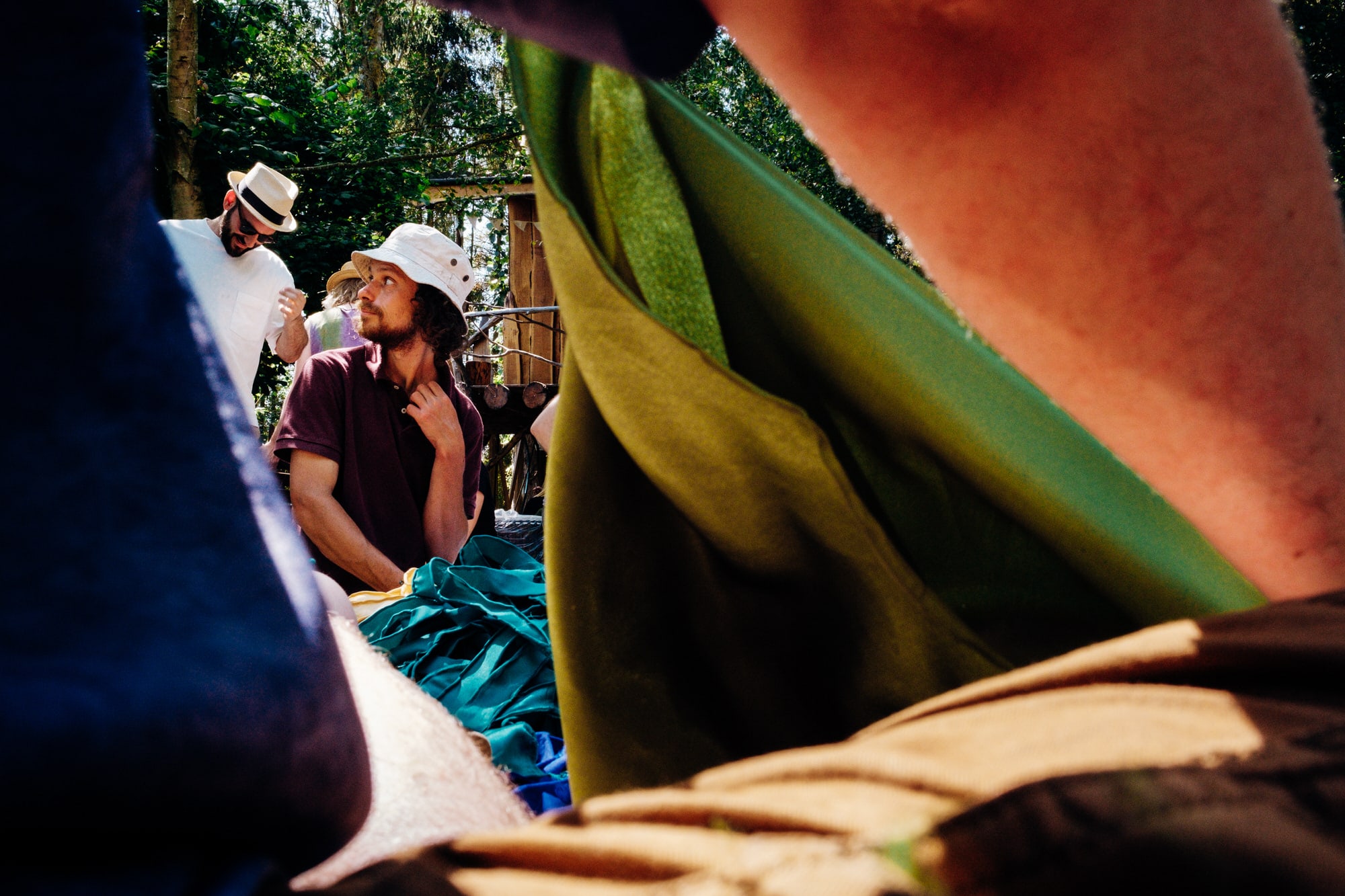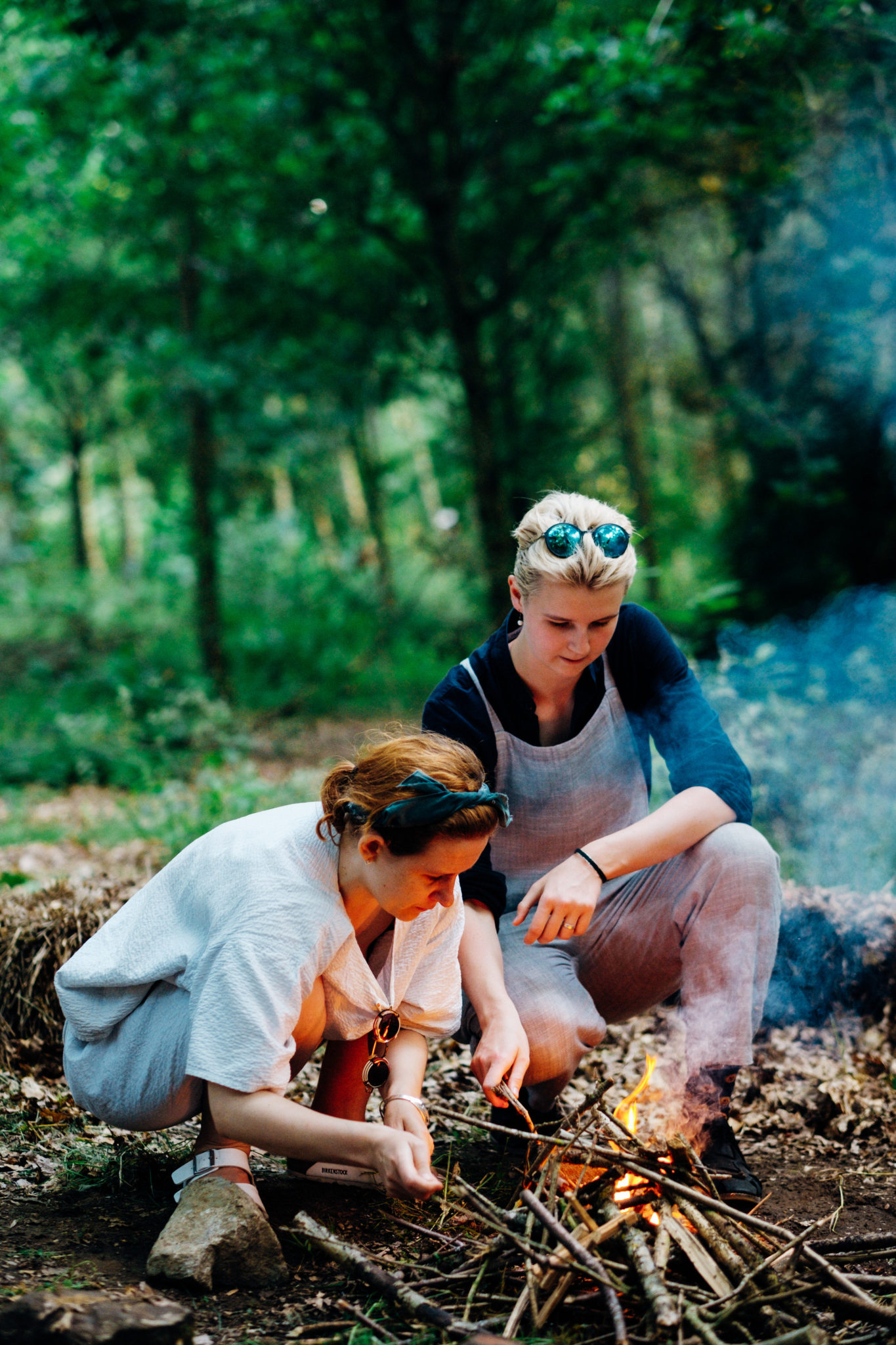 I was absolutely delighted to shoot for this couple, having photographed the bride several times before as a celebrant and wedding guest, and even more excited when I heard about their incredibly unique plans. Rachel is a storyteller who works on the festival circuit, so it was fitting that Ben and Rachel chose to really customise their entire bohemian wedding festival. For them, the wedding started from the day before, when a handful of their close friends and family joined them to help set up the DIY elements of their wedding. Their friends and family helped them to make colourful fabric bunting and put up the signposts. Wildstems created their beautiful rustic floristry for the tables. Their caterers Red Moon Roots were an integral part of the wedding, staying on site with us and providing nourishment throughout, including watermelon breaks between learning the songs for the main ceremony day. We were blessed with incredible perfect weather as we set up our tents and worked until it was dinner time served around the campfire. Ben and Rachel also arranged for a surprise ice cream van to treat their friends and family and surprise vegan marshmallows for the evening campfire.