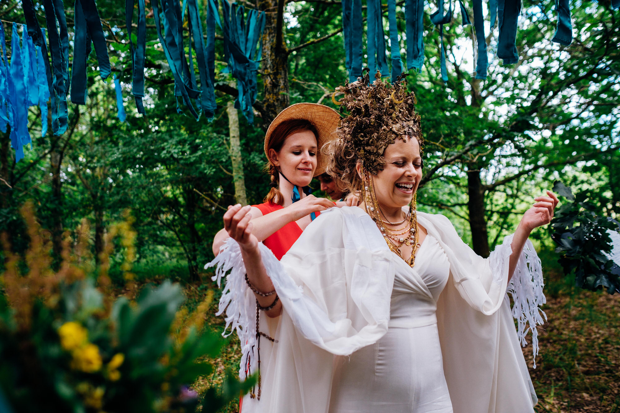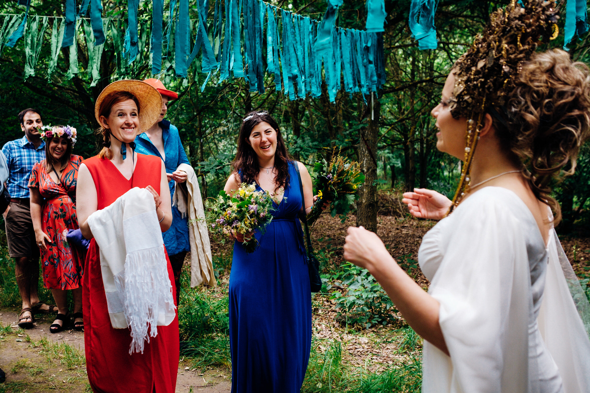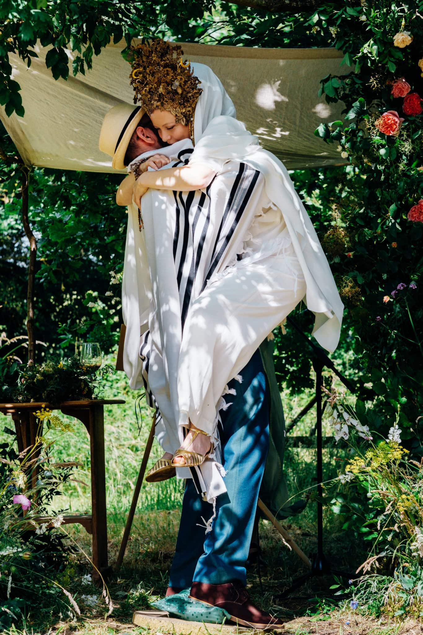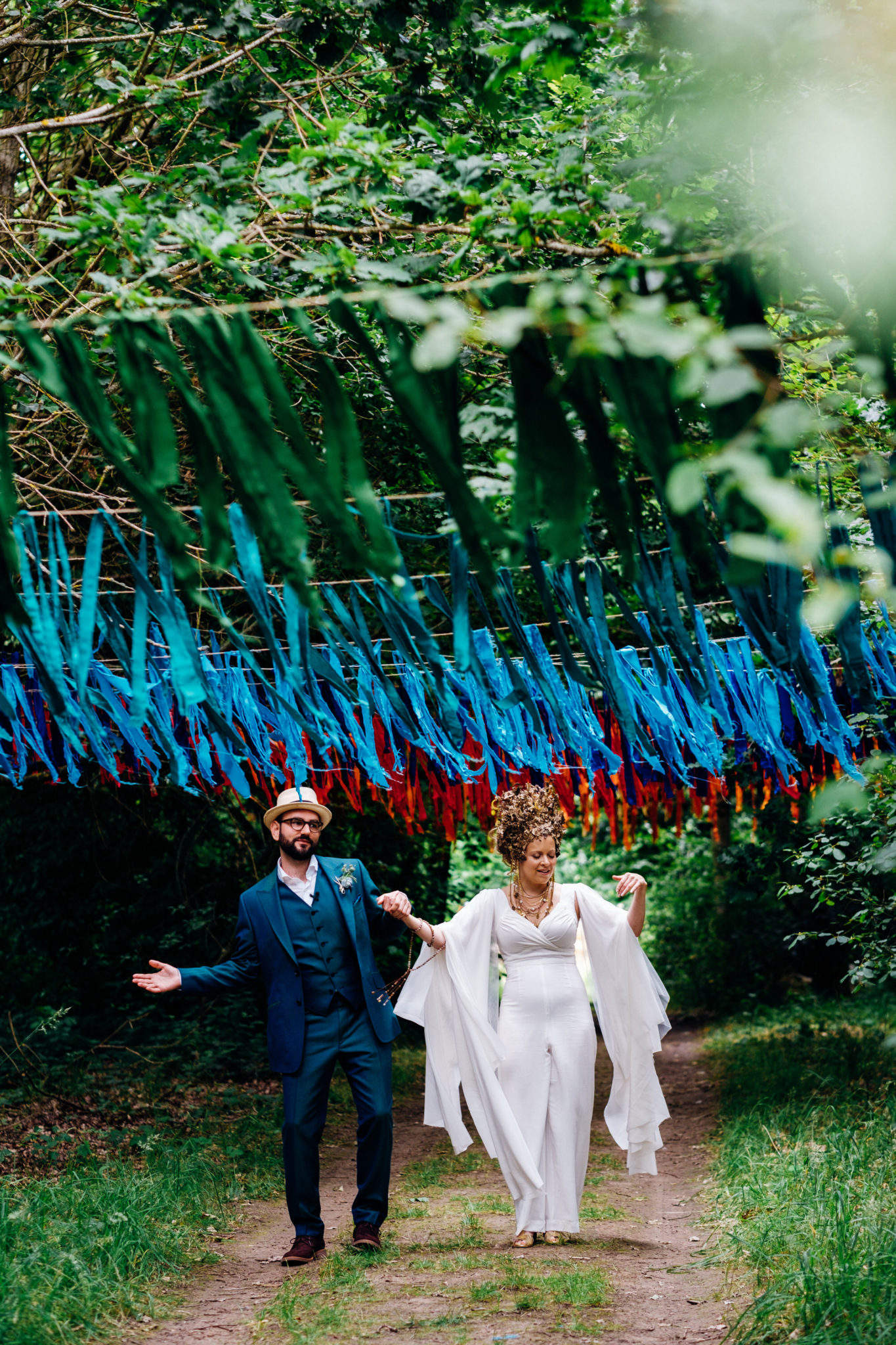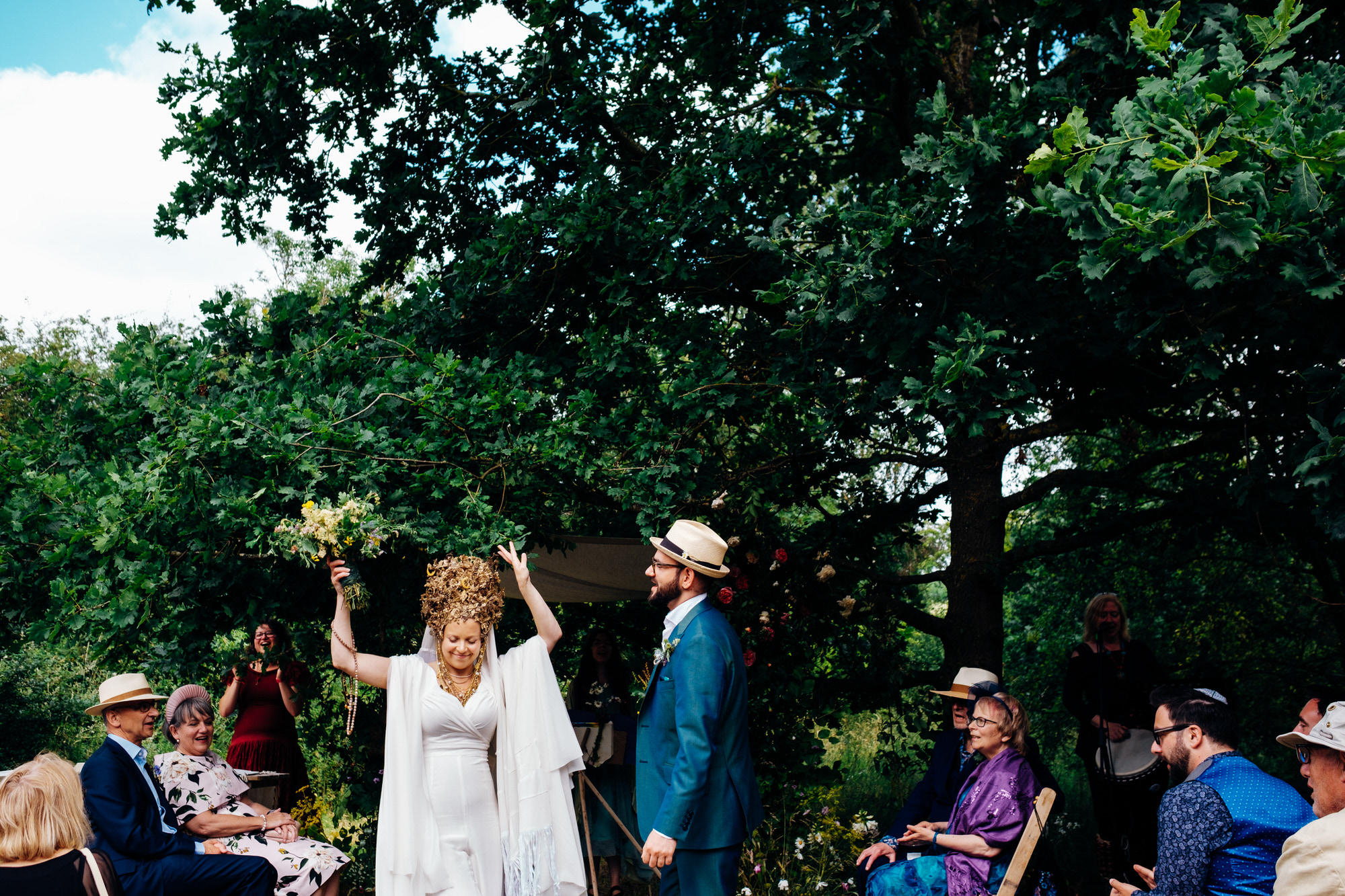 Ben wore a brilliant dark teal suit whilst Rachel wore a white jumpsuit made by a friend and epic golden headdress decorated with moons and hamsas, inspired by traditional Jewish headdress and custom made by Isla Campbell. Their ceremony consisted on many unique touches. They used an “entwine mobile” to take family to the ceremonial tree, they were led in a song and dance processional to meet the couple half way up the path to all continue to the outdoor ceremony space. When they met half way along the path, Rachel wore a ceremonial garment which guests has tied prayers to beforehand. The ceremony itself took place under a gorgeous Chuppah created amongst the tree itself, and the couple did several Jewish wedding traditions such as smashing the glass, reading the ketubah and circling each other.