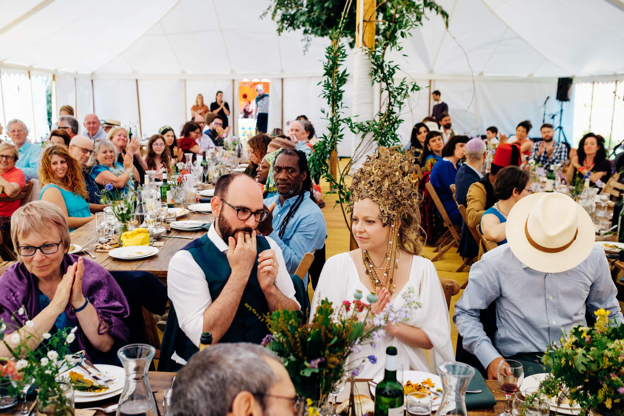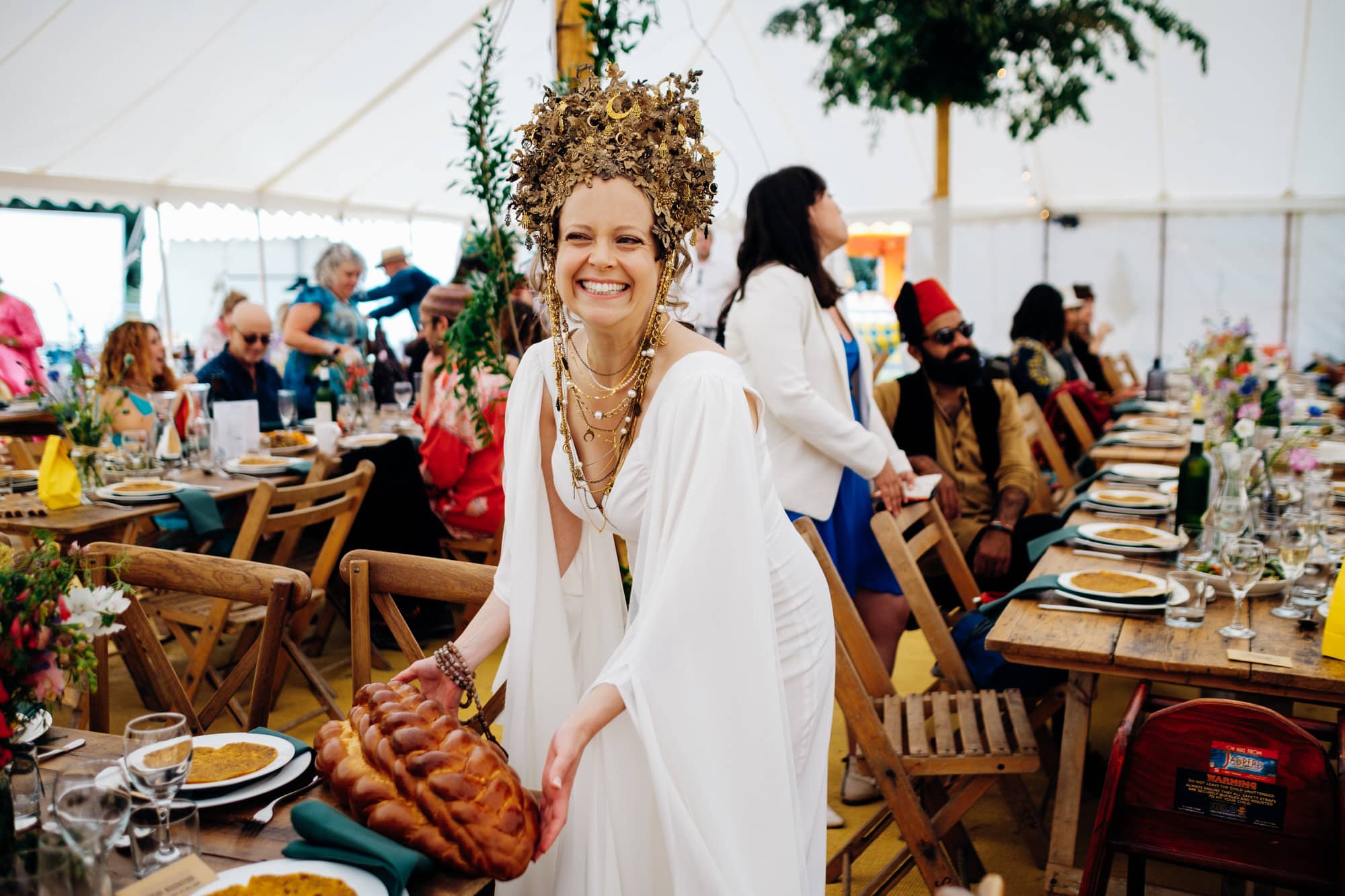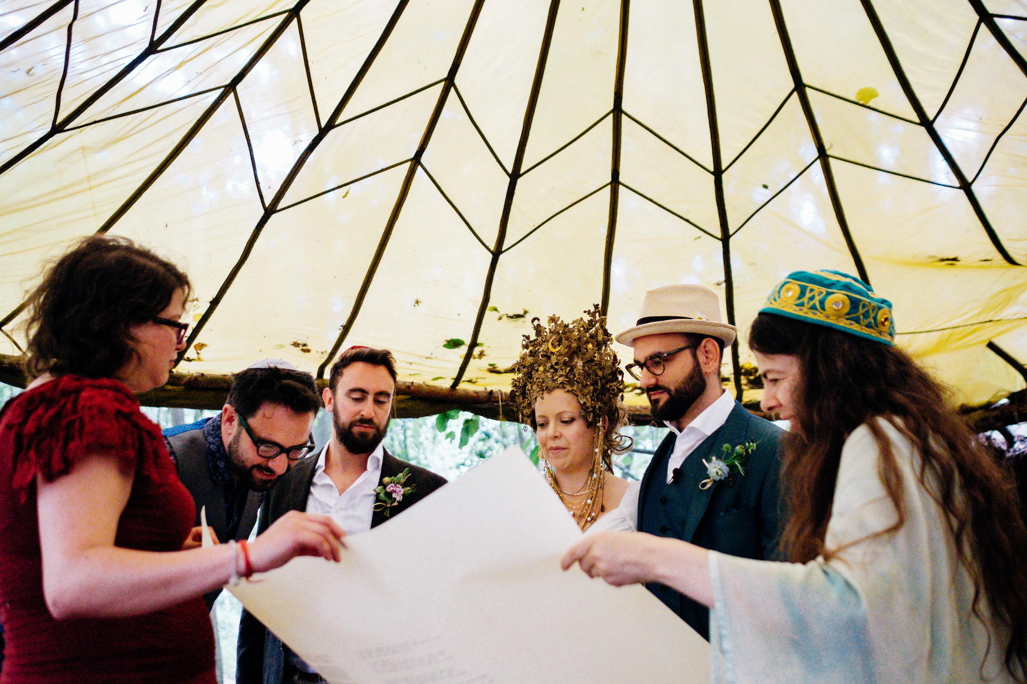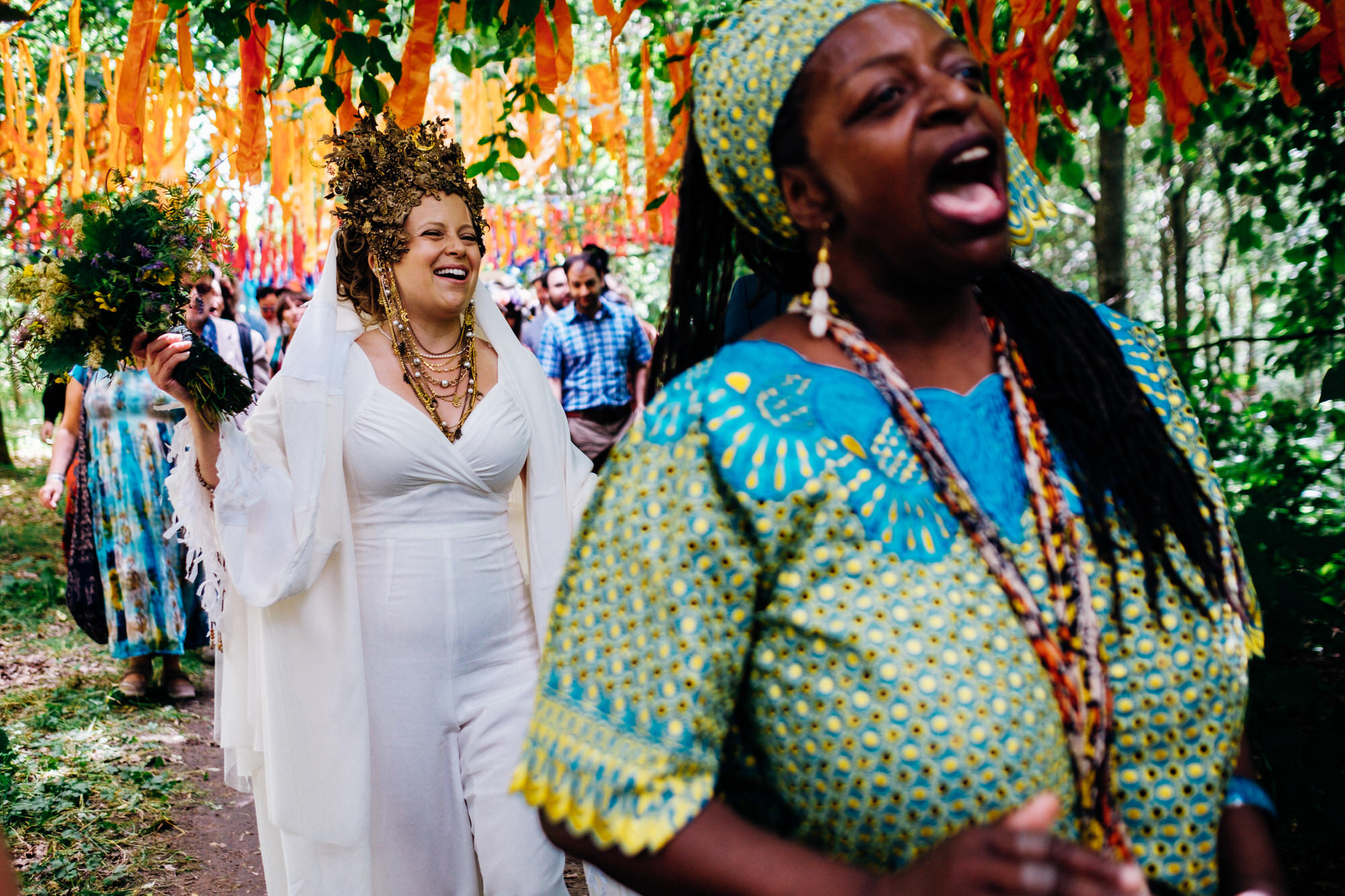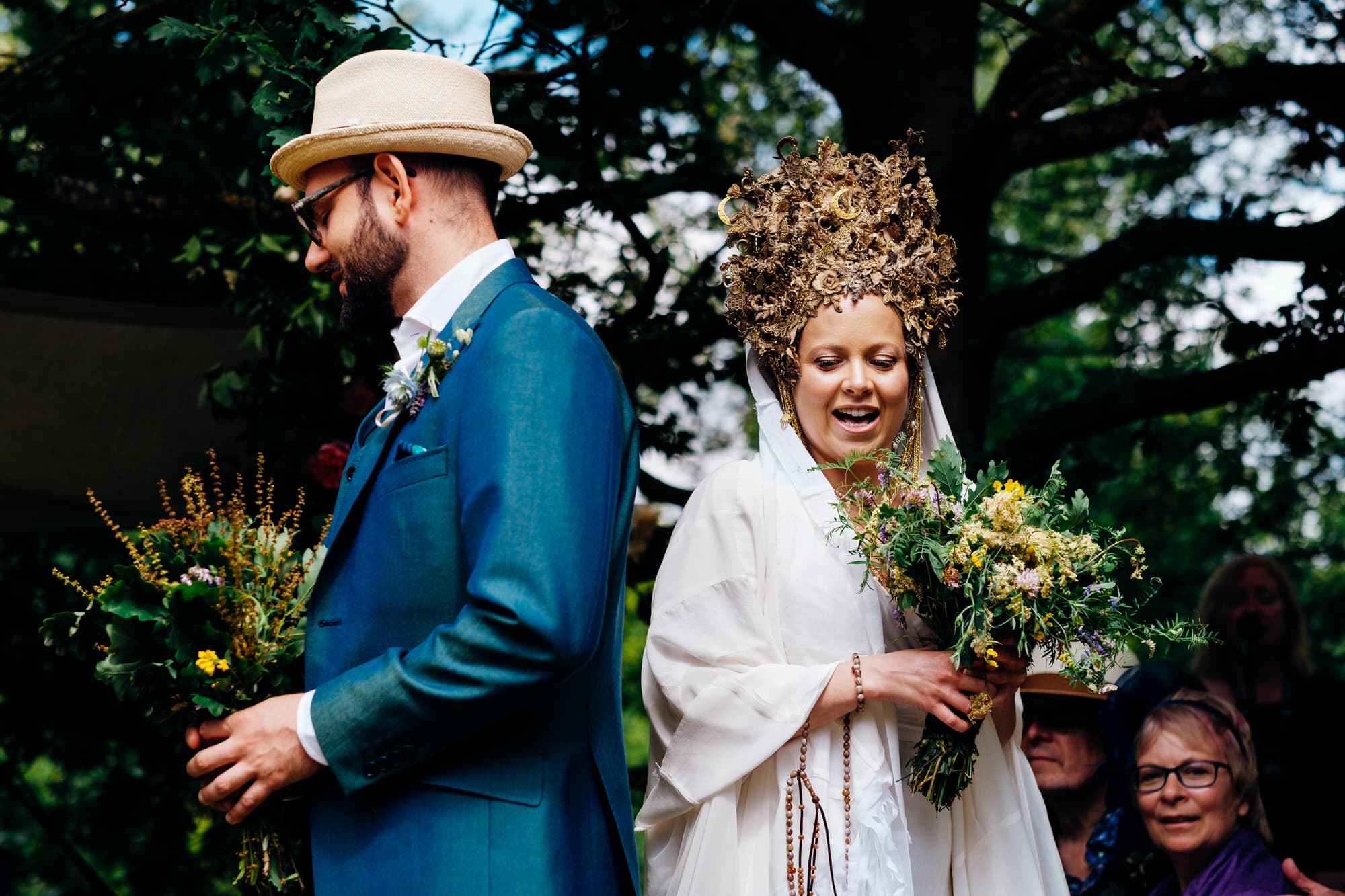 Ben wore a brilliant dark teal suit whilst Rachel wore a white jumpsuit made by a friend and epic golden headdress decorated with moons and hamsas, inspired by traditional Jewish headdress and custom made by Isla Campbell. Their ceremony consisted on many unique touches. They used an “entwine mobile” to take family to the ceremonial tree, they were led in a song and dance processional to meet the couple half way up the path to all continue to the outdoor ceremony space. When they met half way along the path, Rachel wore a ceremonial garment which guests has tied prayers to beforehand. The ceremony itself took place under a gorgeous Chuppah created amongst the tree itself, and the couple did several Jewish wedding traditions such as smashing the glass, reading the ketubah and circling each other.