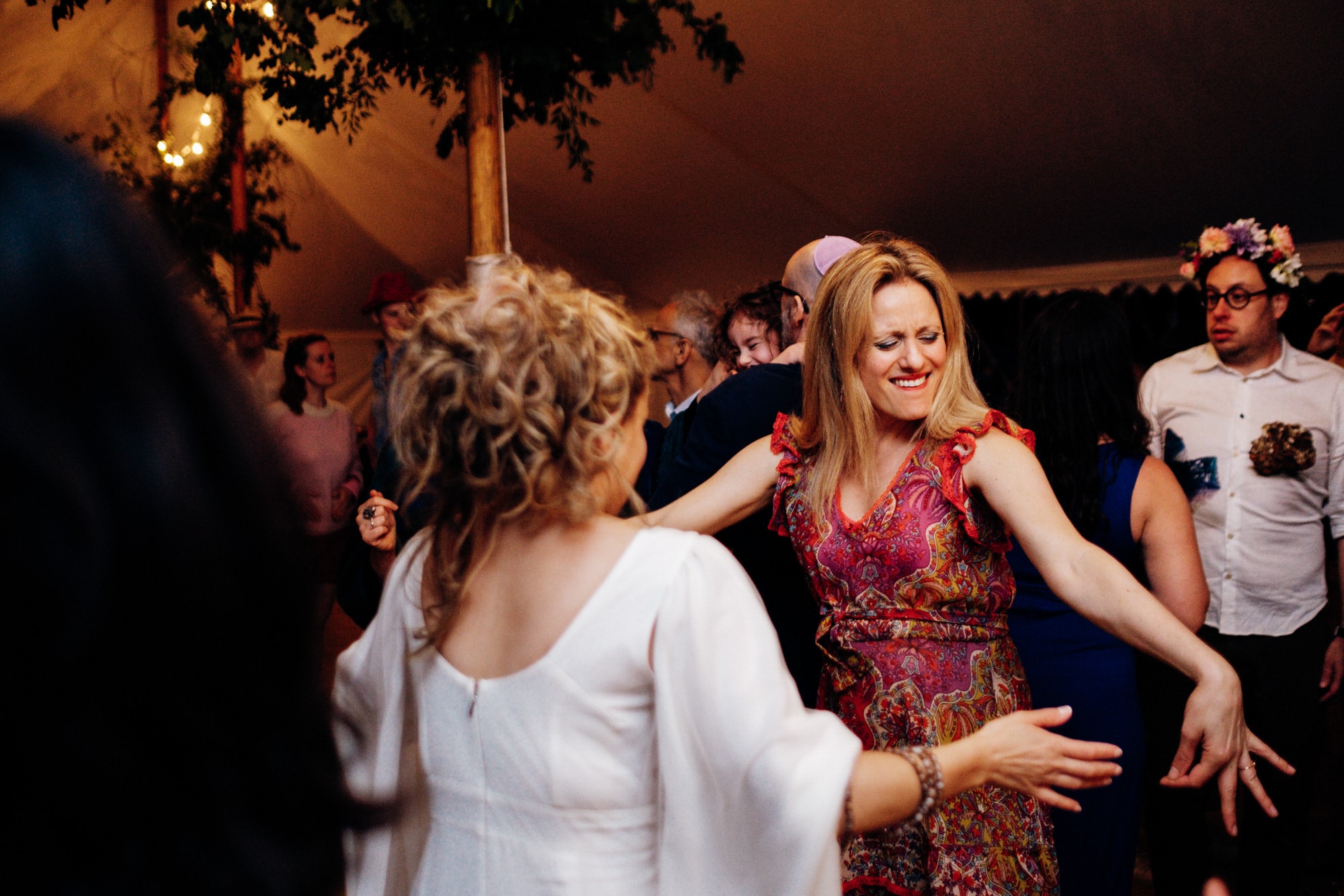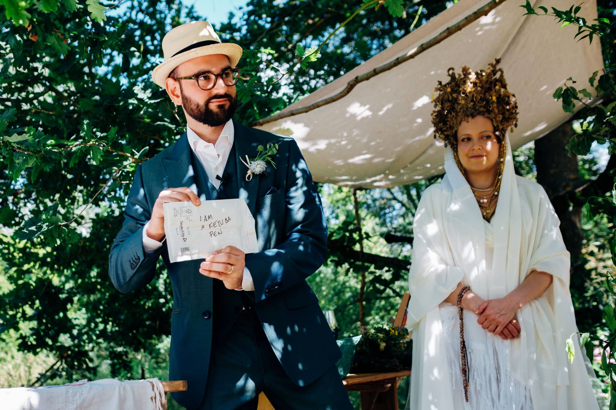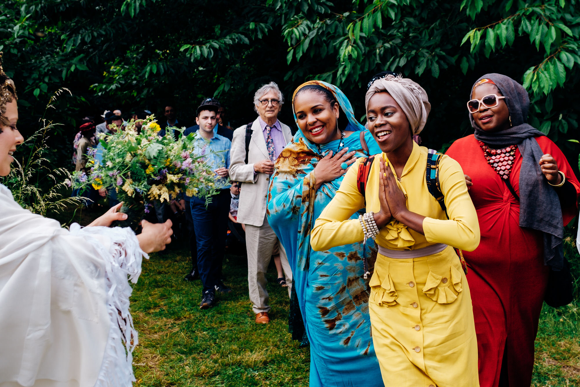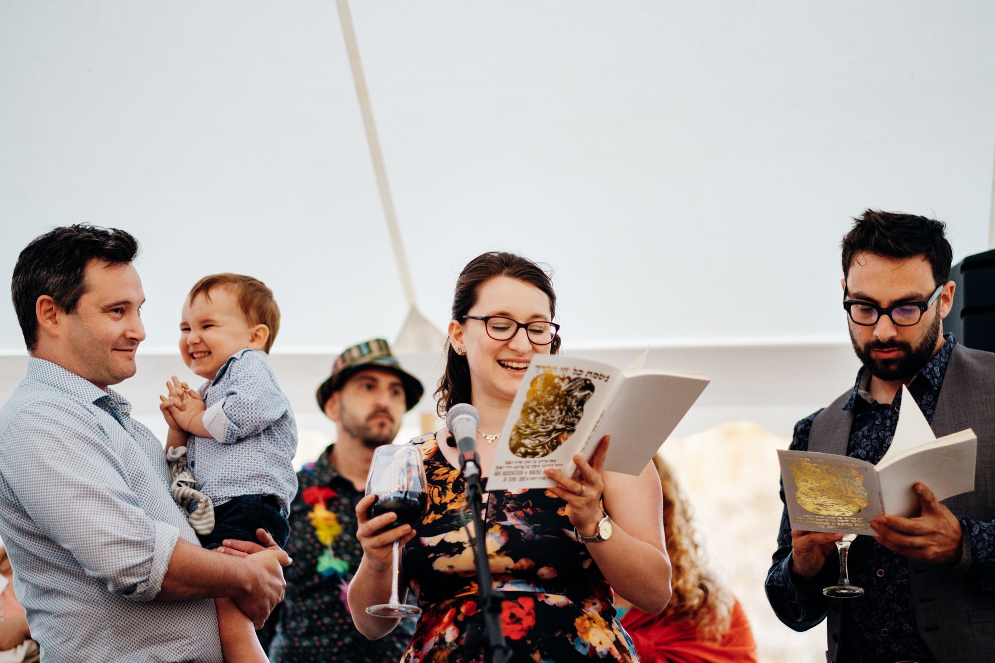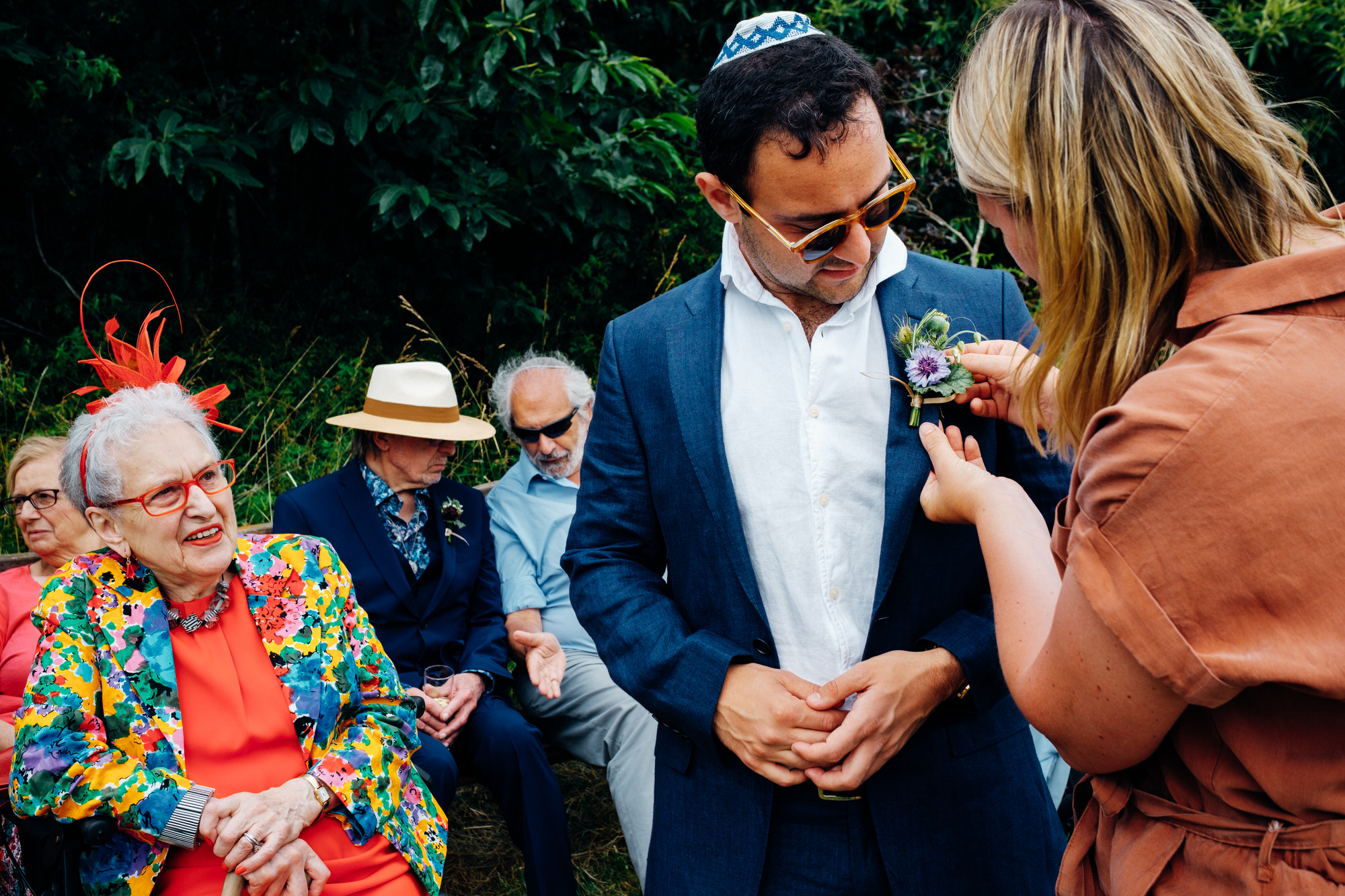 Ben wore a brilliant dark teal suit whilst Rachel wore a white jumpsuit made by a friend and epic golden headdress decorated with moons and hamsas, inspired by traditional Jewish headdress and custom made by Isla Campbell. Their ceremony consisted on many unique touches. They used an “entwine mobile” to take family to the ceremonial tree, they were led in a song and dance processional to meet the couple half way up the path to all continue to the outdoor ceremony space. When they met half way along the path, Rachel wore a ceremonial garment which guests has tied prayers to beforehand. The ceremony itself took place under a gorgeous Chuppah created amongst the tree itself, and the couple did several Jewish wedding traditions such as smashing the glass, reading the ketubah and circling each other.